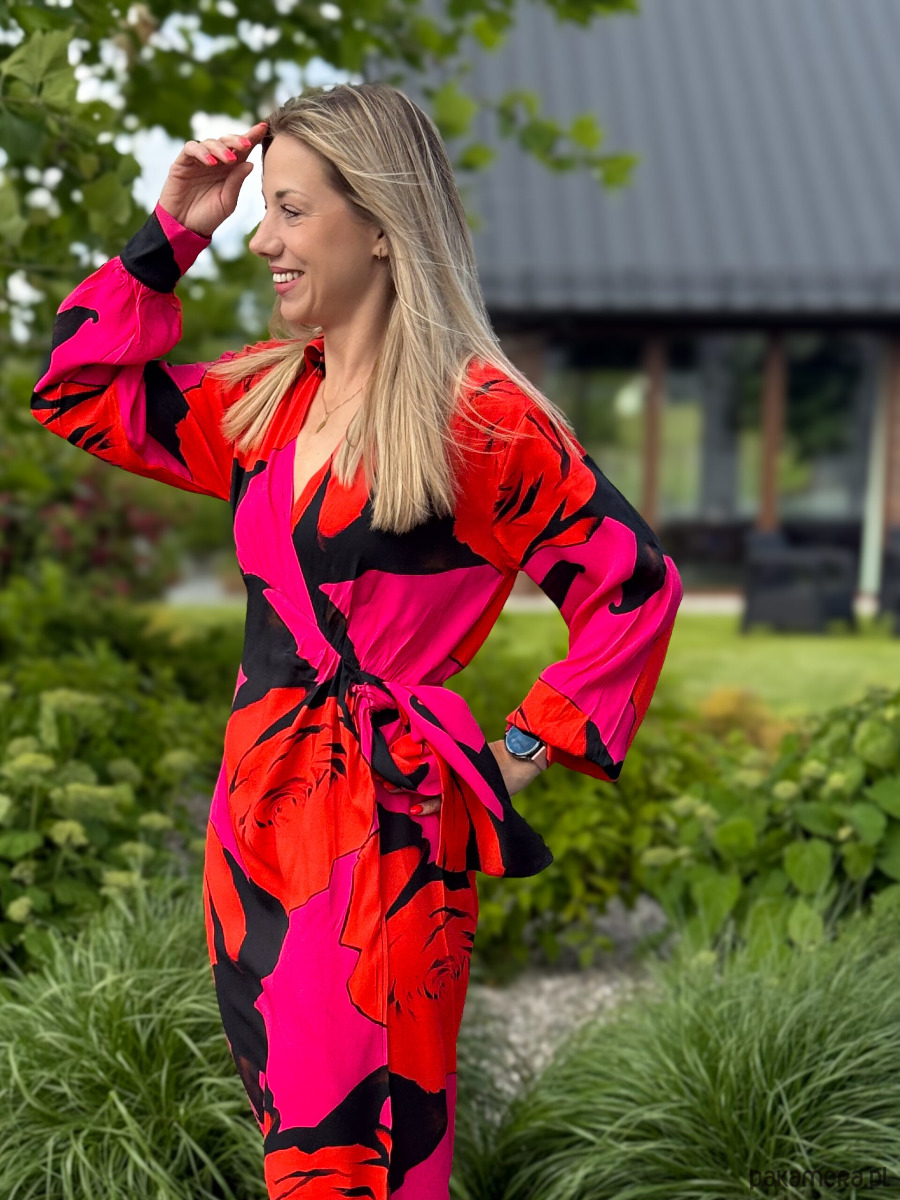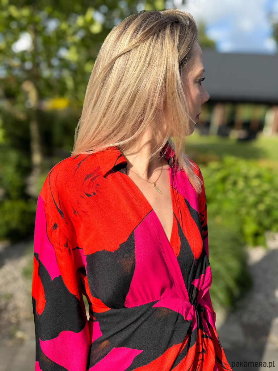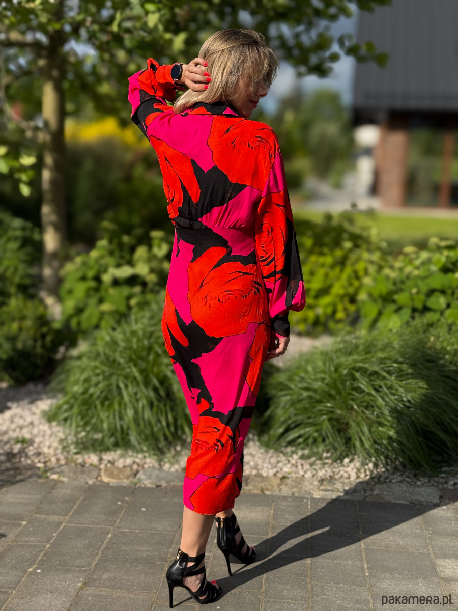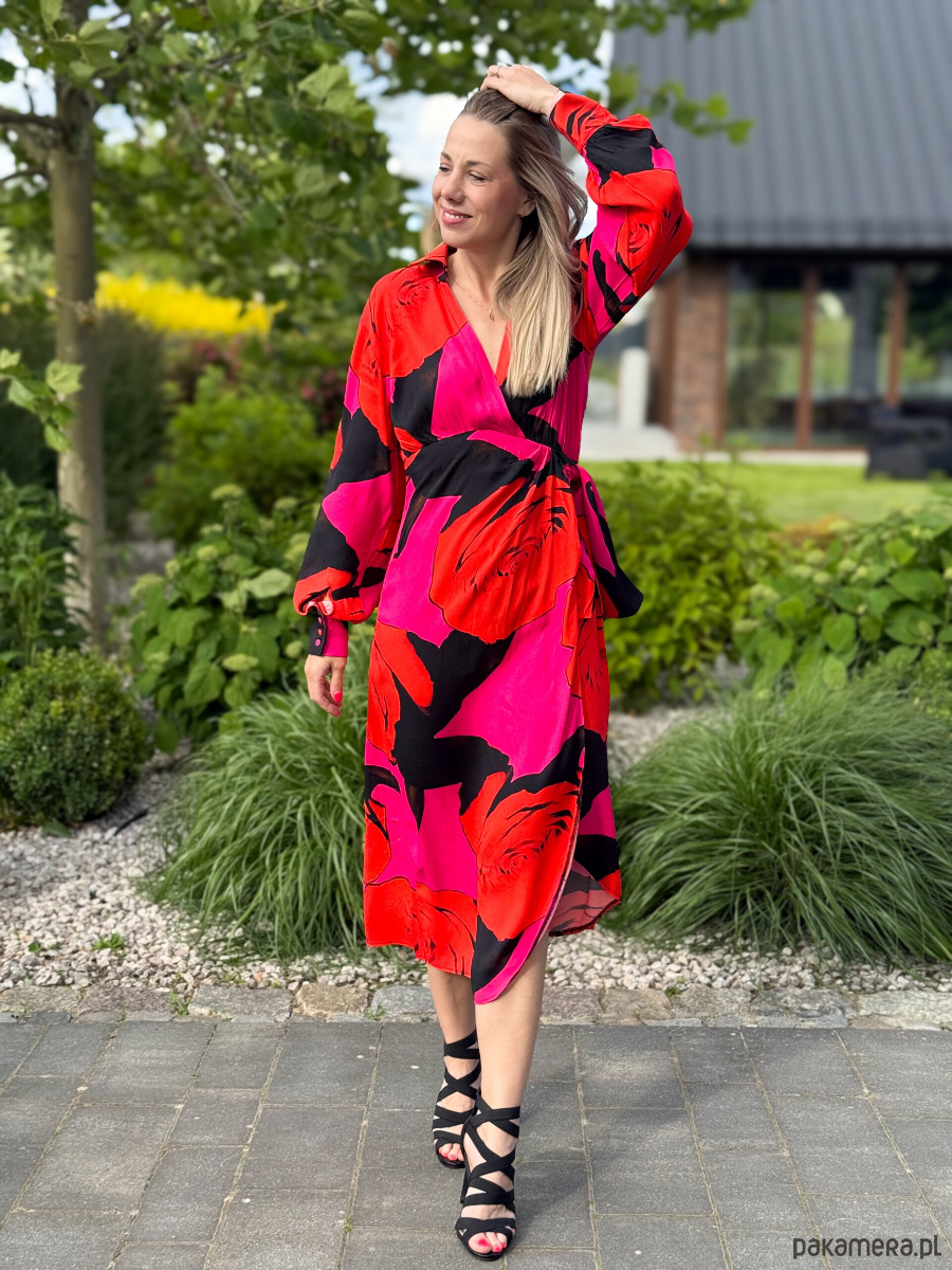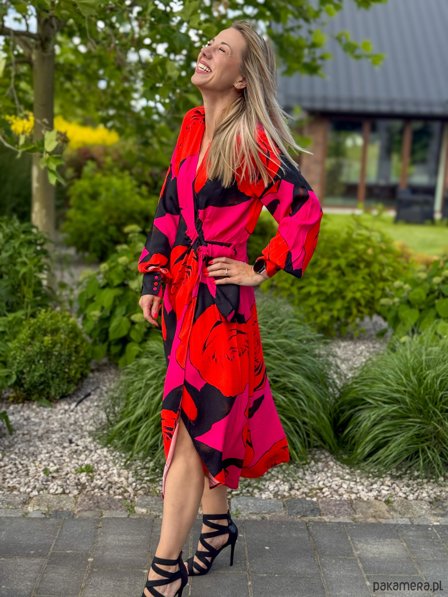 Kopertowy krój z paskiem w talii pięknie podkreśla sylwetkę, a długość midi oraz długie rękawy nadają jej elegancji. Energetyczny, kwiatowy print w odcieniach fuksji, pomarańczu, czerwieni i czerni przyciąga spojrzenia i dodaje charakteru każdej stylizacji.