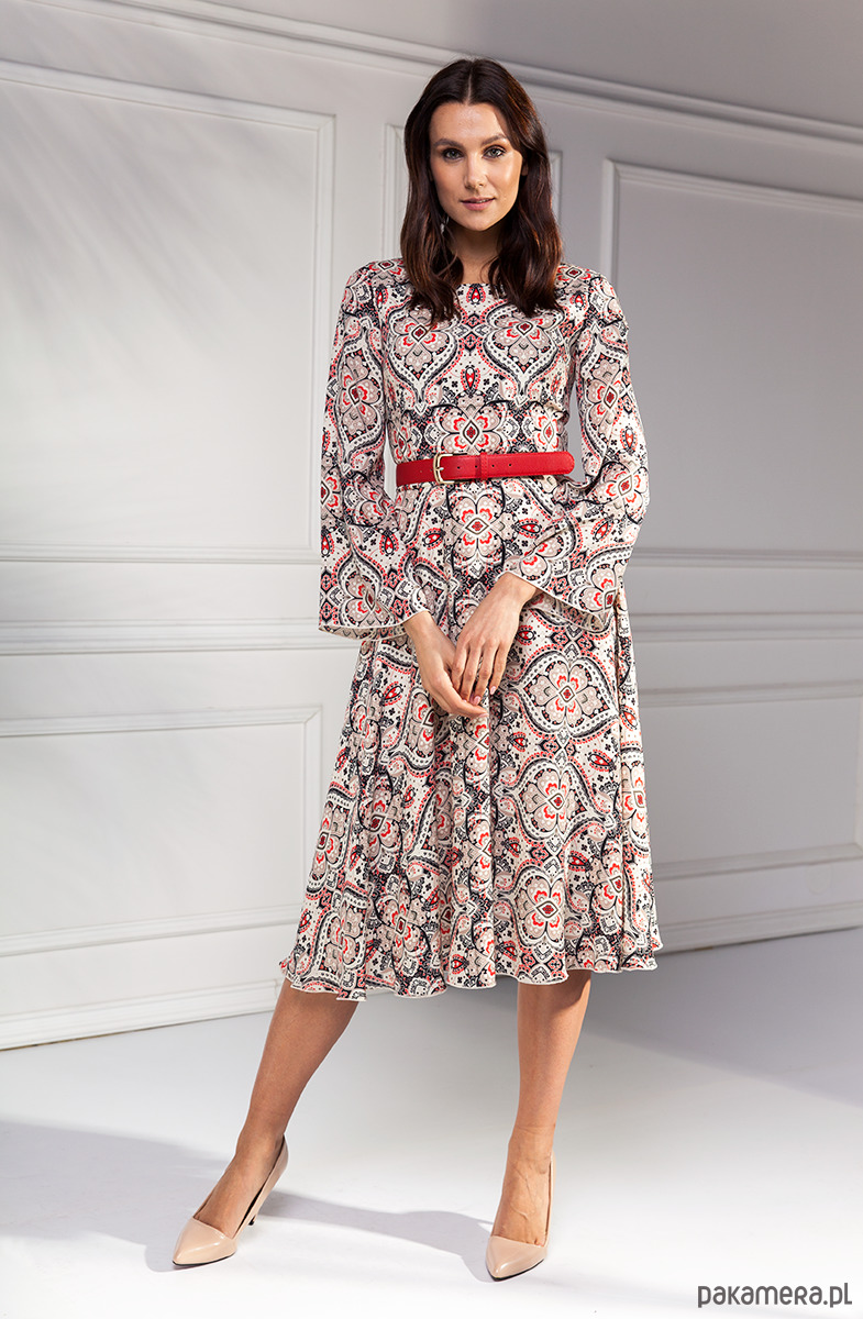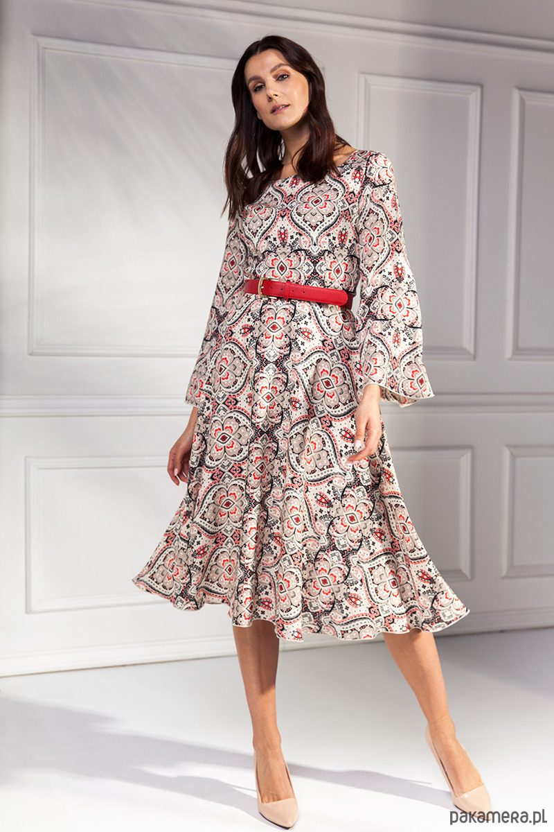 Sukienka midi z kolekcji Premium uszyta ze średniej grubości wzorzystej wiskozy na bawełnianej podszewce. Góra dopasowana, rękawy poszerzone na końcach. Dół z pół koła, lekki i zwiewny. Zamek kryty z tyłu długość od talii 75 cm. W sprzedaży bez paska.
