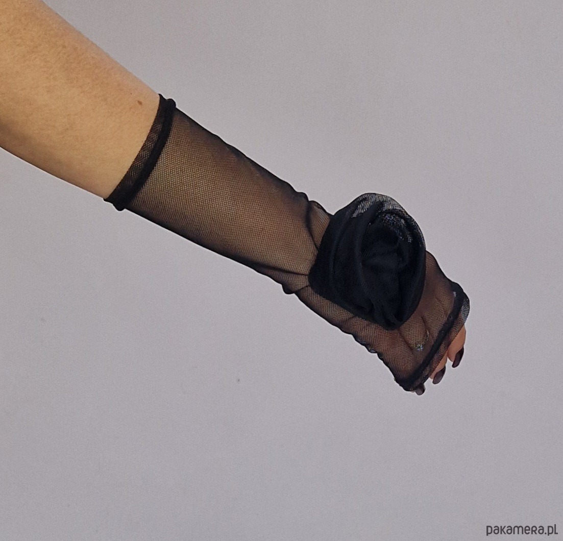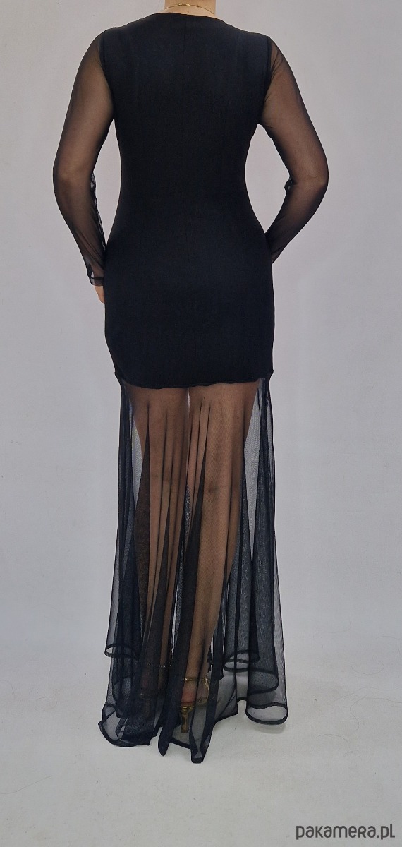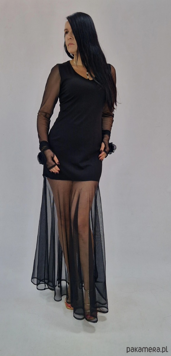 Przedstawiamy elegancką czarną sukienkę maxi z długim rękawem z transparentnej siateczki oraz efektownym tiulowym dołem.