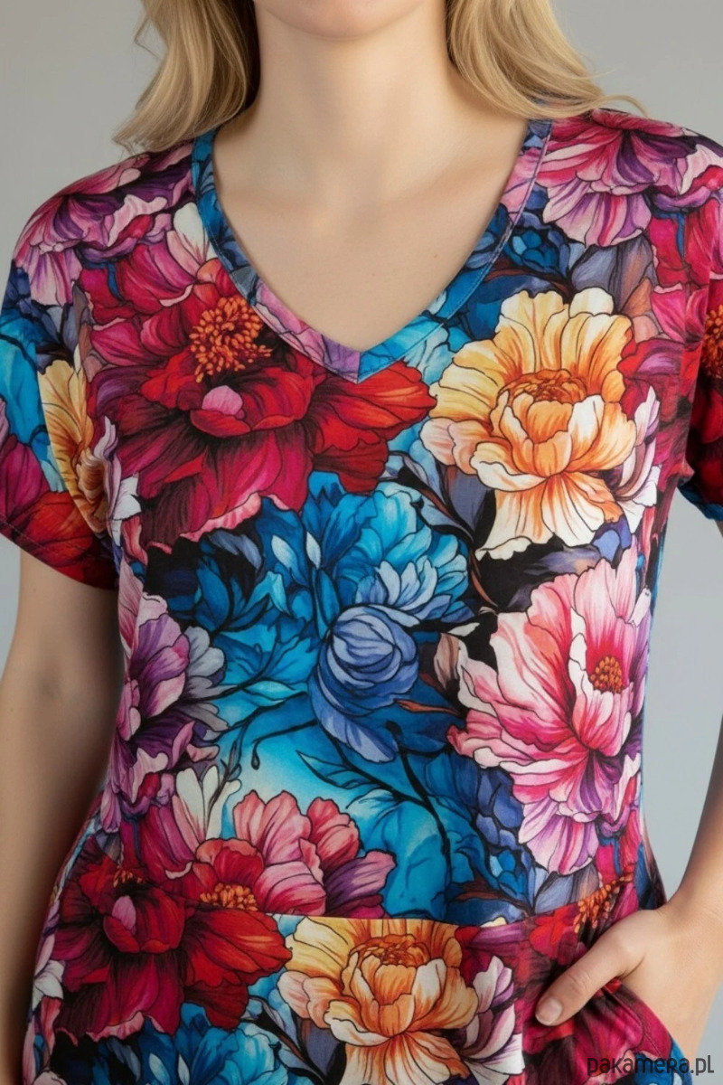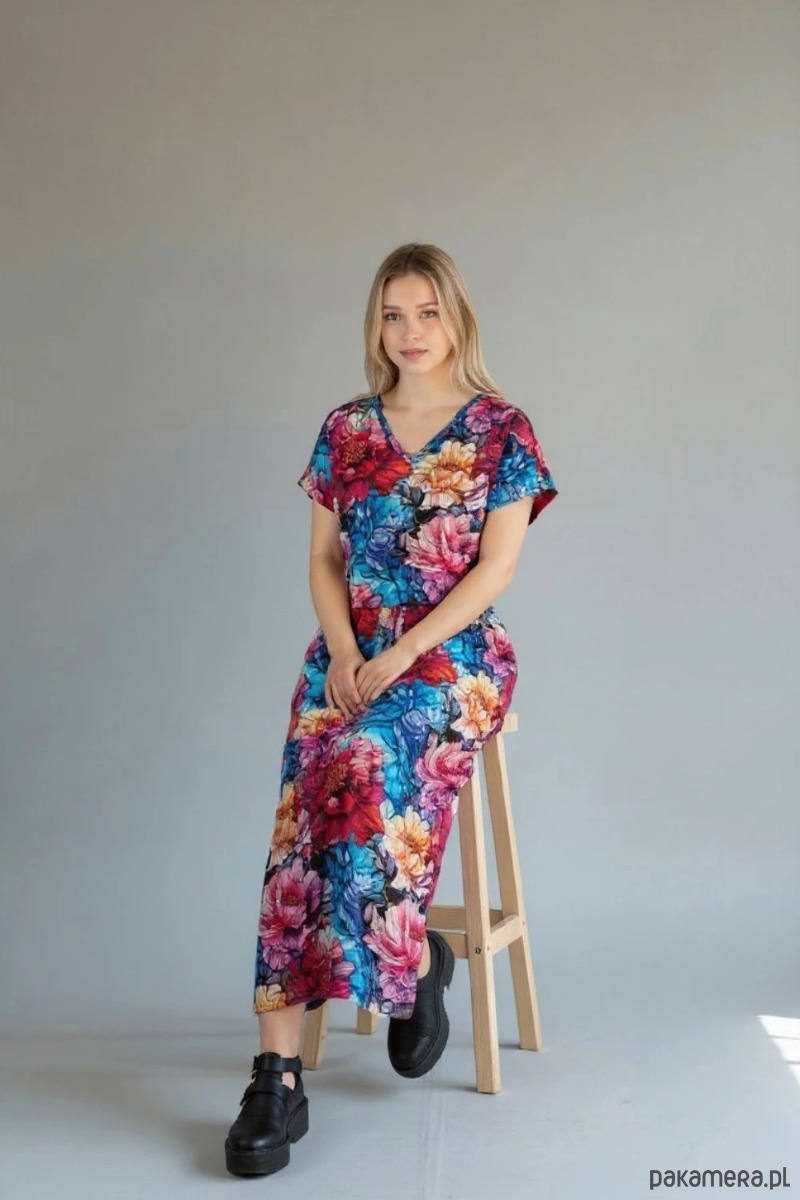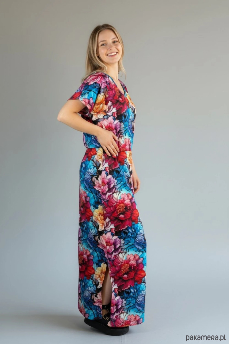 Wyjątkowa sukienka maxi Auri Lili w efektowny, kolorowy wzór kwiatowy, która łączy wygodę z kobiecym, swobodnym stylem. To model idealny dla osób, które lubią wyraziste printy i komfort noszenia na co dzień.