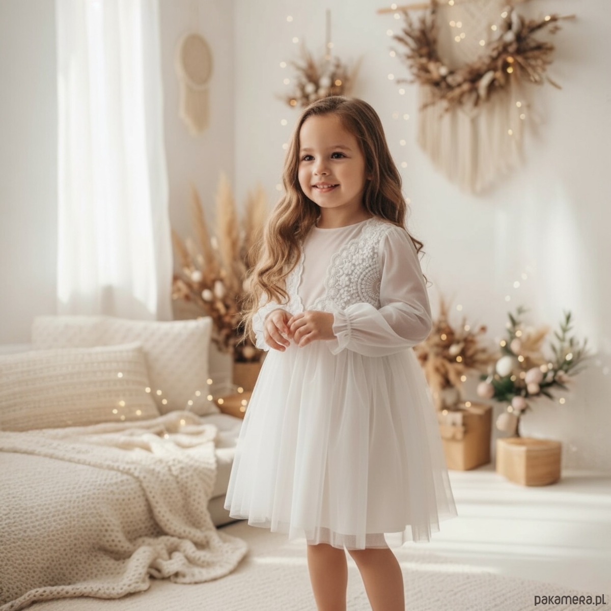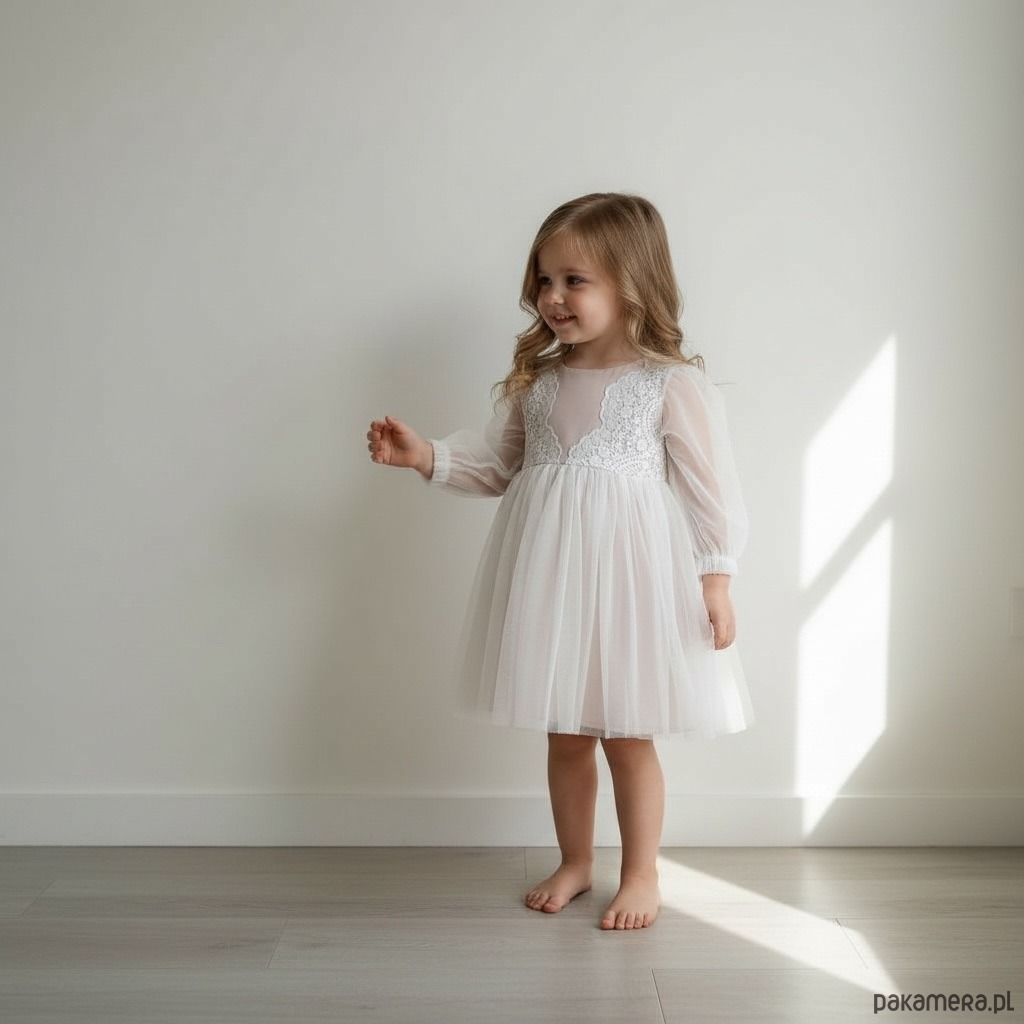 Sukienka tiulowa Mirella z miekkiej tkaniny sukienkowej marchiano, eleganckiej i matowej, z bufiastymi rekawkami i kokardami w kolorze beżowym, delikatnym i pastelowym zdobiona haftem na tiulu ecru