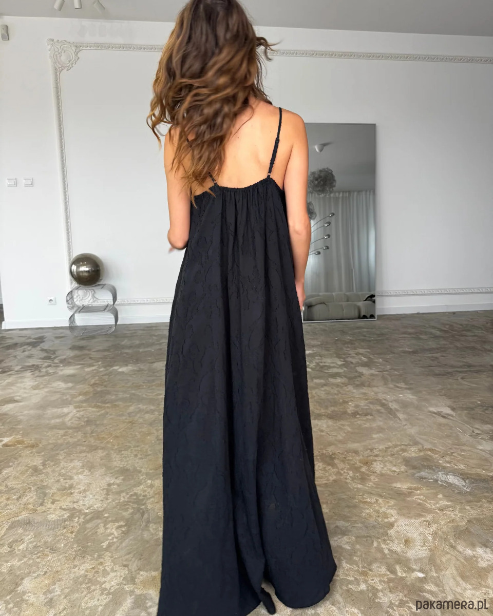 Model został zaprojektowany tak, aby łączyć komfort noszenia z elegancką linią sylwetki. Długość maxi wydłuża optycznie figurę, a miękko układający się materiał delikatnie otula ciało, tworząc efekt płynnego ruchu przy każdym kroku. To sukienka, która nie potrzebuje nadmiaru dodatków – sama w sobie stanowi kompletną, dopracowaną stylizację.