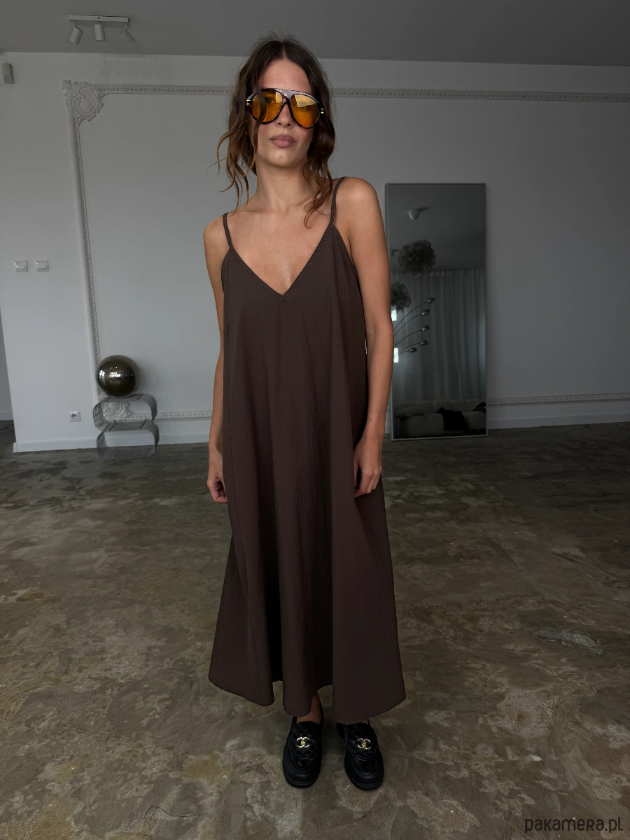 Cienkie ramiączka z regulacją pozwalają dopasować sukienkę do siebie – tak, aby dekolt i długość pracowały dokładnie tak, jak chcesz. To model, który nie narzuca formy, tylko ją podąża.
