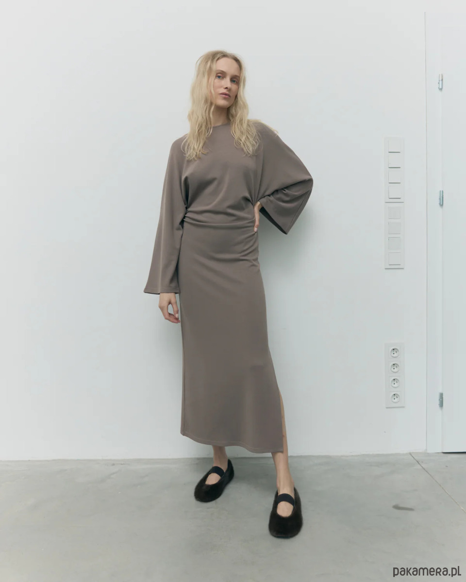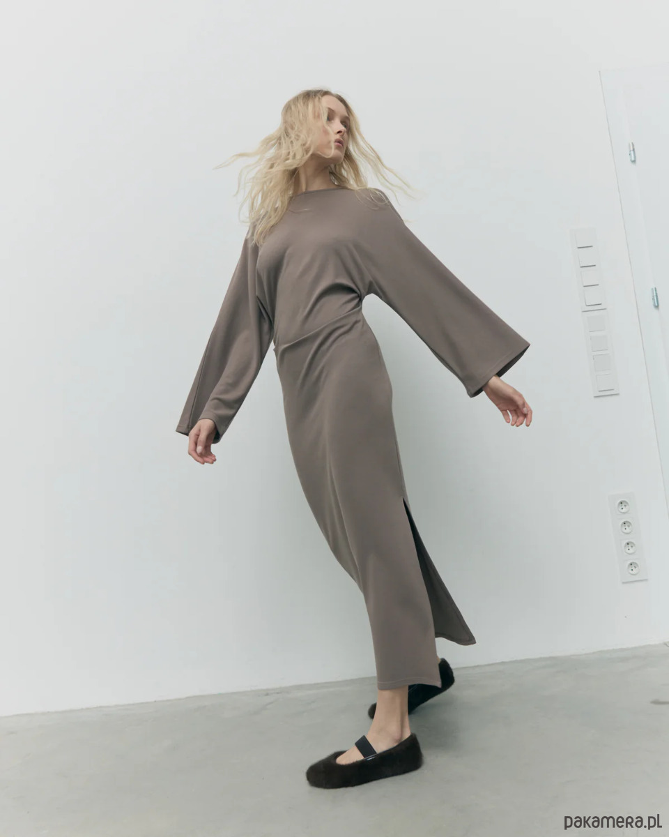Ten model to całoroczna baza – świetnie sprawdzi się jesienią i zimą z kozakami czy botkami, a wiosną i latem w zestawie z sandałami lub japonkami. Prosty krój, subtelne rozcięcie i eteryczny charakter sukienki nadają sylwetce lekkości i naturalnej elegancji.