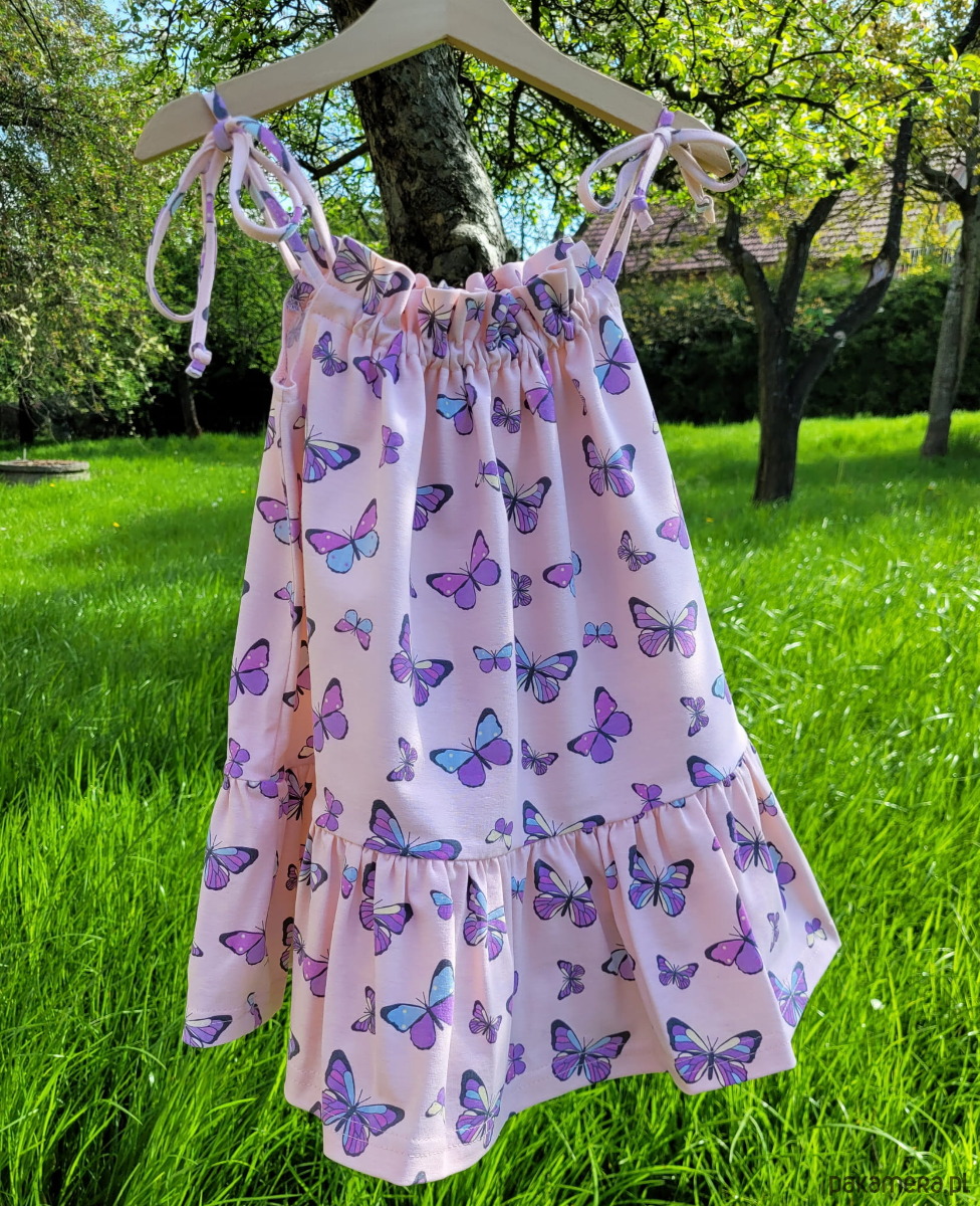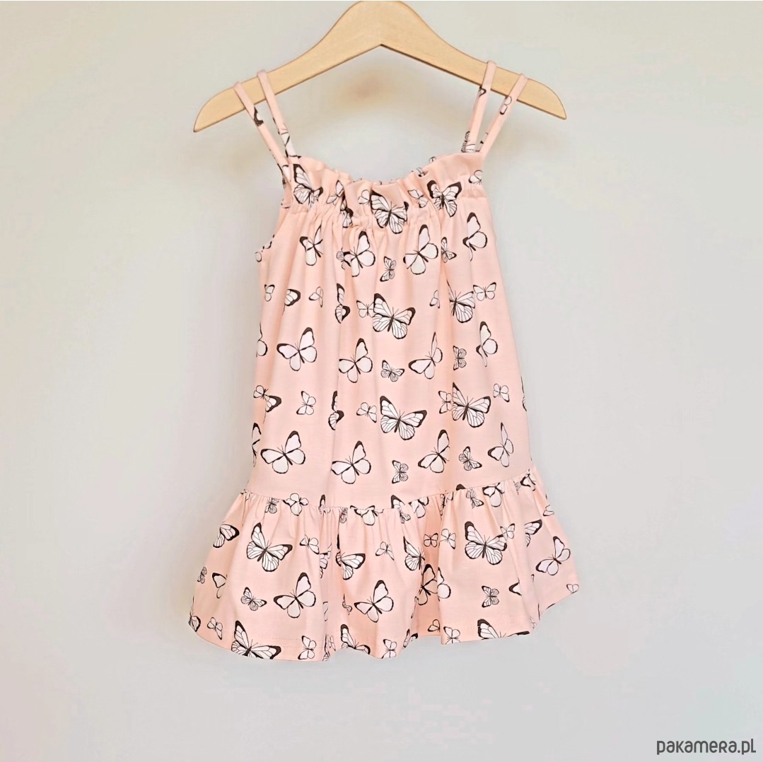 Vanessa Butterfly to letnia, efektowna sukienka na ramiączkach dla dziewczynki, wykonana z materiału zmieniającego kolory w zetknięciu z promieniami słonecznymi. Dziewczęcy print w motylki na delikatnym łososiowym tle zachwyca swoją subtelnością. Skład: 95% bawełna, 5% elastan
