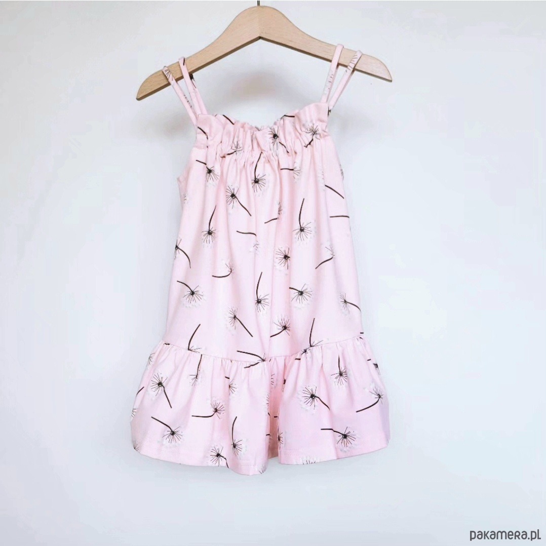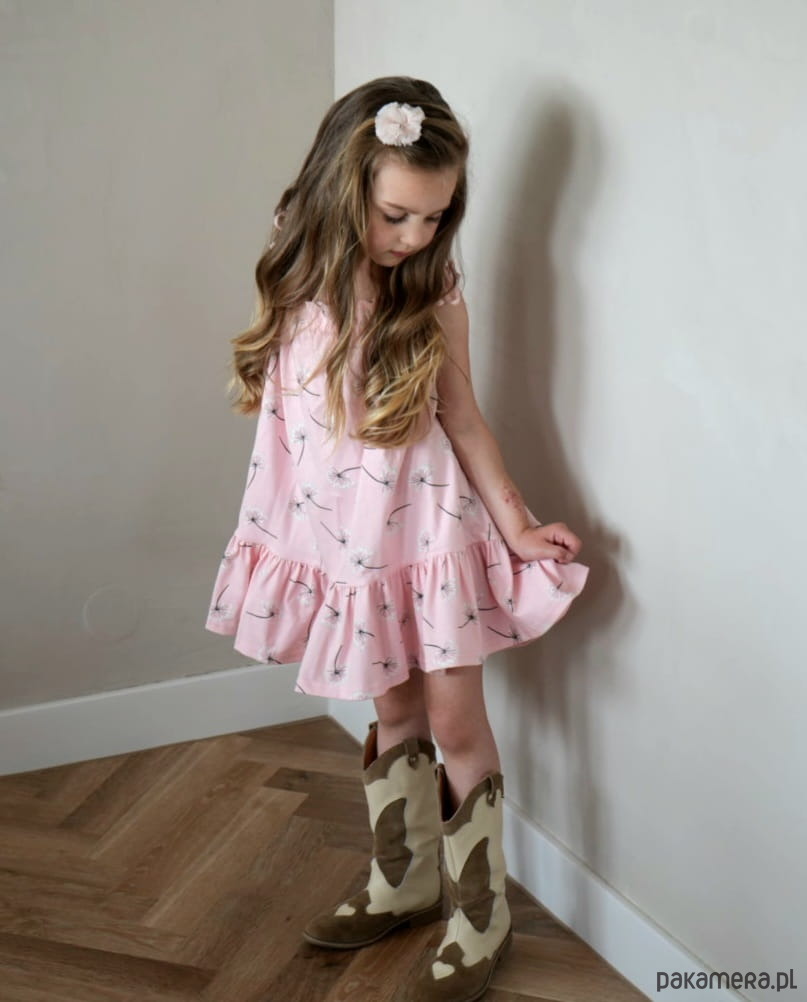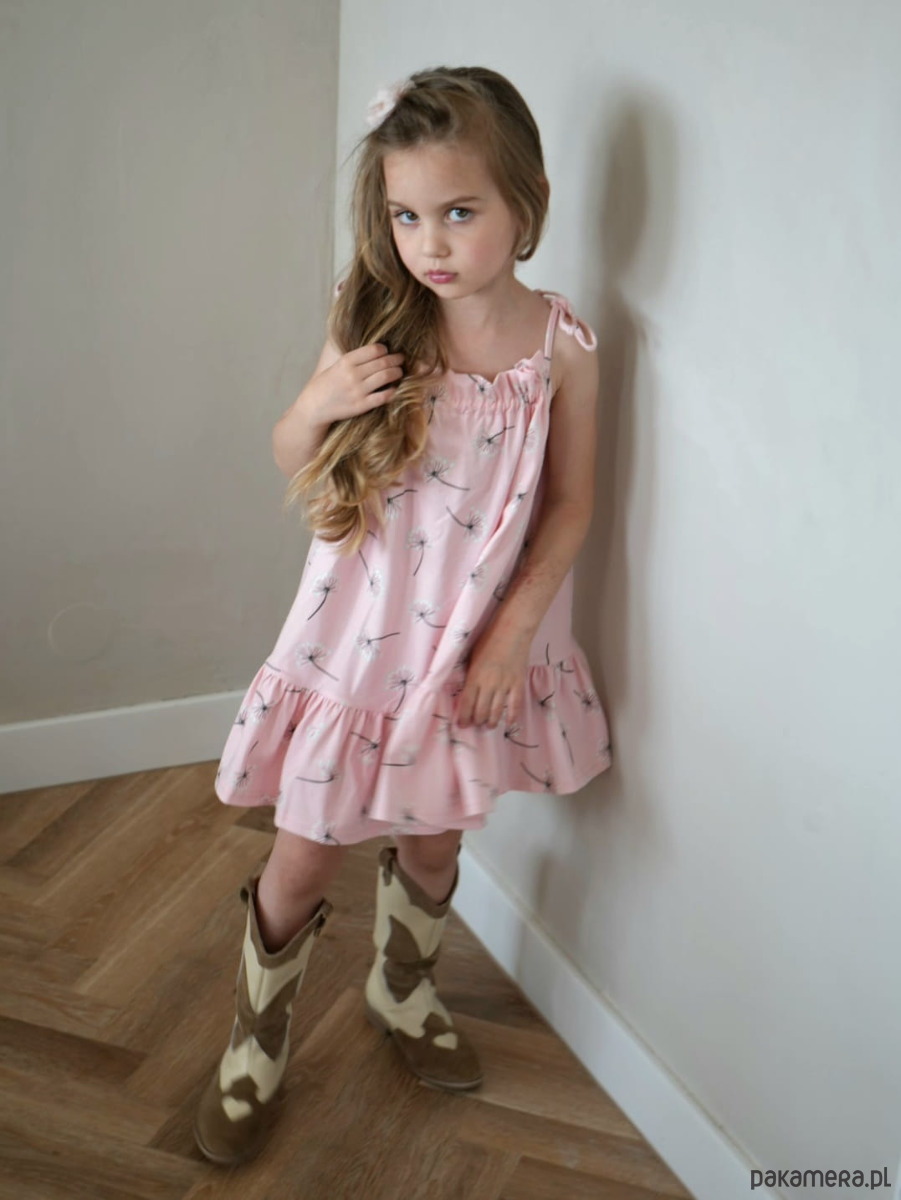 Vanessa Flowers to letnia, efektowna sukienka na podwójnych ramiączkach dla dziewczynki, wykonana z materiału zmieniającego kolory w zetknięciu z promieniami słonecznymi. Dziewczęcy print w dmuchawce na delikatnym pastelowym różu w tle zachwyca swoją subtelnością. Skład: 95% bawełna, 5% elastan Model występuje w rozmiarach: 98/104 110/116 122/128 134/140