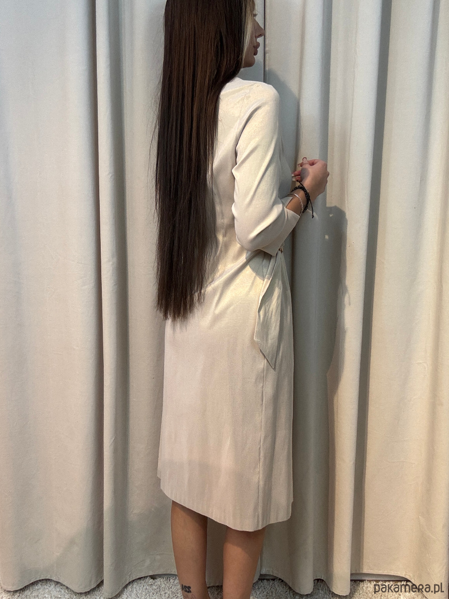 Elegancka sukienka ze złotą poświatą, na zakładkę.