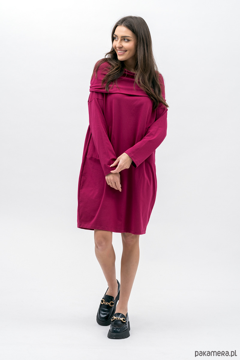 Ta wyjątkowa sukienka z miękkiej, elastycznej dzianiny to kwintesencja komfortu i kobiecej elegancji. Ma luźny, oversizowy krój, który pięknie układa się na sylwetce, zapewniając swobodę ruchów i wygodę przez cały dzień. Jej największym atutem jest kołnierz typu 3 w 1, który możesz stylizować na różne sposoby: jako kaptur, gdy chcesz dodać stylizacji casualowego charakteru, opuszczony na ramiona, tworzy romantyczny dekolt i kobiecy akcent, złożony pod szyją, pełni rolę ozdobnego kołnierza – idealnego pod kurtkę lub płaszcz.