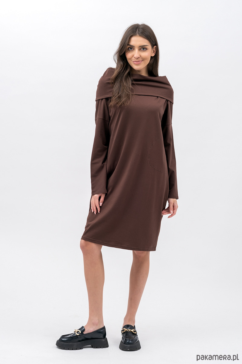 Po bokach znajdują się dyskretnie wszyte kieszenie, które dodają funkcjonalności i codziennej wygody. Dzianina jest przyjemna w dotyku, otula ciało miękko i ciepło – idealna na jesień i zimę. To sukienka, która łączy minimalizm, wygodę i styl – sprawdzi się zarówno do pracy, jak i na weekendowe spotkania czy spacer po mieście.