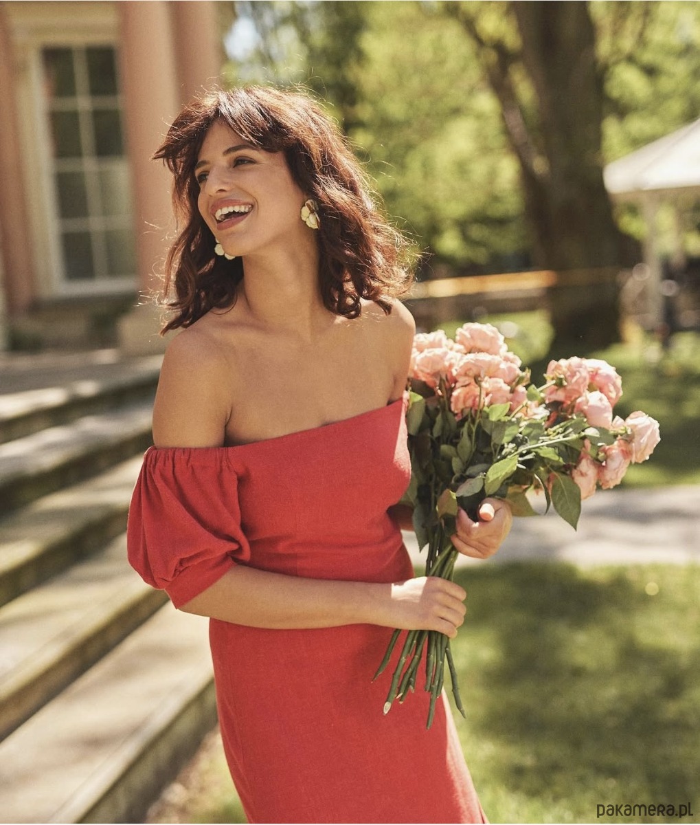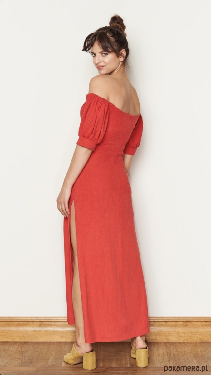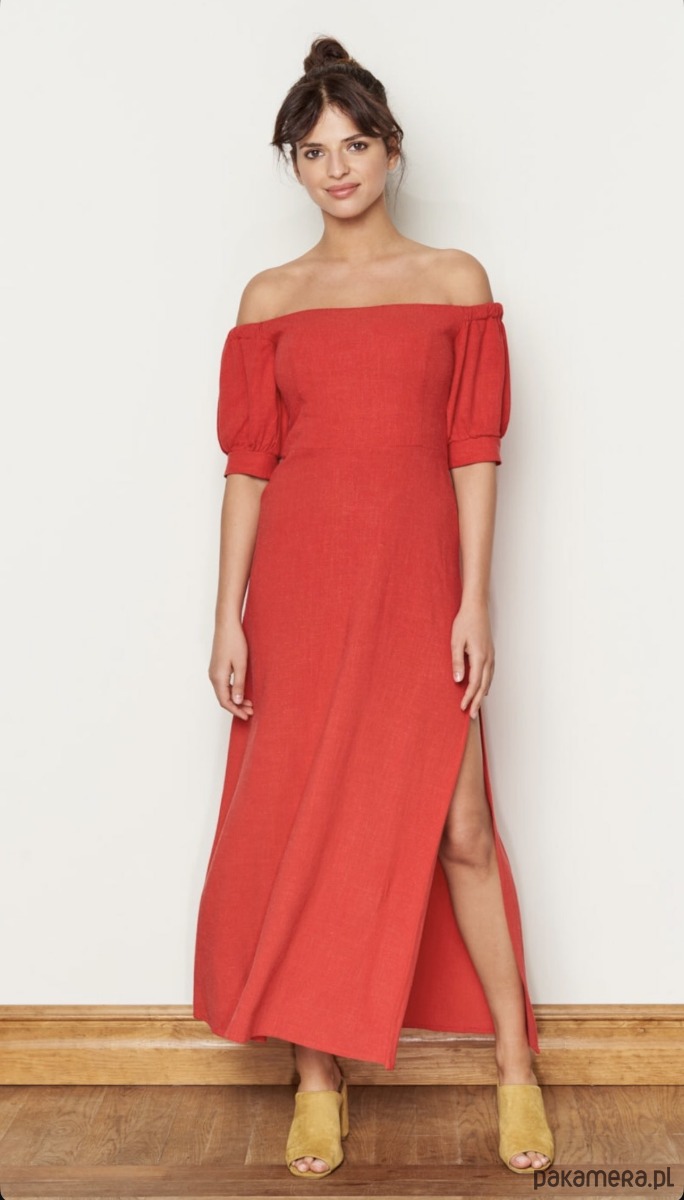 Uszyta z mieszanki lnu i wiskozy, łączy naturalną przewiewność z miękkim, delikatnym wykończeniem. Jej off-shoulder krój, bufiaste rękawy i wysokie rozcięcie na nodze sprawiają, że Natalie przyciąga spojrzenia i emanuje romantyzmem.