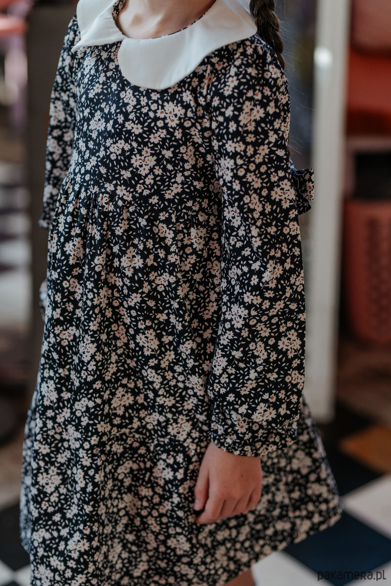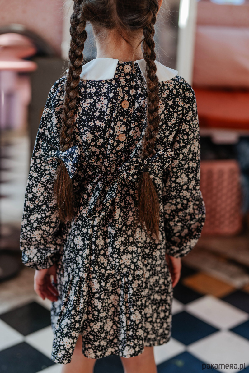 Bardzo stylowa i ponadczasowa sukienka w klimacie retro. Ozdobiona białym kołnierzykiem. Rękawki zakończone gumeczką. Z tyłu wiązana na pasek. Idealna do tańca, zabawy i różne uroczystości.