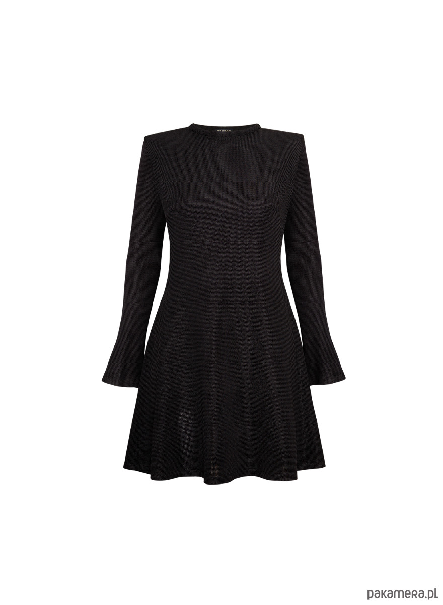 Sukienka mini (przed kolano) w kolorze czarnym, uszyta z przyjemnej w dotyku, wysokogatunkowej, dzianiny wiskozowej o charakterystycznym splocie. .Rękaw u dol dzwonkowaty .