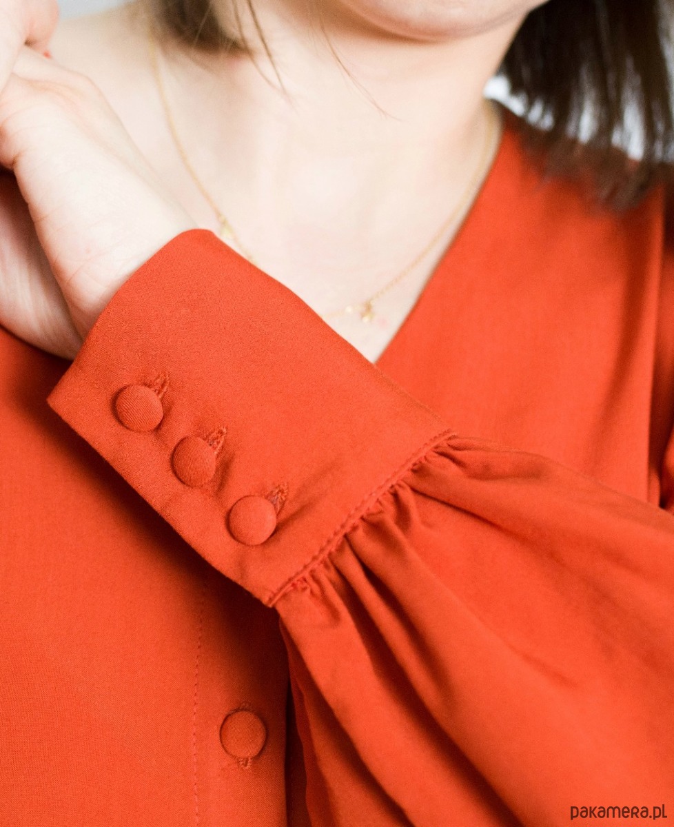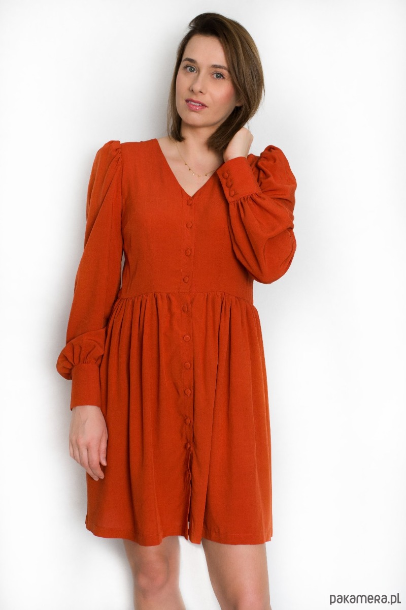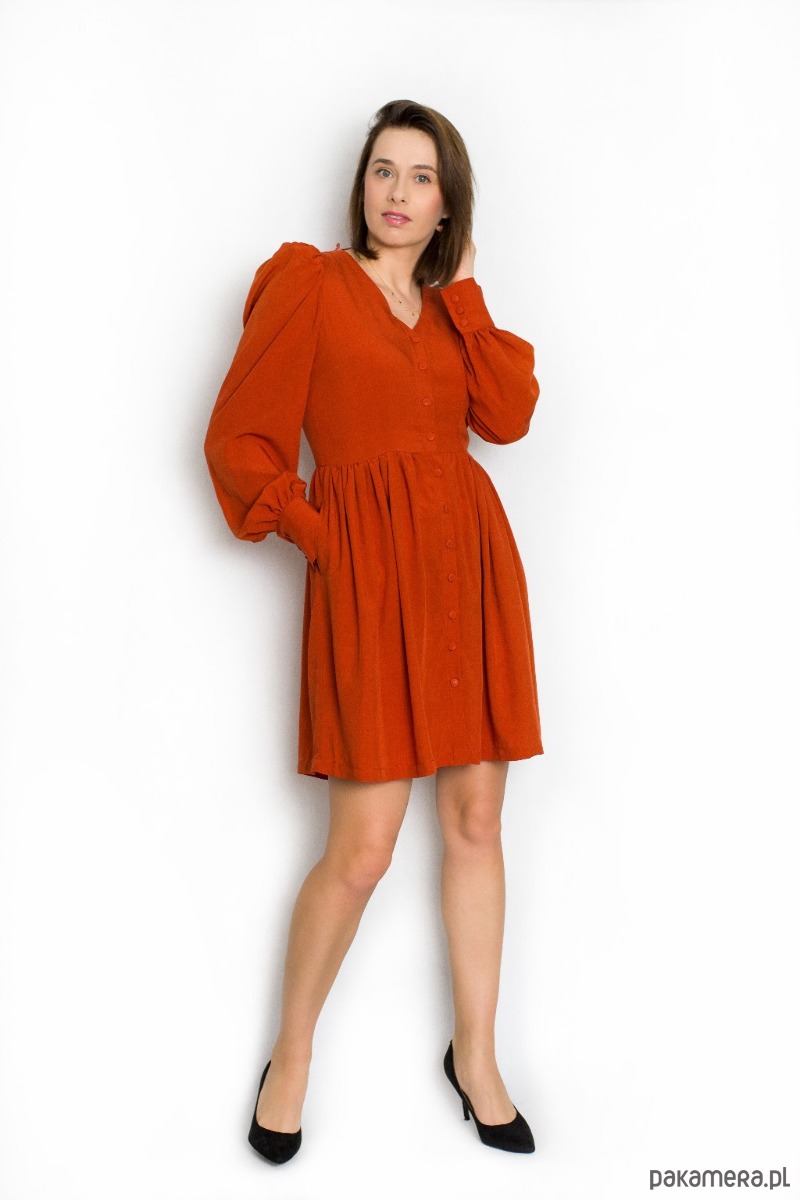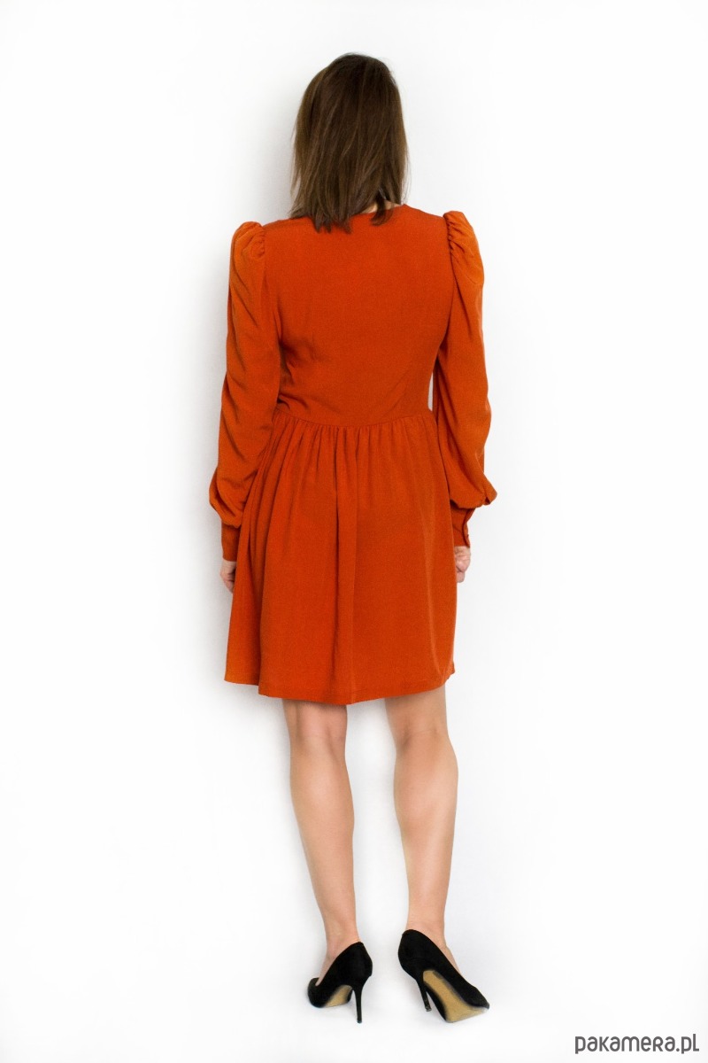 Uszyta została z wysokiej jakości 100% wiskozy, w ceglastym kolorze. Prostota, kobiecość i dziewczęcość zarazem. Idealna na codzienne spotkania, wyjątkowe okazje jak również do pracy czy na spotkanie z przyjaciółką. PAULA zapinana jest na całej długości na ręcznie oblekane tkaniną guziki. Dekolt w literkę V. Długie bufiaste rękawy wykończone szerszym mankietem zapinanym na guziki również ręcznie oblekane tkaniną. Dół składający się z jednej marszczonej falbany. Długość przed kolano. Jej konstrukcja to bardzo wiele dopracowanych detali.