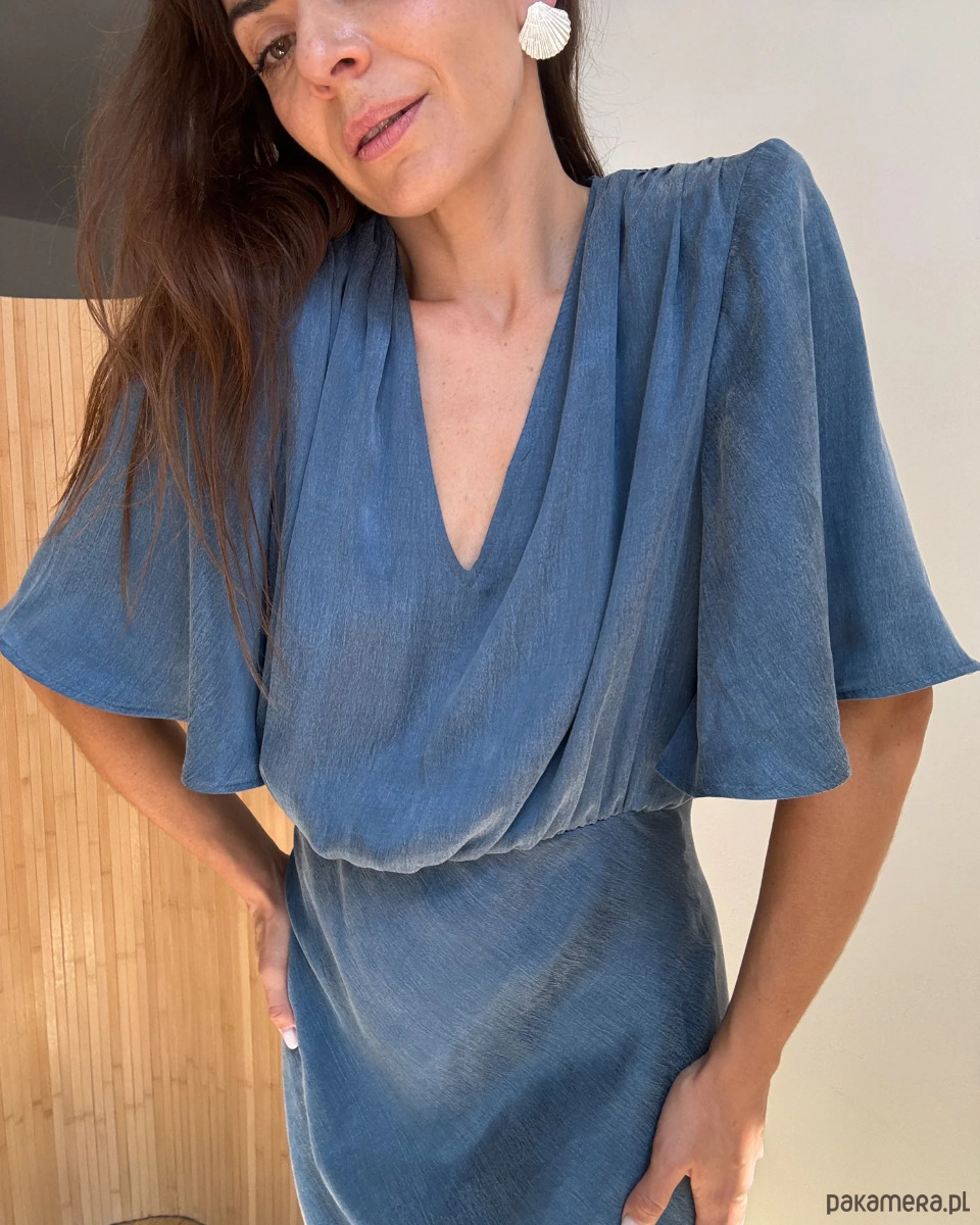 Oryginalna sukienka Power premium z lyocell w kolorze denim blue. Poduchy (odpinane), idealny dekolt, falujące rękawy i seksowny dół. Niezwykła tkanina jedwabista w chwycie i detale tego fasonu do majstersztyk. Każdy element (rękaw, spódnica, korpus) krojony osobno tak żeby nadać lekkości. Wielozadaniowa sukienka do szpilek, trampków, kozaków a jak lubisz eksperymenty wybierz kowbojki.