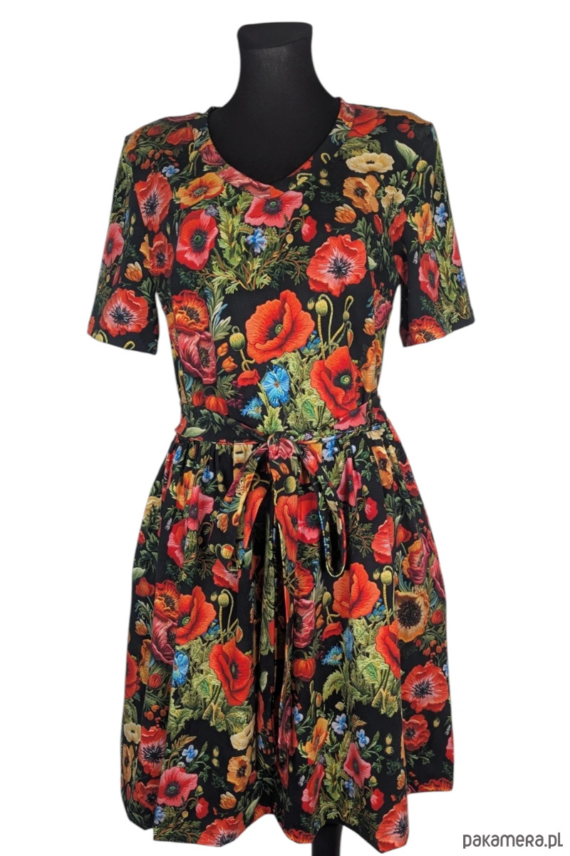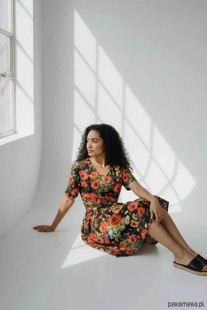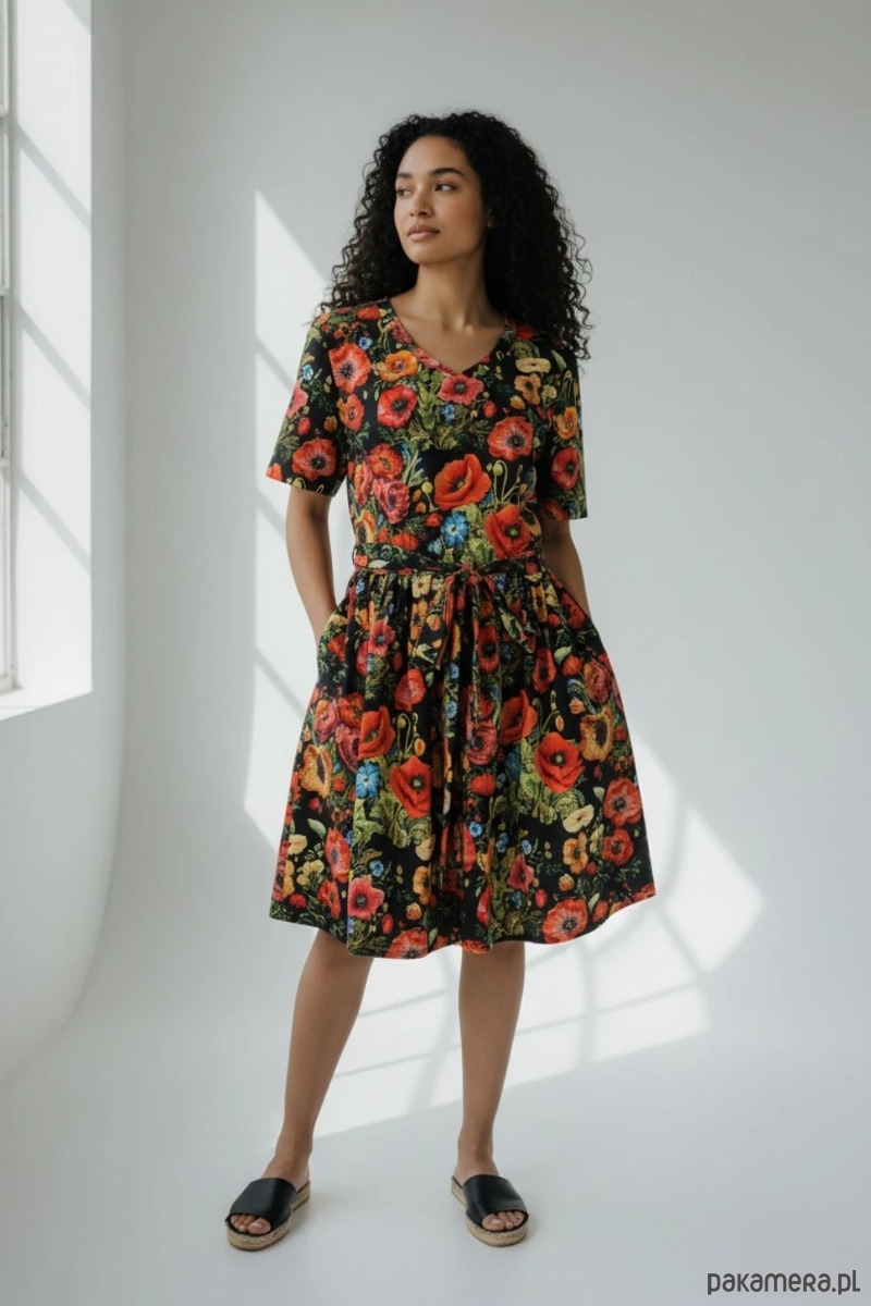 Wyjątkowa sukienka Pranajama Summer w efektowny wzór w maki, która łączy kobiecy fason z wygodą miękkiej dzianiny. To model dla osób, które lubią wyraziste, kwiatowe printy i komfort codziennego noszenia.