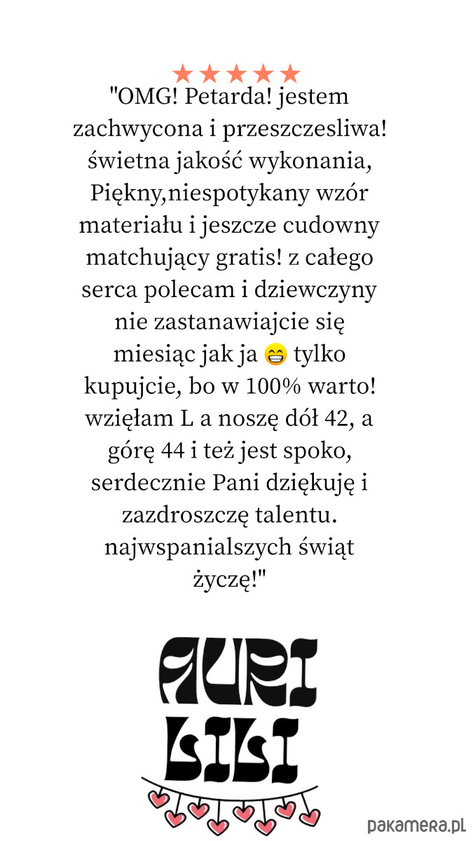 Możesz zwrócić zakupiony produkt bez podania przyczyny w przeciągu 14 dni od daty jego otrzymania. Wystarczy, że wyślesz wiadomość e-mail na adres Pakamery. Pamiętaj, że produkt musi być w stanie nienaruszonym i nie może nosić śladów używania. Zwracany towar przesyłasz na własny koszt wraz z wypełnionym formularzem o odstąpieniu od umowy (do pobrania po zalogowaniu). Produkty wykonane na indywidualne zamówienie nie podlegają zwrotowi. Pełna procedura zwrotu (tutaj)