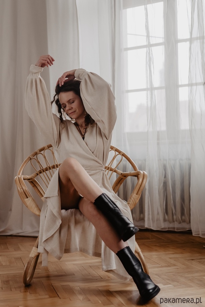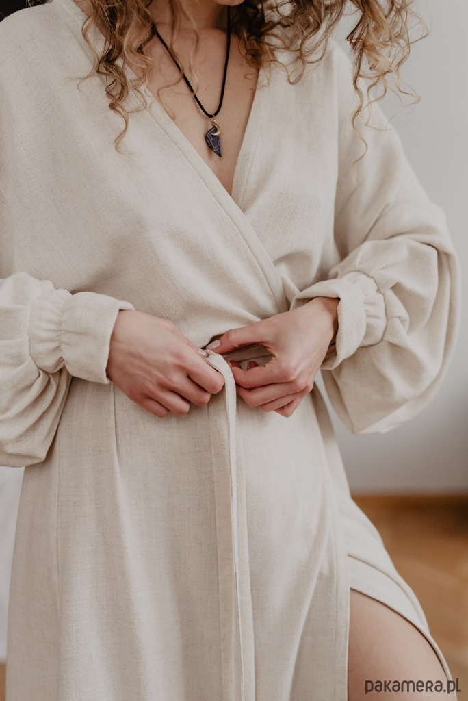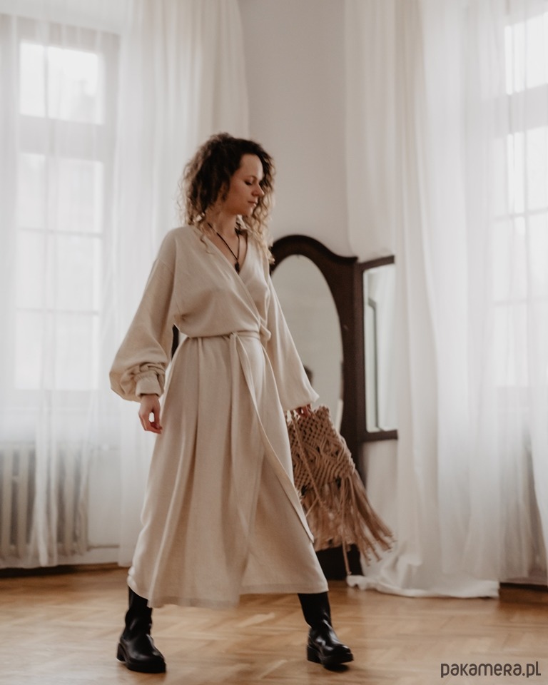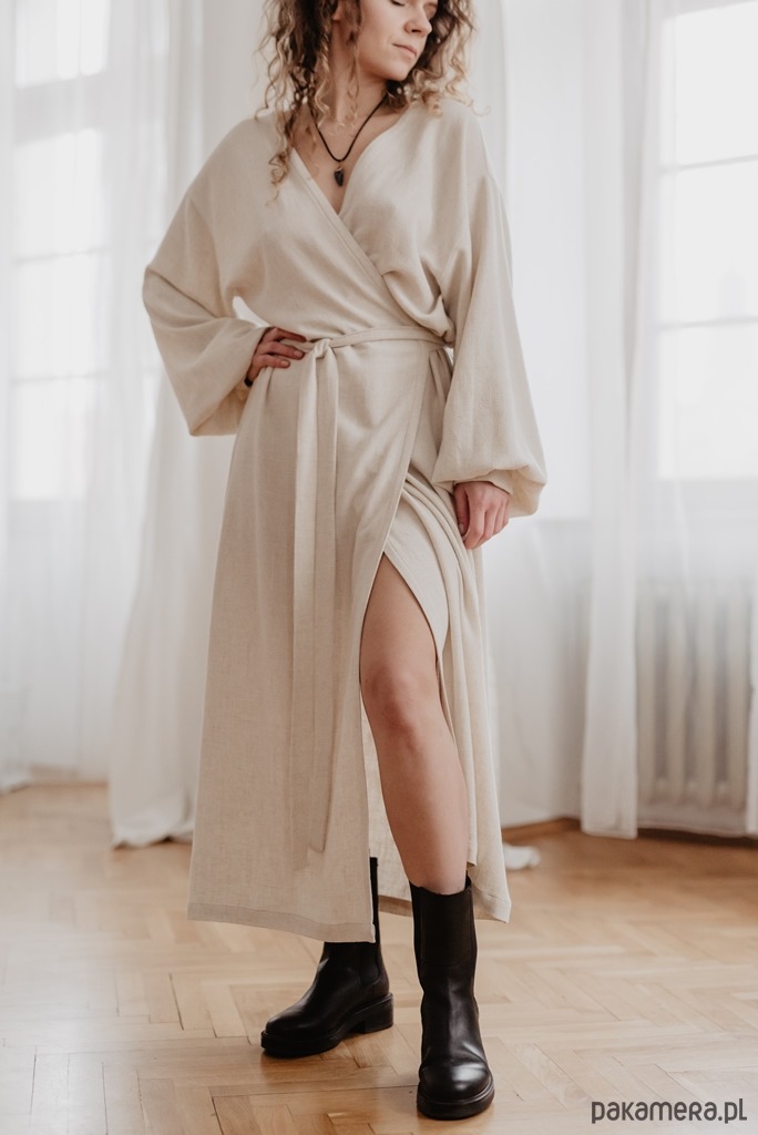 Sukienka RONI została uszyta z tkaniny lniano wiskozowej w kolorze mleczno naturalnym. Jest zwiewna, kopertowo wiązana i posiada piękne rozkloszowane rękawy. Fason RONI jest kobiecy i romantyczny.