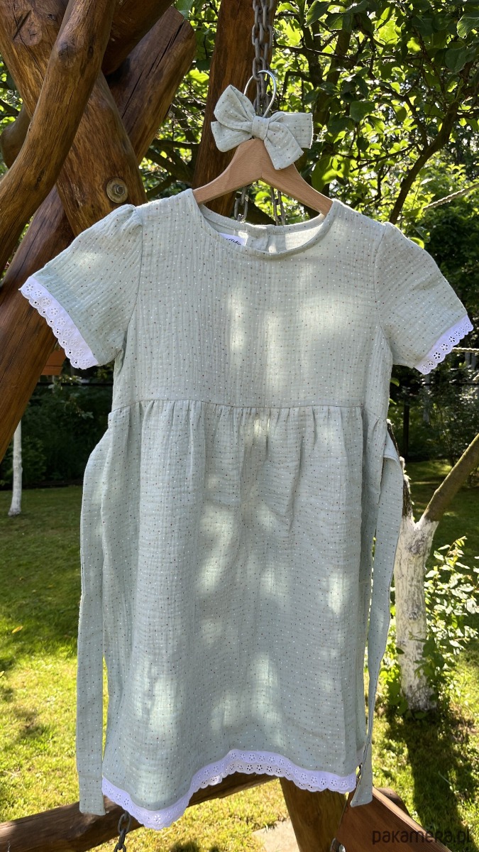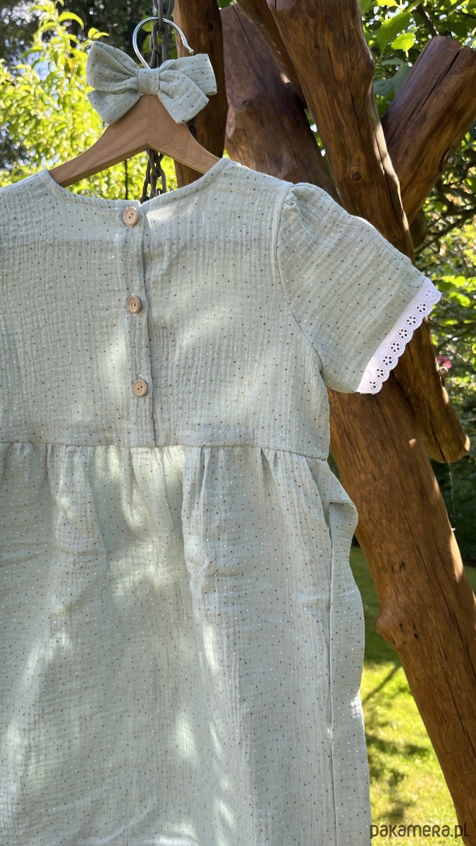 Subtelna i urocza sukienka. Uszyta z miętowego muślinu w łączkę. Lekkości i klasy nadaje jej bawełniany haft angielski i pasek. Idealna na wyjątkowe chwile.