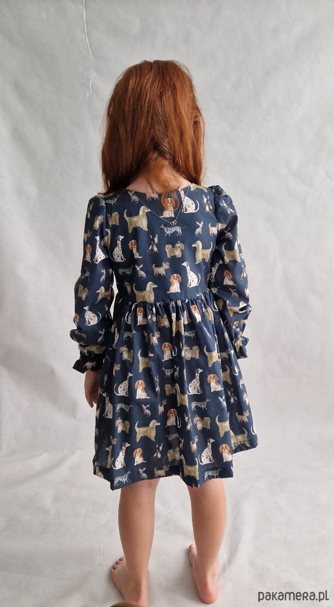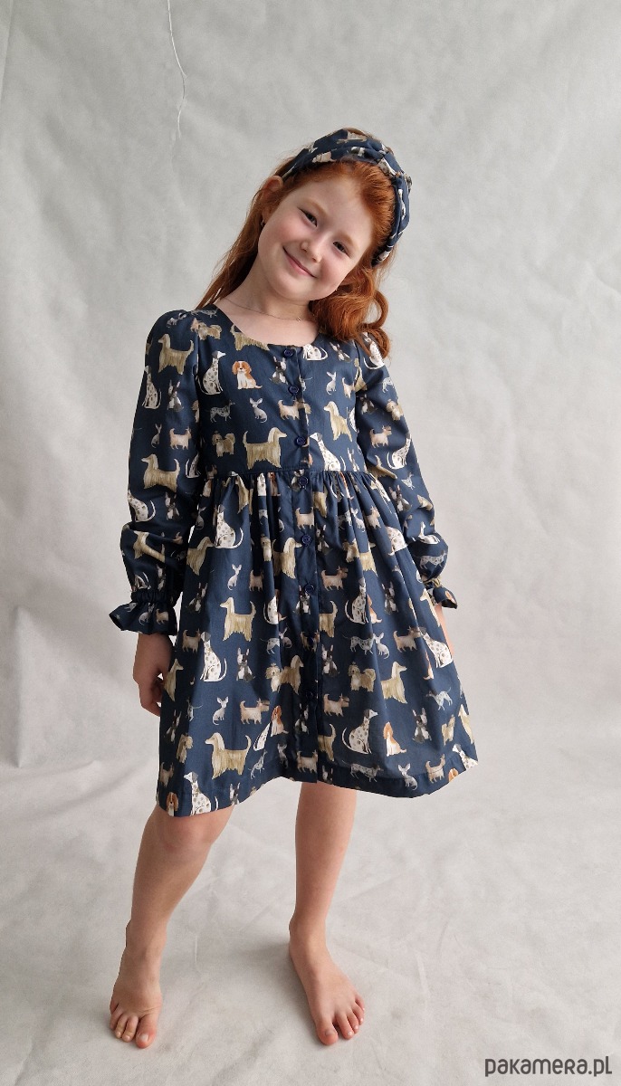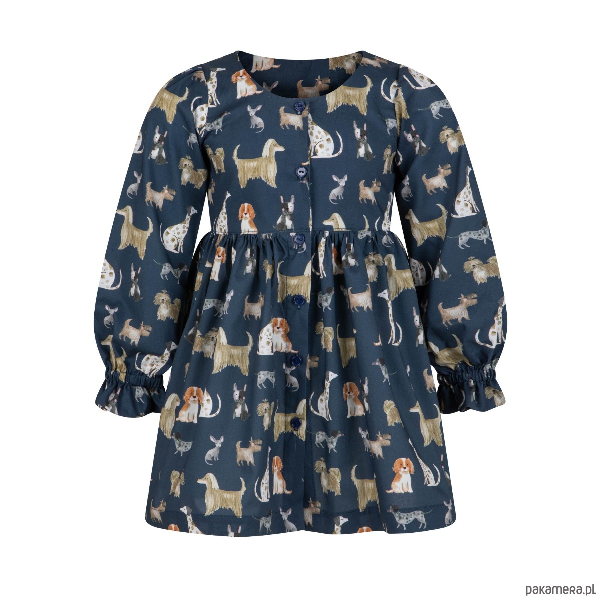 Urocza granatowe sukienka Rosemary w print pieski. Sukienka uszyta jest z tkaniny bawełnianej 100%.