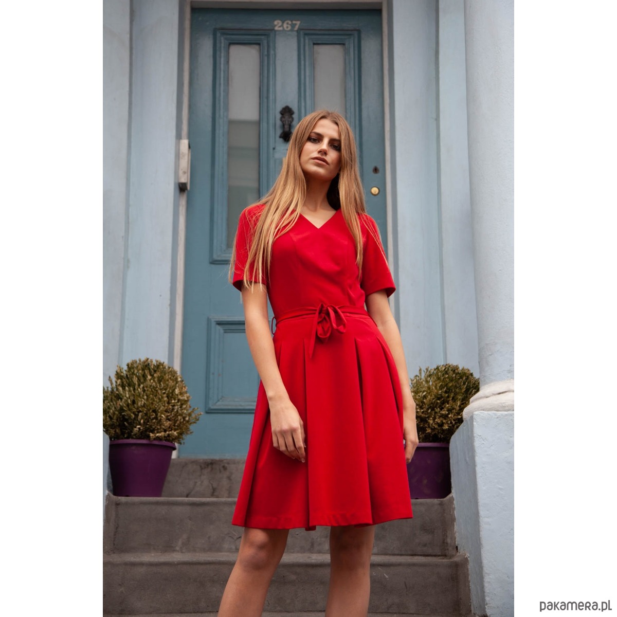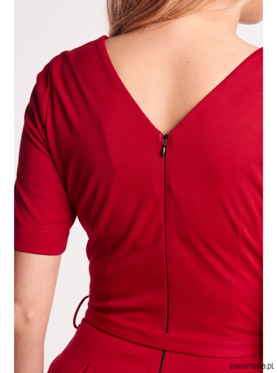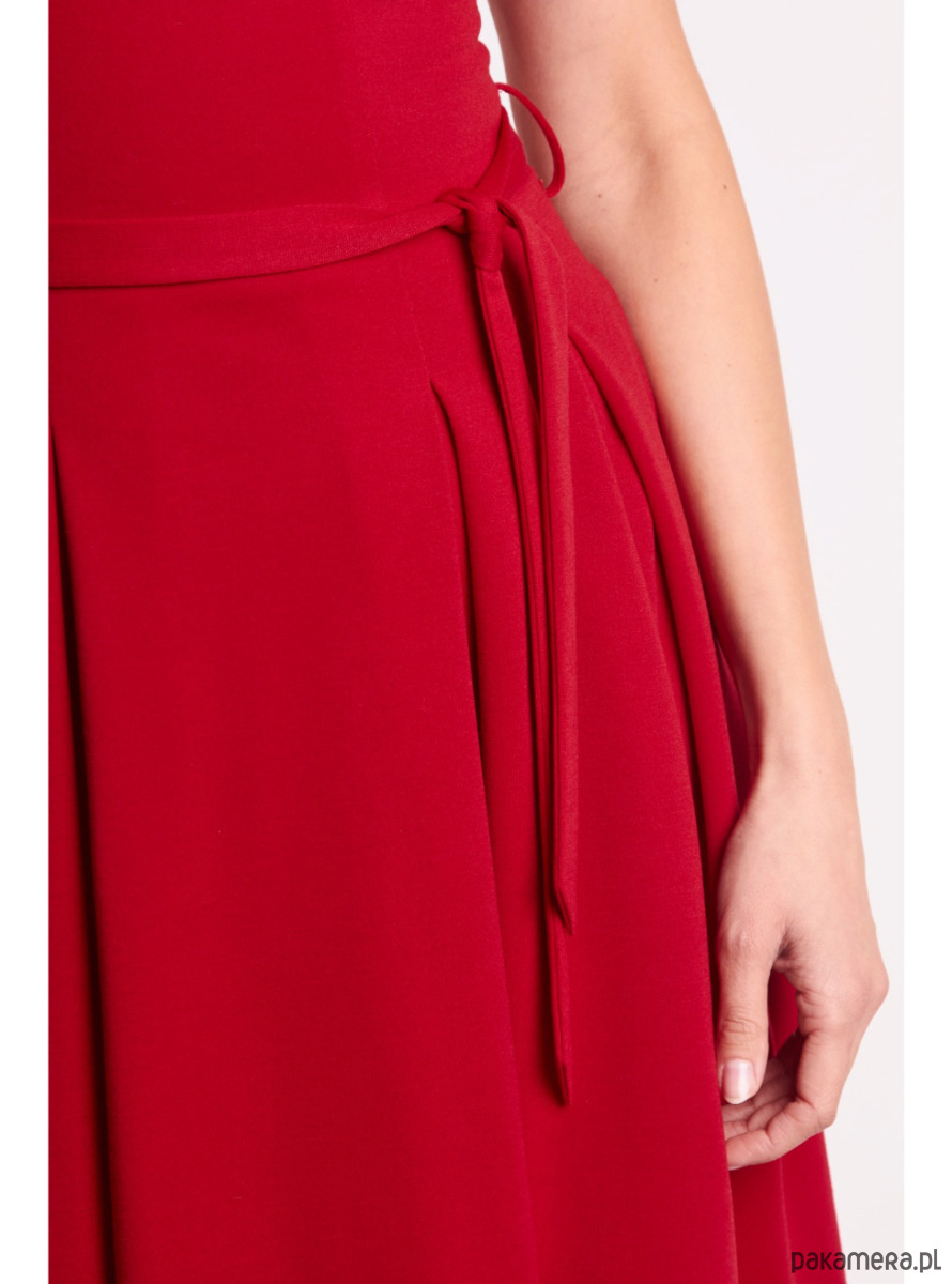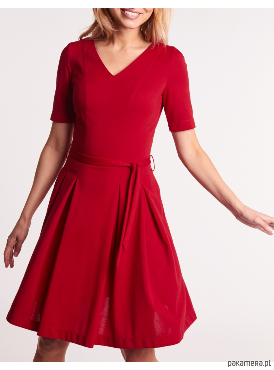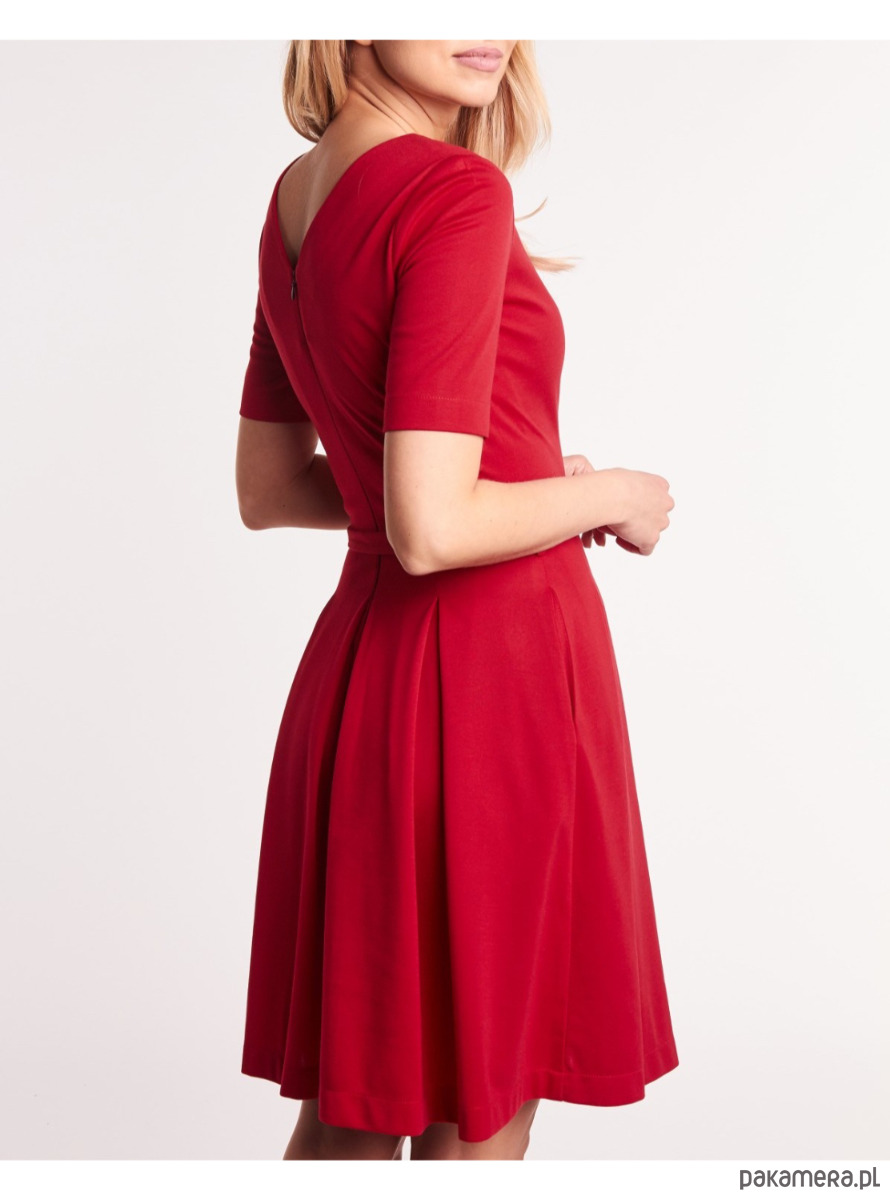 Rozkloszowana sukienka z kontrafałdami, wykonana z elastycznej czerwonej dzianiny, to idealny wybór zarówno na co dzień, jak i na wieczór. Elegancki dekolt w serek - z przodu i z tyłu – subtelnie podkreśla sylwetkę, dodając całości kobiecego szyku.