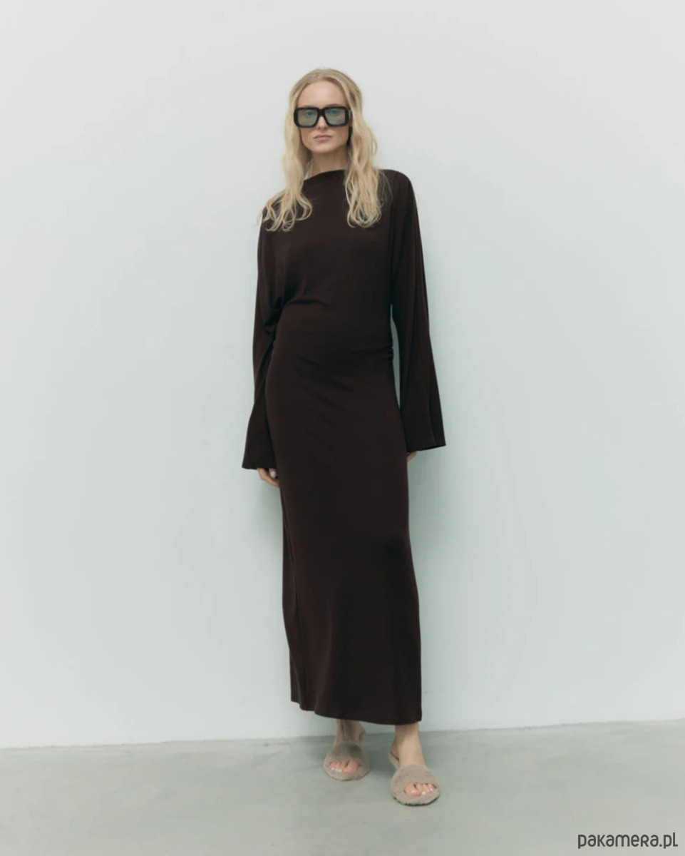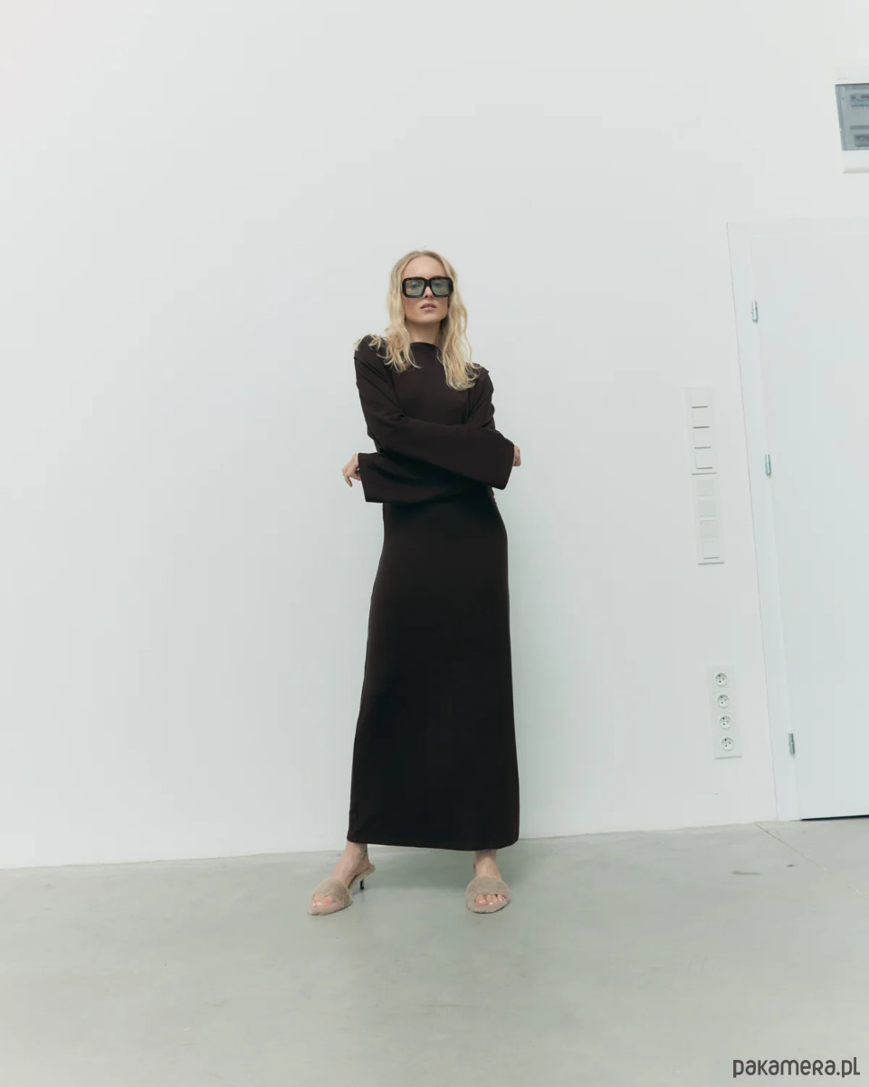 Sukienka Serenity w kolorze Chocolate to model, który łączy wygodę i ponadczasową prostotę w luksusowym wydaniu. Uszyta z miękkiej, elastycznej dzianiny super soft, przyjemnie otula sylwetkę i zapewnia pełen komfort przez cały dzień. Jej minimalistyczny krój z długim rękawem i subtelnym rozcięciem u dołu sprawia, że sukienka jest niezwykle uniwersalna i wpisuje się w ideę kapsułowej garderoby.