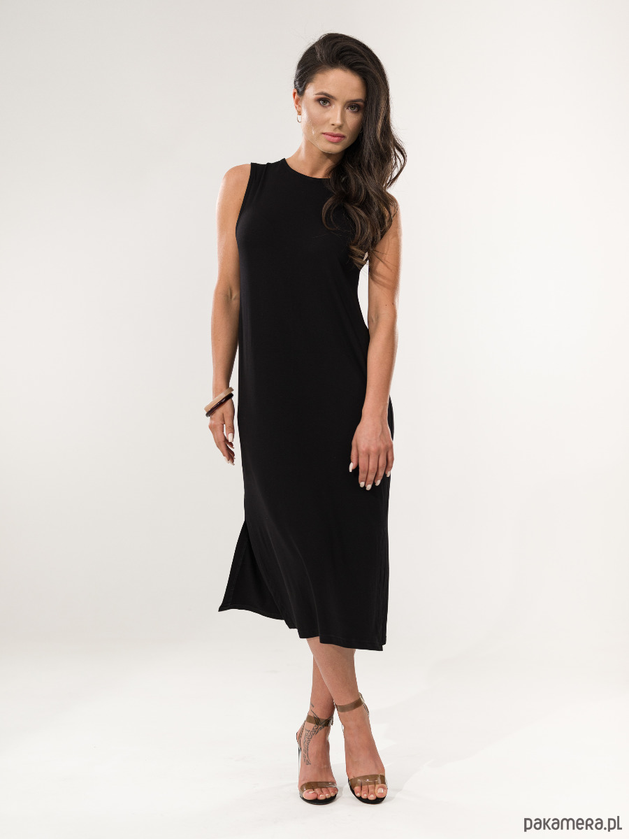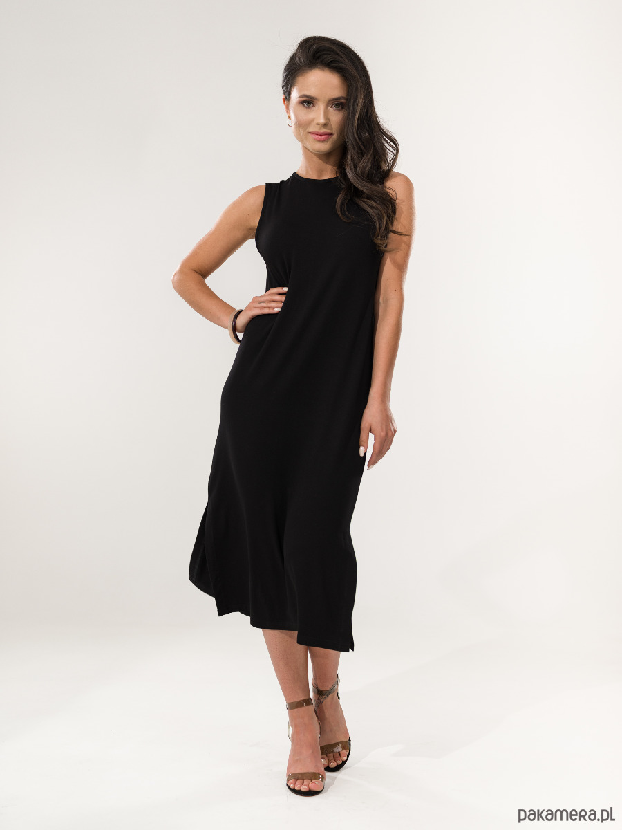 Prosta sukienka bez rękawów. Luźna i wygodna. Dołączony pasek powoduje, że można stylizować ją na kilka sposobów, nawet zrobić z niej krótką sukienkę. Po bokach posiada rozcięcie.
