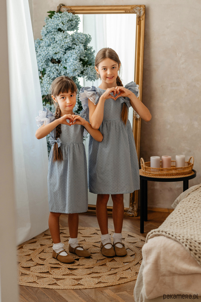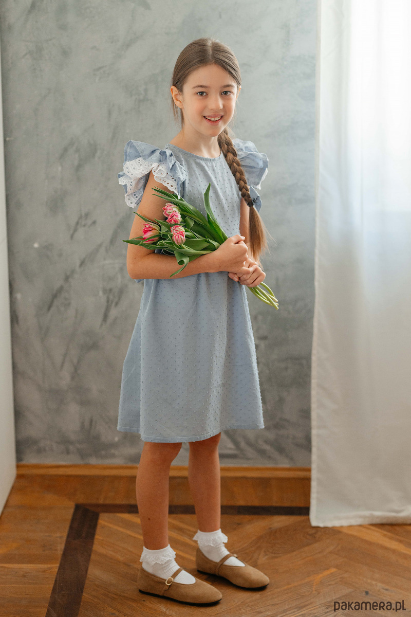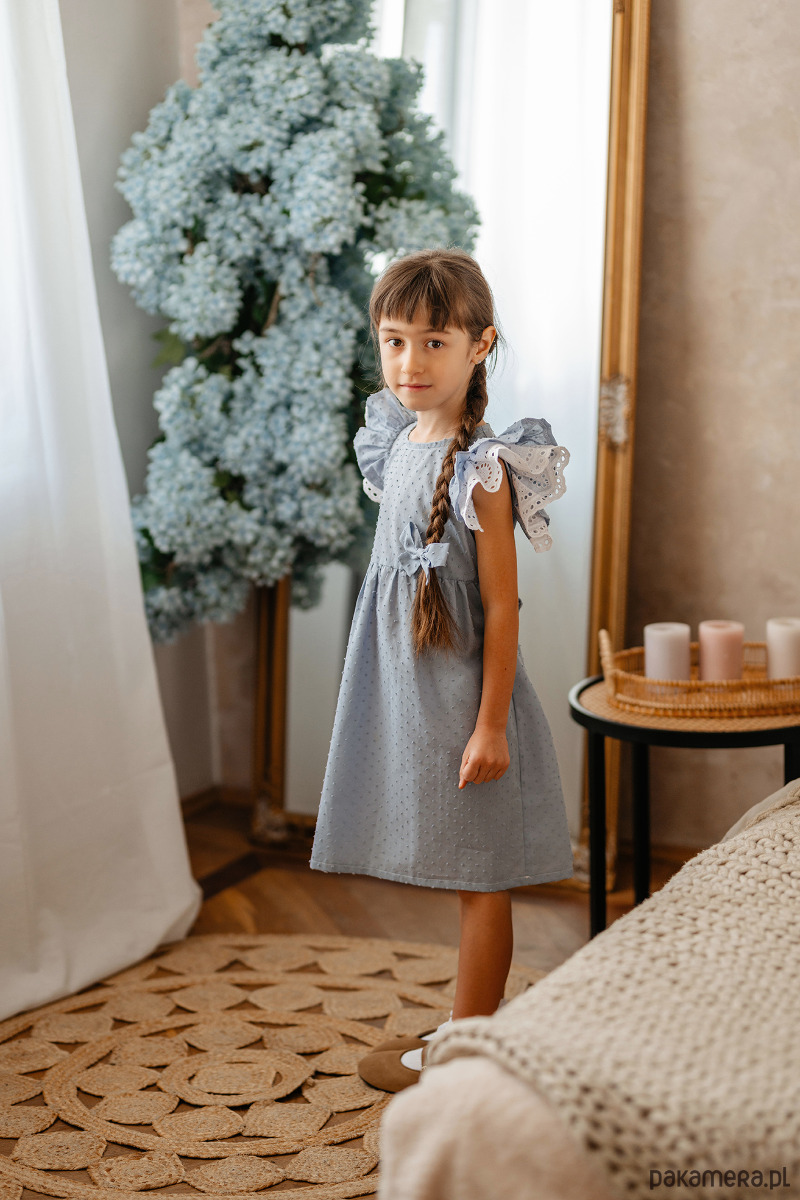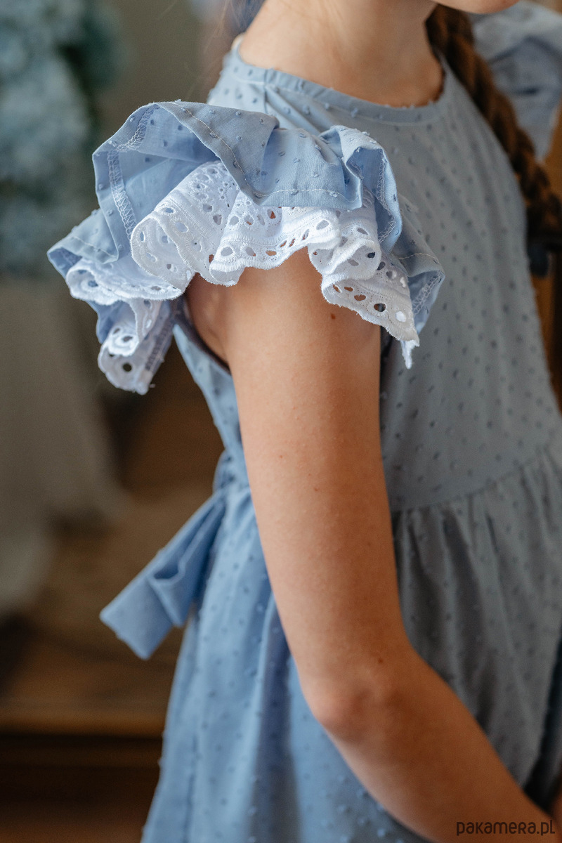 Elegancka sukienka z uroczymi rękawkami z pięknym haftem angielskim. Uszyta z bawełny