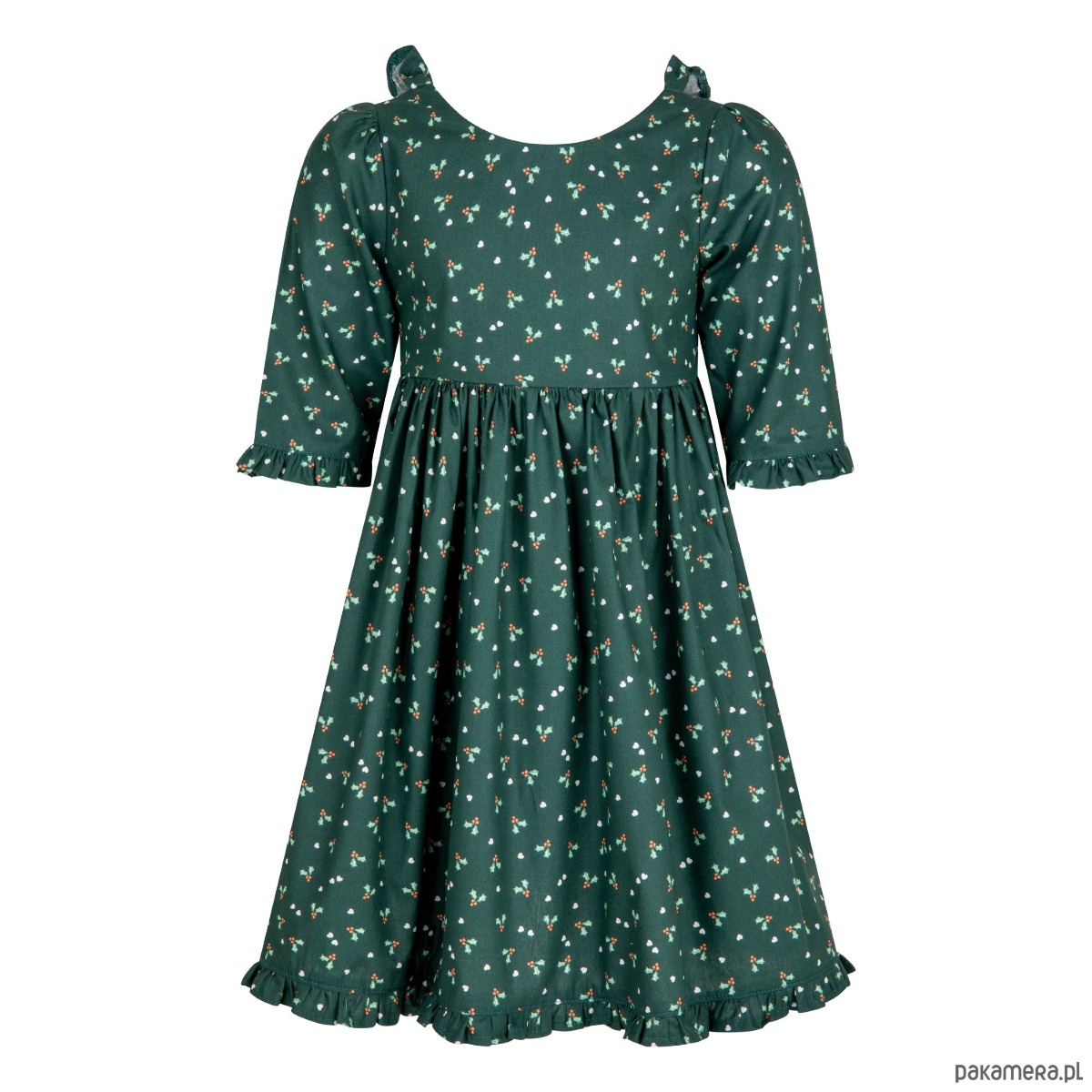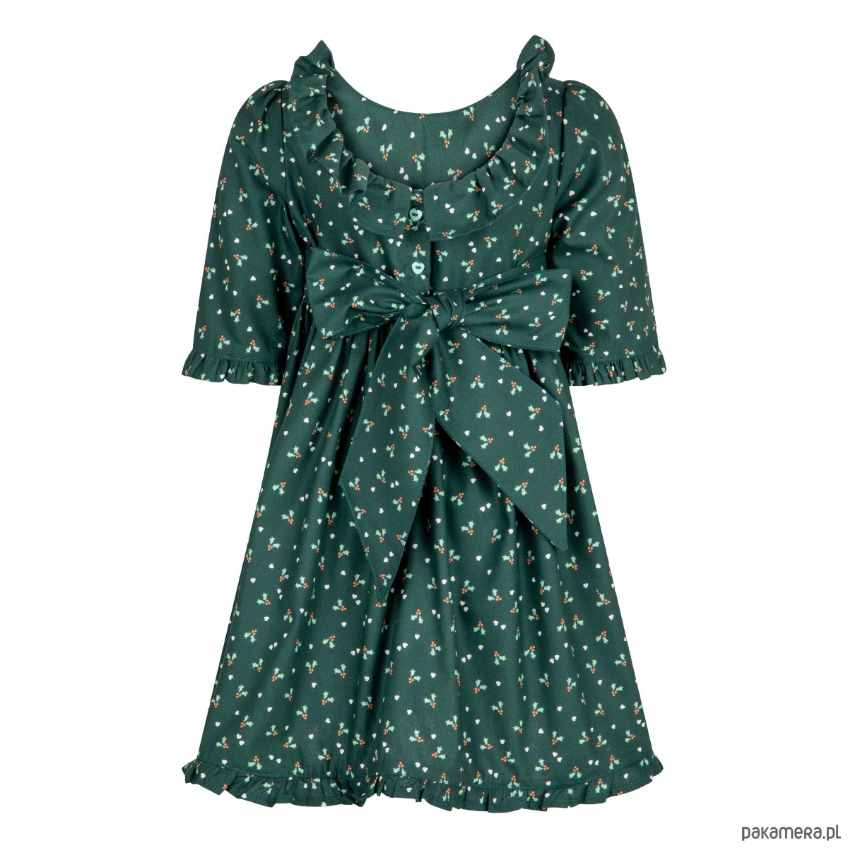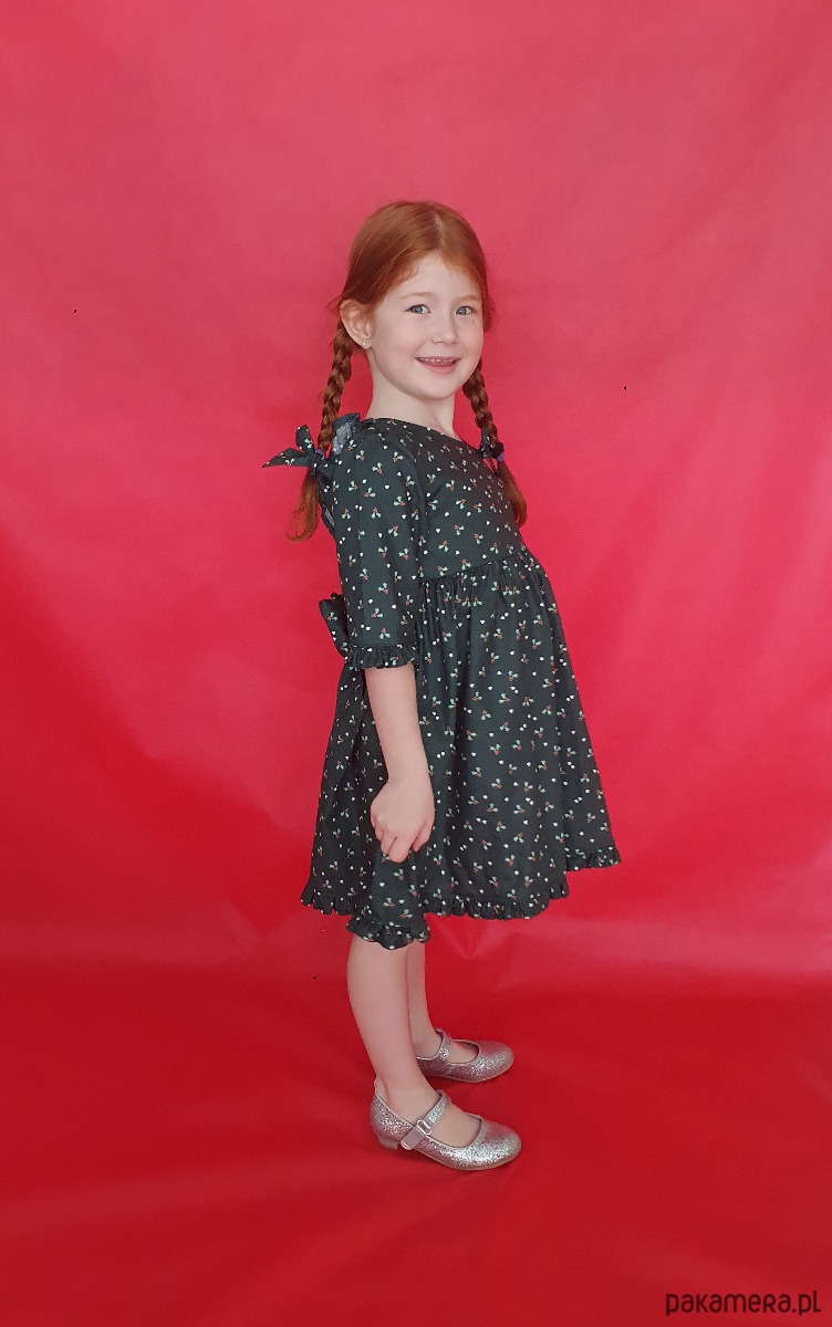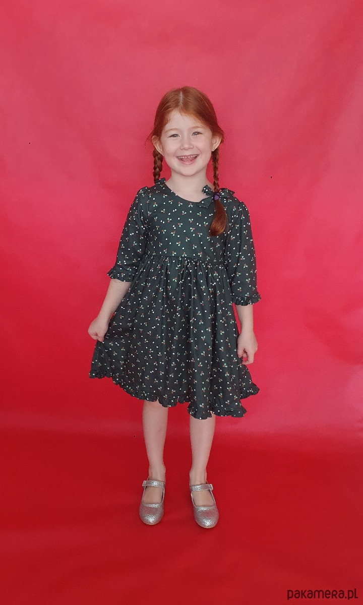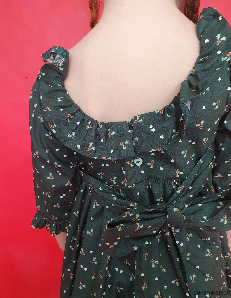 Świąteczna sukienka w kolorze ciemnej zieleni. Tkanina ma delikatny wzorek w ostrokrzew i serduszka.
