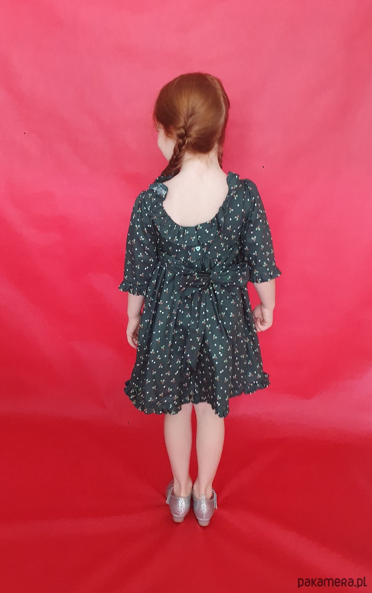 Jest to bardzo elegancka sukienka, uszyta z tkaniny bawełnianej. Rękawki, dół i tył wykończone są falbanką , z tyłu zaś zapinana jest na dwa guziczki w kształcie serduszka oraz zawiązywana ozdobna kokarda.