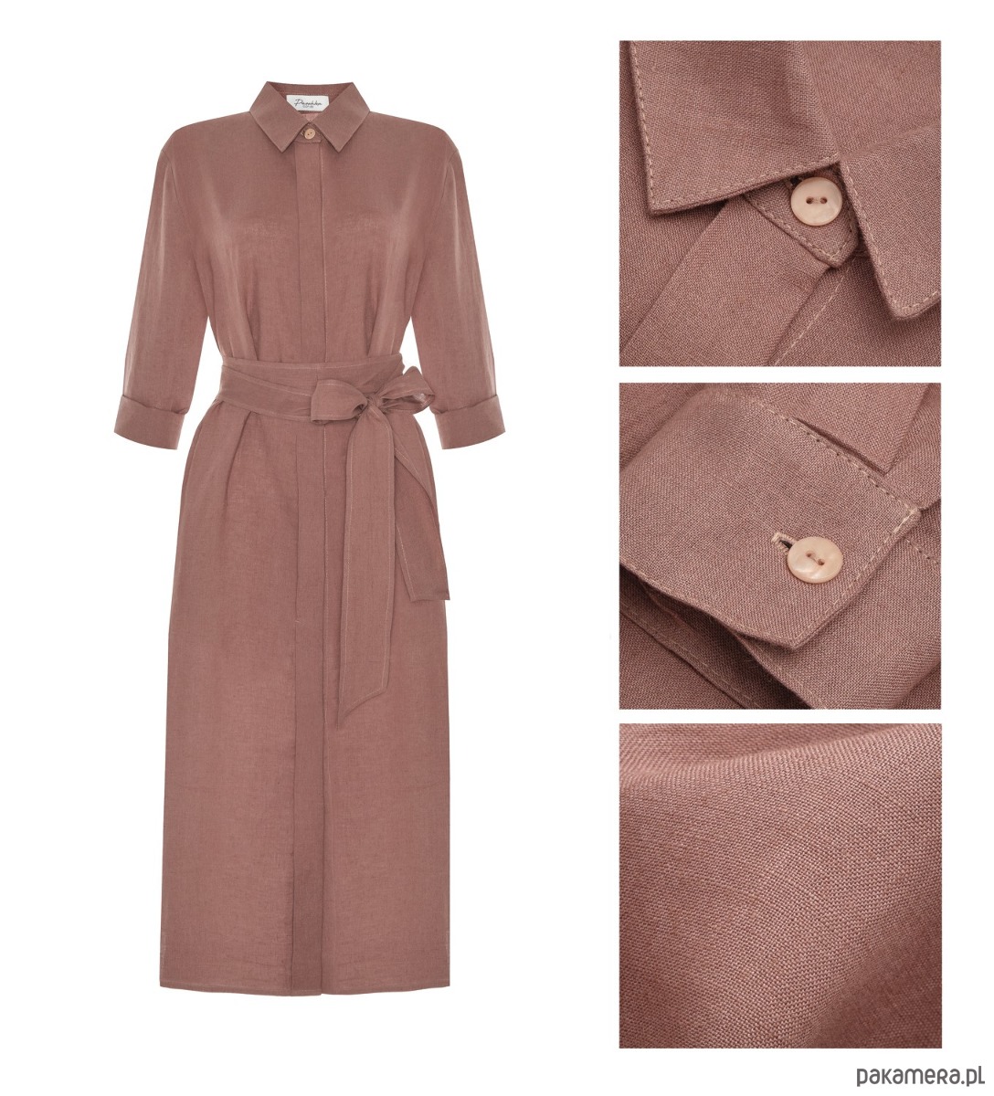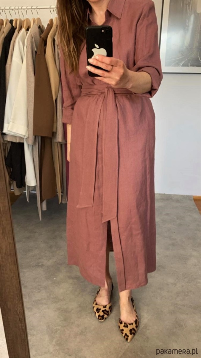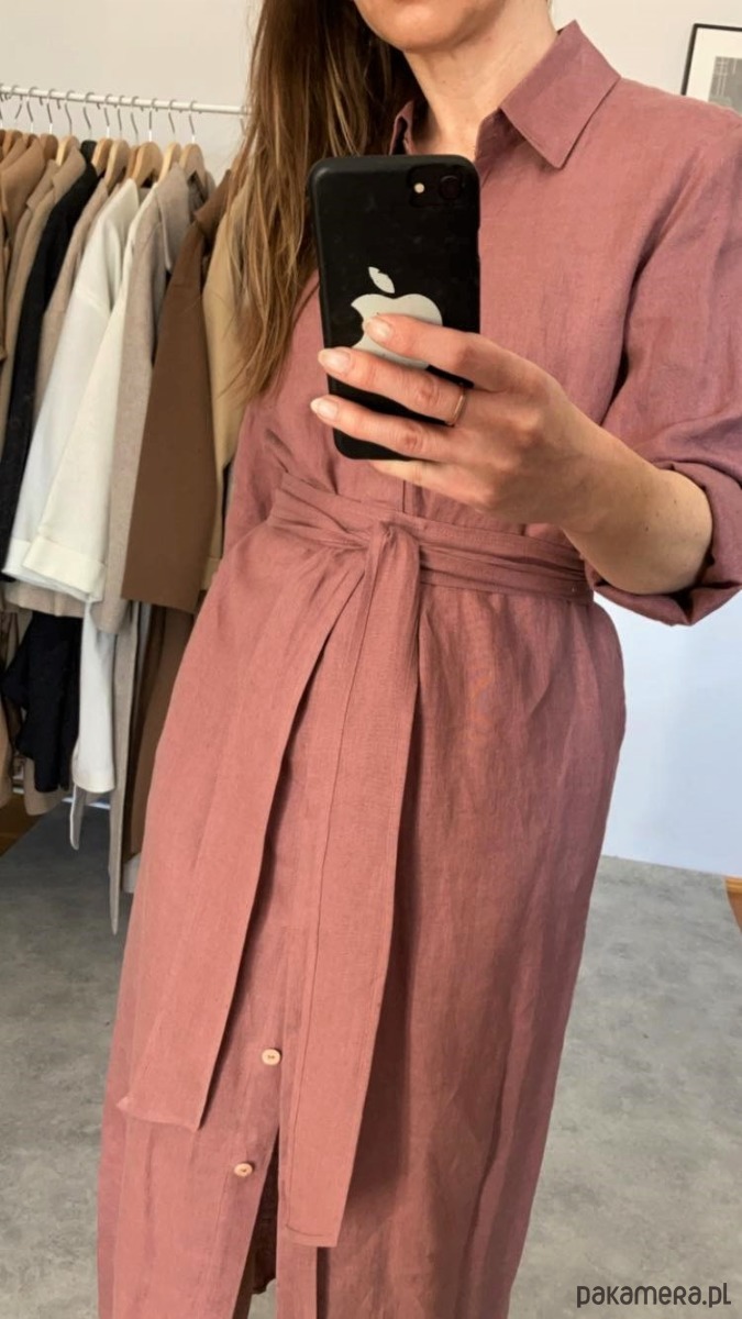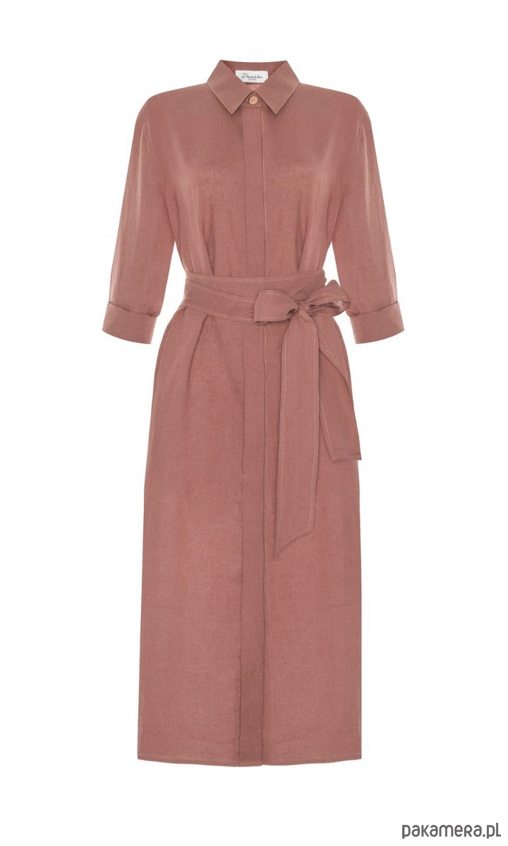 Posiada długie rękawy, szyte od środka szwem francuskim- idealnie wyglądają podwinięte. Guziki schowane są za listwą maskującą, co nadaje jej bardziej eleganckiego charakteru. Długi pasek pięknie podkreśla talię. Sukienka posiada kieszenie. Jest wygodna a jednocześnie elegancka.