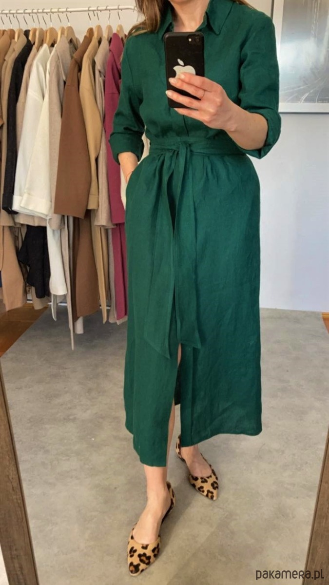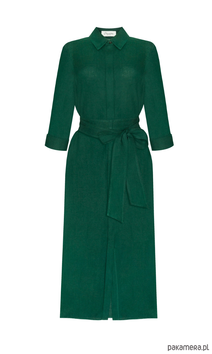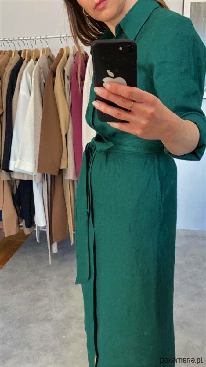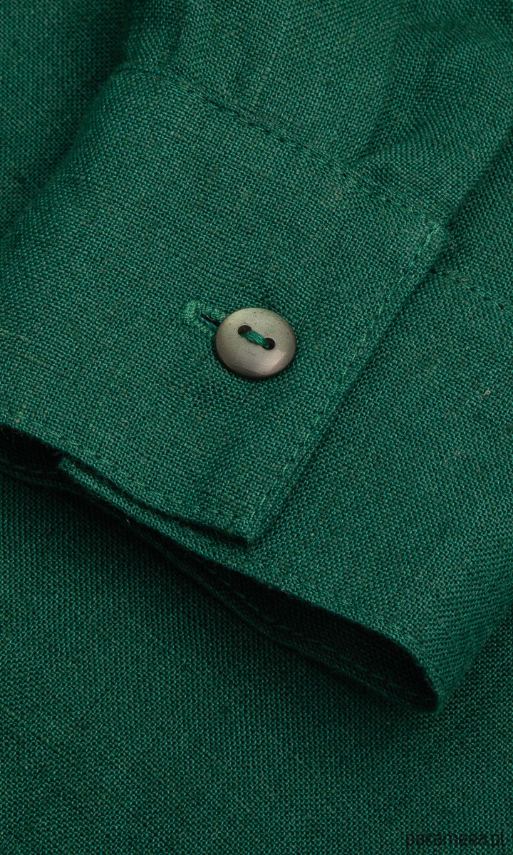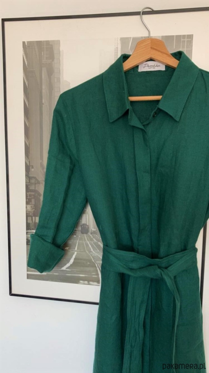 Klasyczna, prosta szmizjerka w przepięknym kolorze butelkowej zieleni. Lekka i przewiewna, idealna na lato, wykonana z wysokogatunkowego lnu specjalnie zmiękczanego, cienkiego, ale nie prześwitującego. Jest efektowna, a zarazem bardzo uniwersalna, możesz nosić ją do pracy i w letnie wieczory.