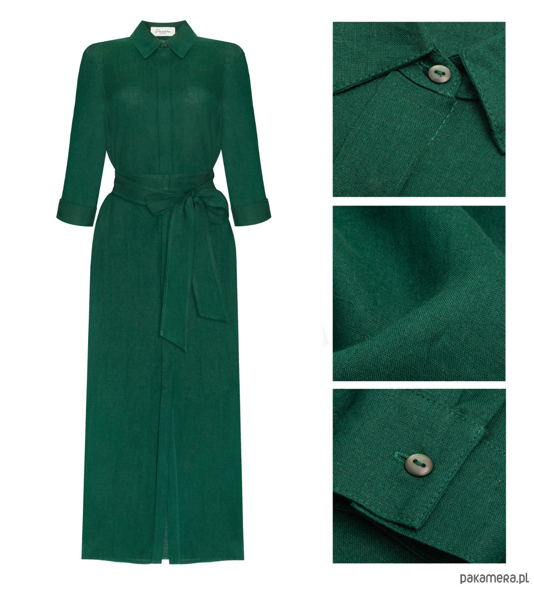 Posiada długie rękawy, szyte od środka szwem francuskim- idealnie wyglądają podwinięte. Guziki schowane są za listwą maskującą, co nadaje jej bardziej eleganckiego charakteru. Długi pasek pięknie podkreśla talię. Sukienka posiada kieszenie. Jest wygodna, a jednocześnie elegancka.