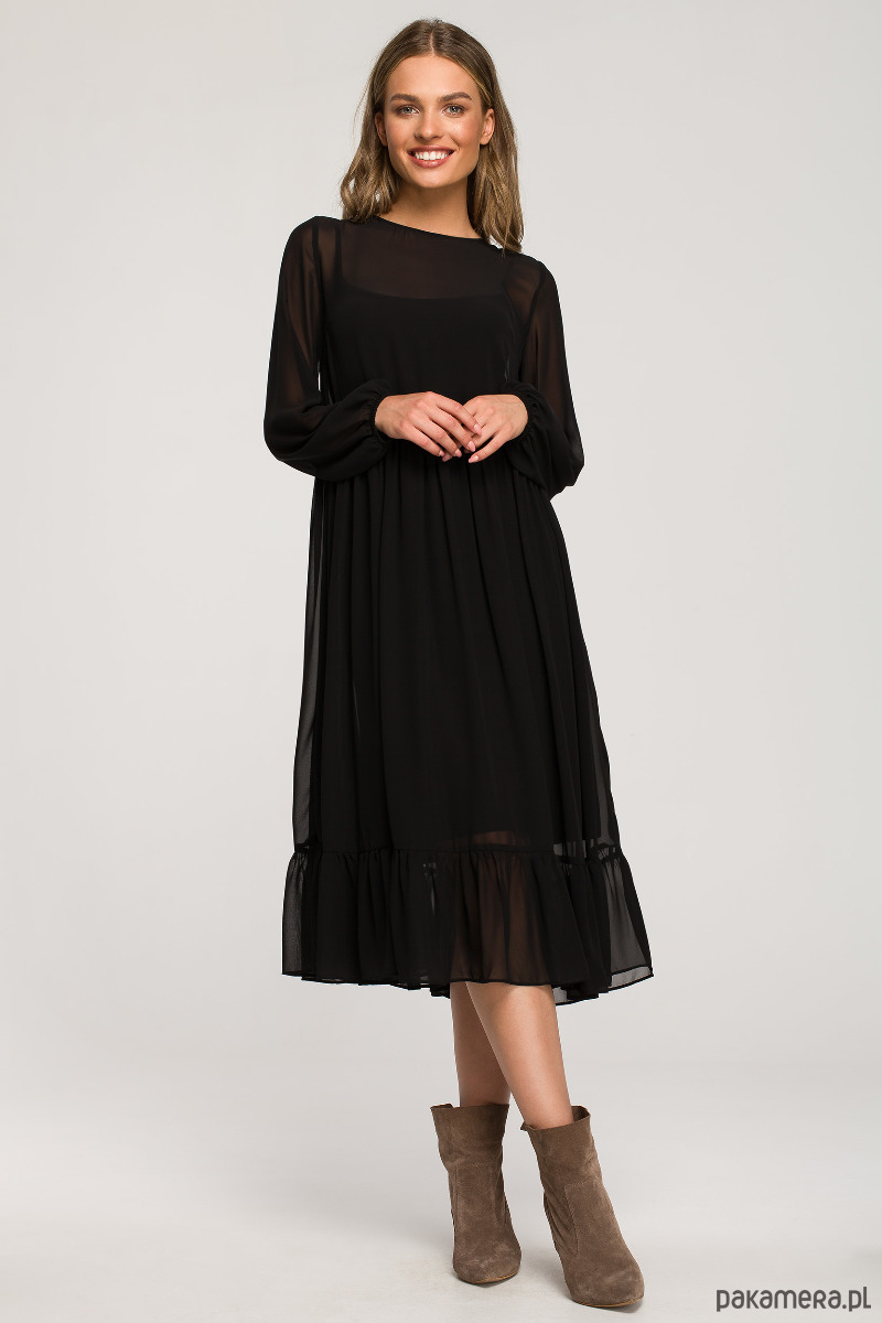 Dla miłośniczek romantycznych szyfonowych sukienek i nie tylko - wyjątkowa gładka sukienka z wysoką, marszczoną linią talii i falbaną, oraz z szerokimi rękawami zakończonymi gumką to pozycja obowiązkowa.