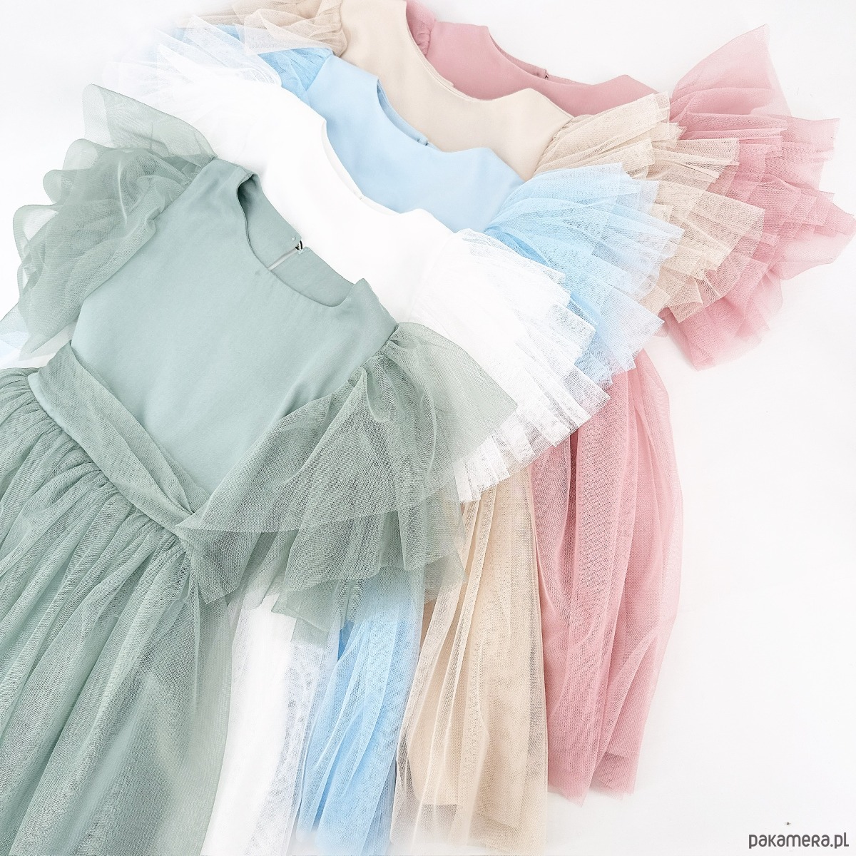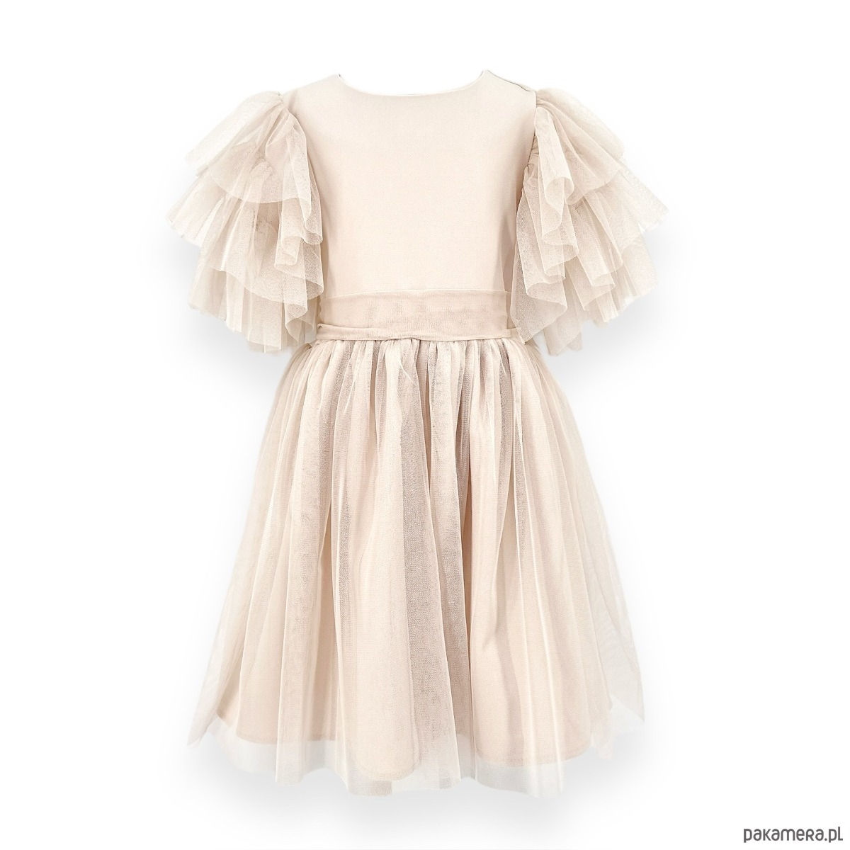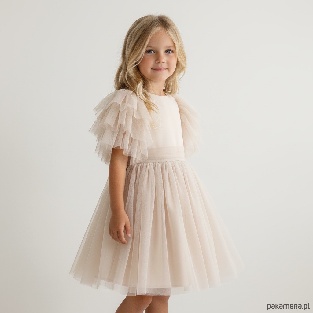 Sukienka Diana z miękkiego tiulu w kolorze jasny beż. Ręcznie szyta z wyselekcjonowanych tkanin, wygodna, komfortowa i bardzo efektowna. Zapinana na złoty guziczek z tyłu, zdobiona falbanami na rękawku, z paskiem tiulowym, wiązanym na kokardę. Idealna na przyjęcie weselne, urodziny, komunię, chrzest.