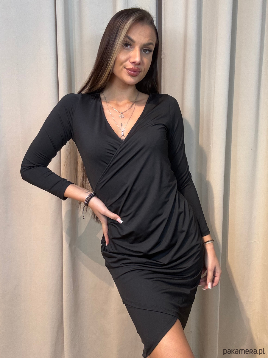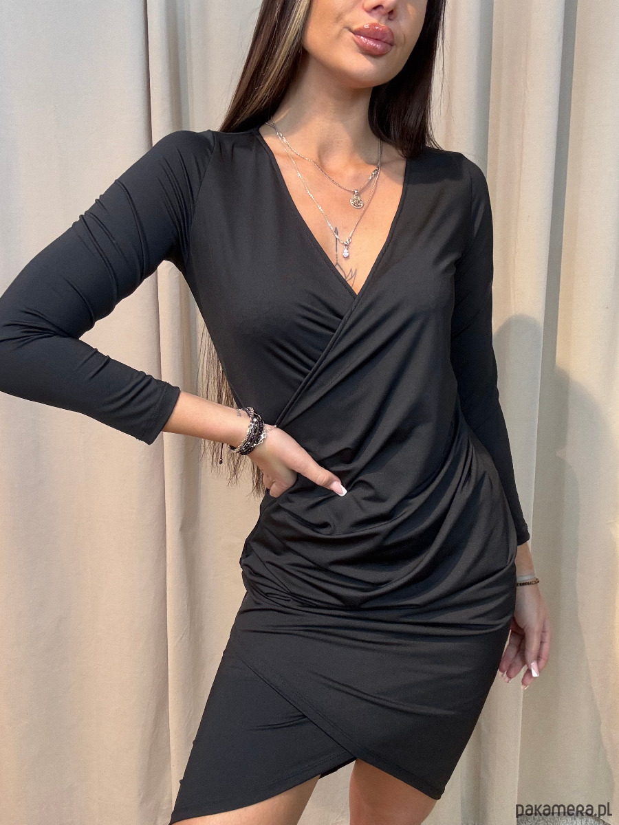 Sukienka z długim rękawem, zakładana z przodu kopertowo. Dzianina elastyczna, ale nie przezroczysta. Marszczona w okolicach brzucha, co daje efekt maskujący. Sukienka ma lekko krótszy przód, w kształcie trójkąta. Przyjemnym dodatkiem do całości jest broszka w postaci motylków. Do wyboru motylki czarno - białe gładkie lub w kratę, w uwagach dla sprzedającego proszę dokonać wyboru, w przeciwnym razie zostanie wysłana losowo.