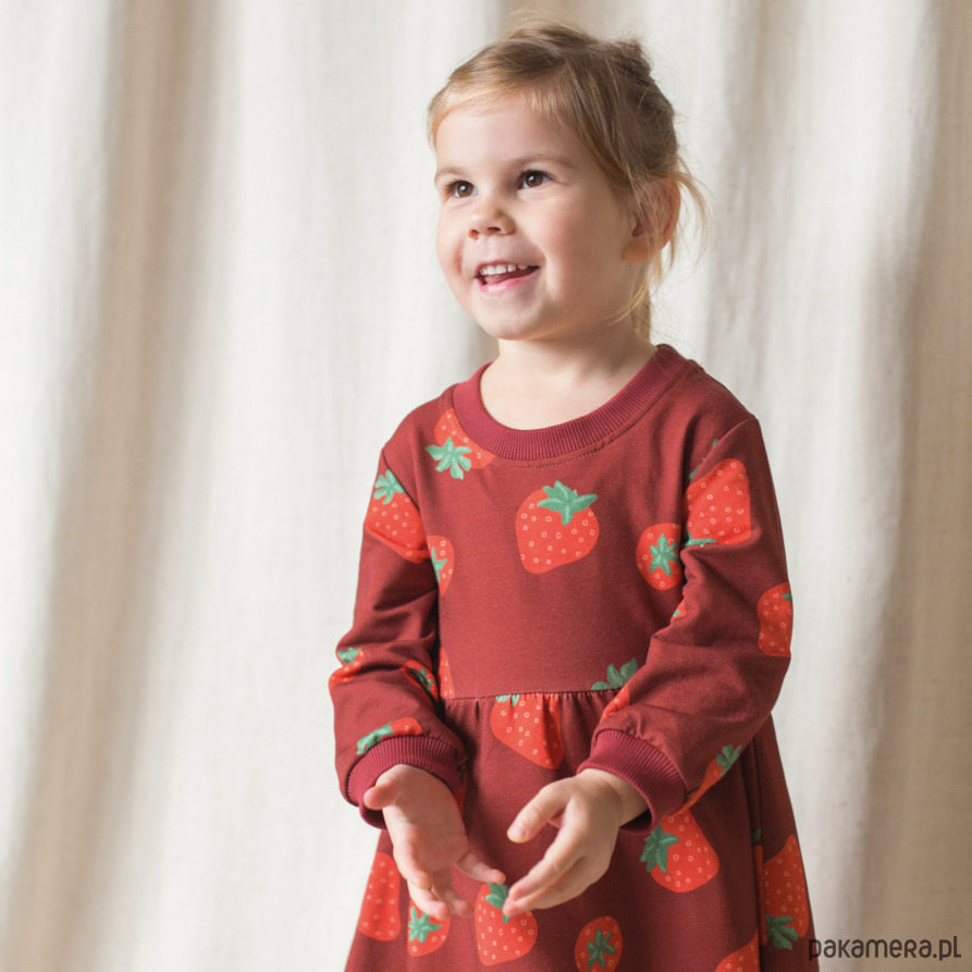 Truskawkowy zawrót głowy! Sukienka na codzień i od święta. Swobodny fason z długim rękawem, odcięcie w talii, rozkloszowana, idealna do kręcenia :). Wykonana z wysokiej jakości bawełny organicznej z certyfikatem GOTS, wyróżniająca się naszym uroczym truskawkowym wzorem. Idealna do stylizacji przez cały rok! Zaprojektowany wzór nadrukowany jest cyfrowo, dzięki czemu nadruk jest niedrapiący i przyjemny dla skóry malucha.