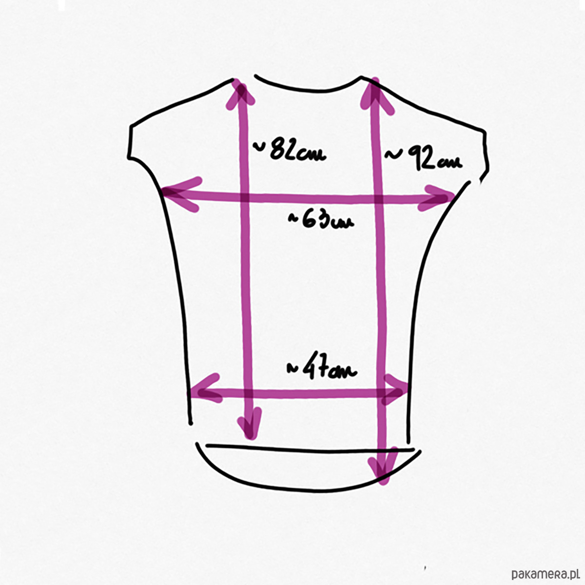 Szerokość pod pachami ok.: 63cm, długość z przodu: ok.: 82cm, tył, ok.: 92cm.