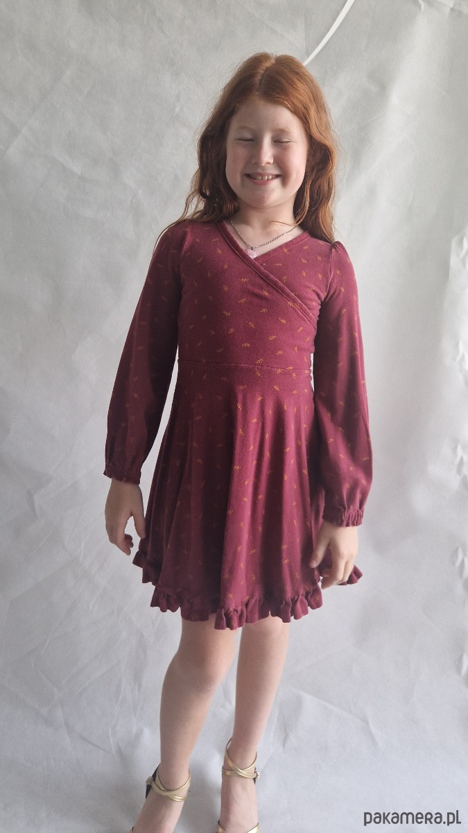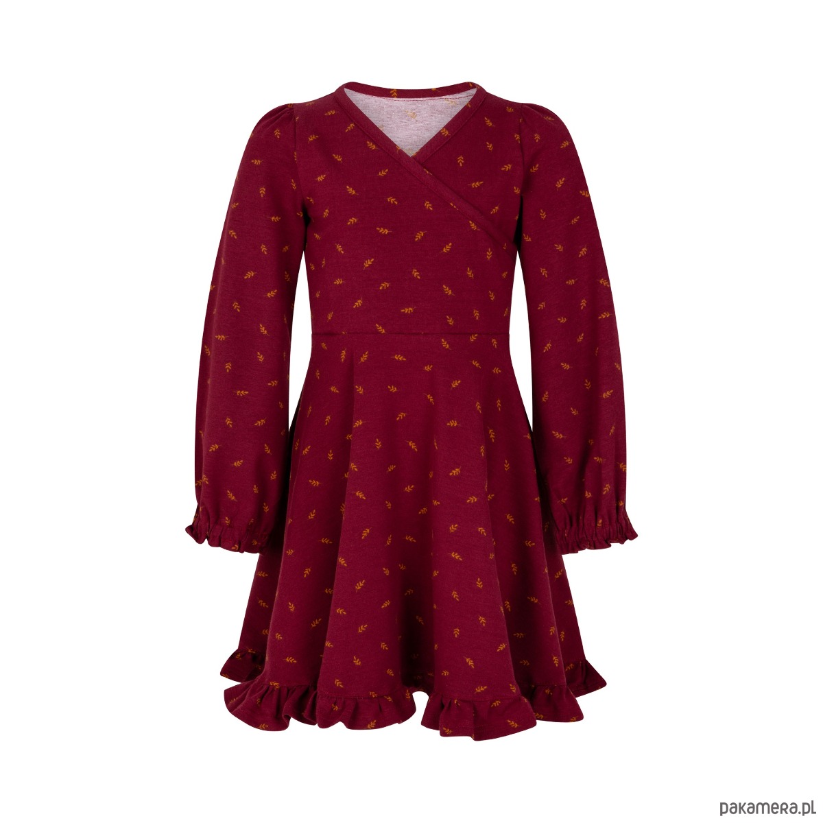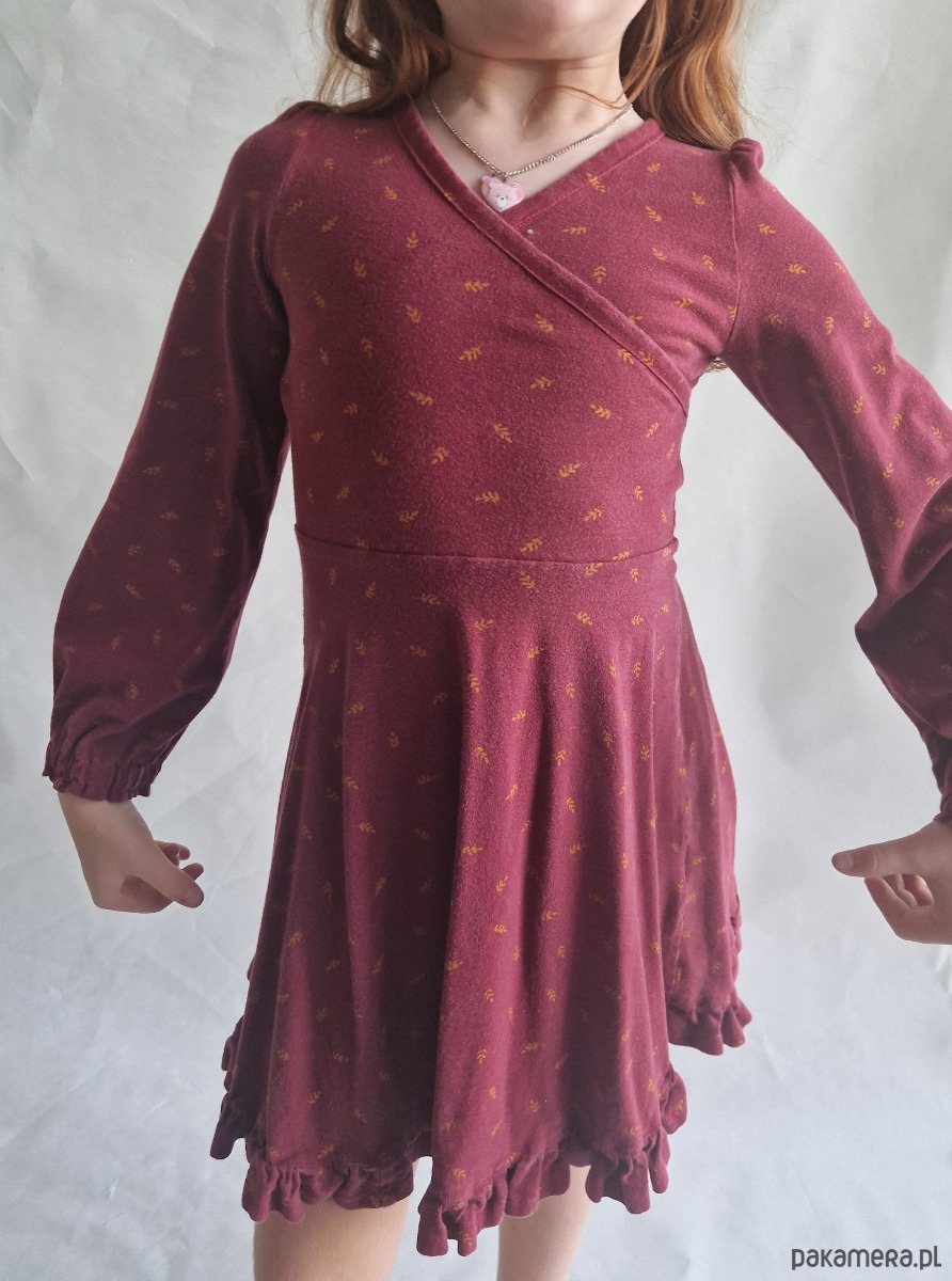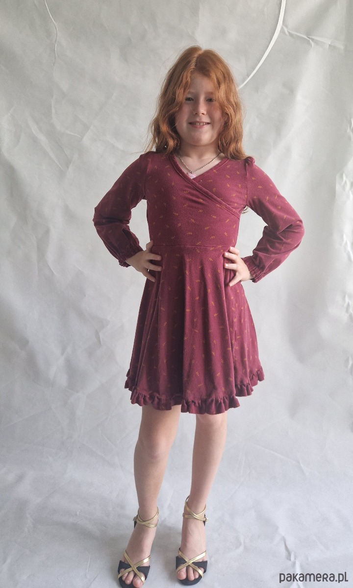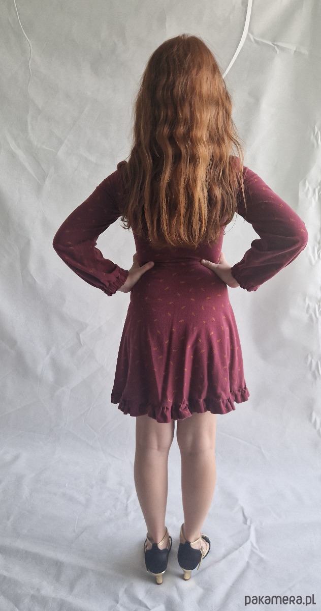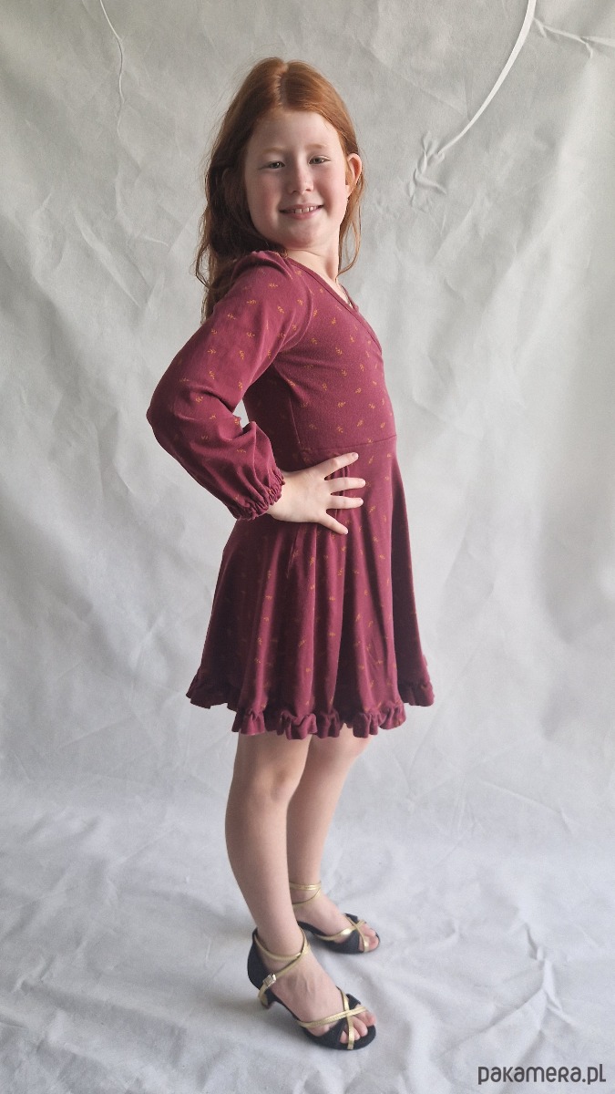 Sukienka ma długi rękaw wykończony gumeczką. Dół sukienki uszyty jest z połowy koła z mała falbanka. Góra sukienki uszyta jest z dwóch części które nakładają się na siebie, wykończona jest pliską.
