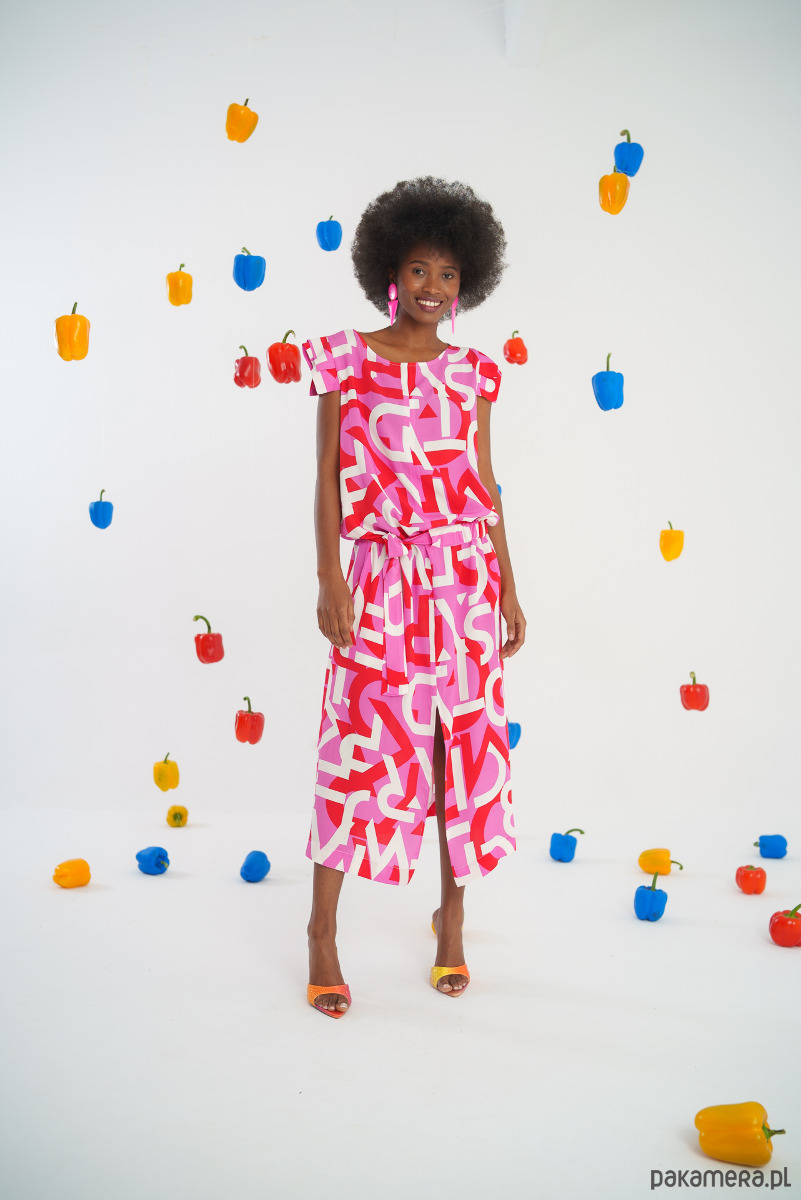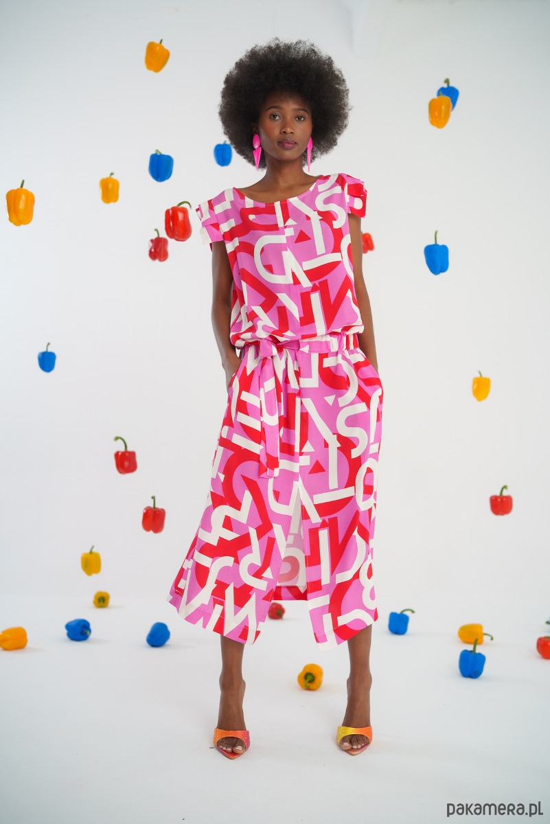 Wzór: Żywy, graficzny print w intensywnych kolorach różu i czerwieni z białymi akcentami, który przyciąga wzrok i dodaje energii każdej stylizacji.