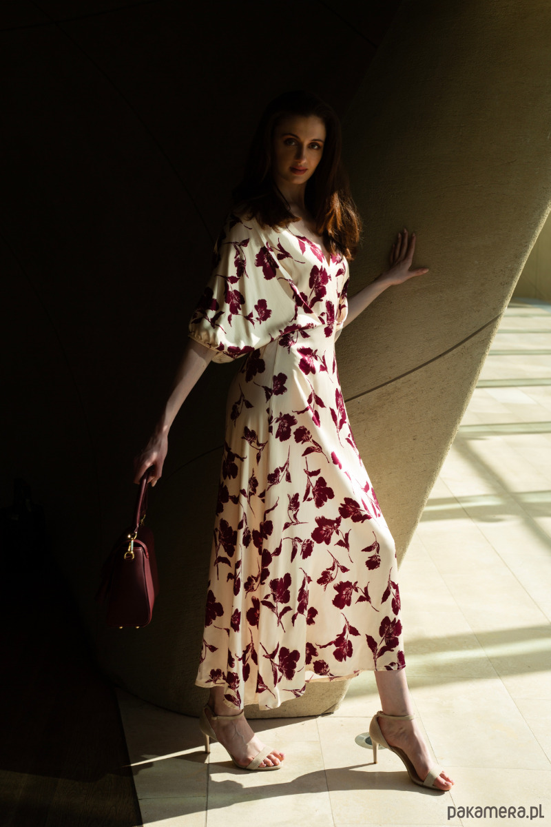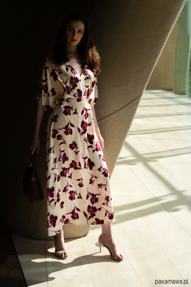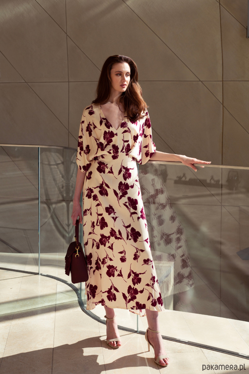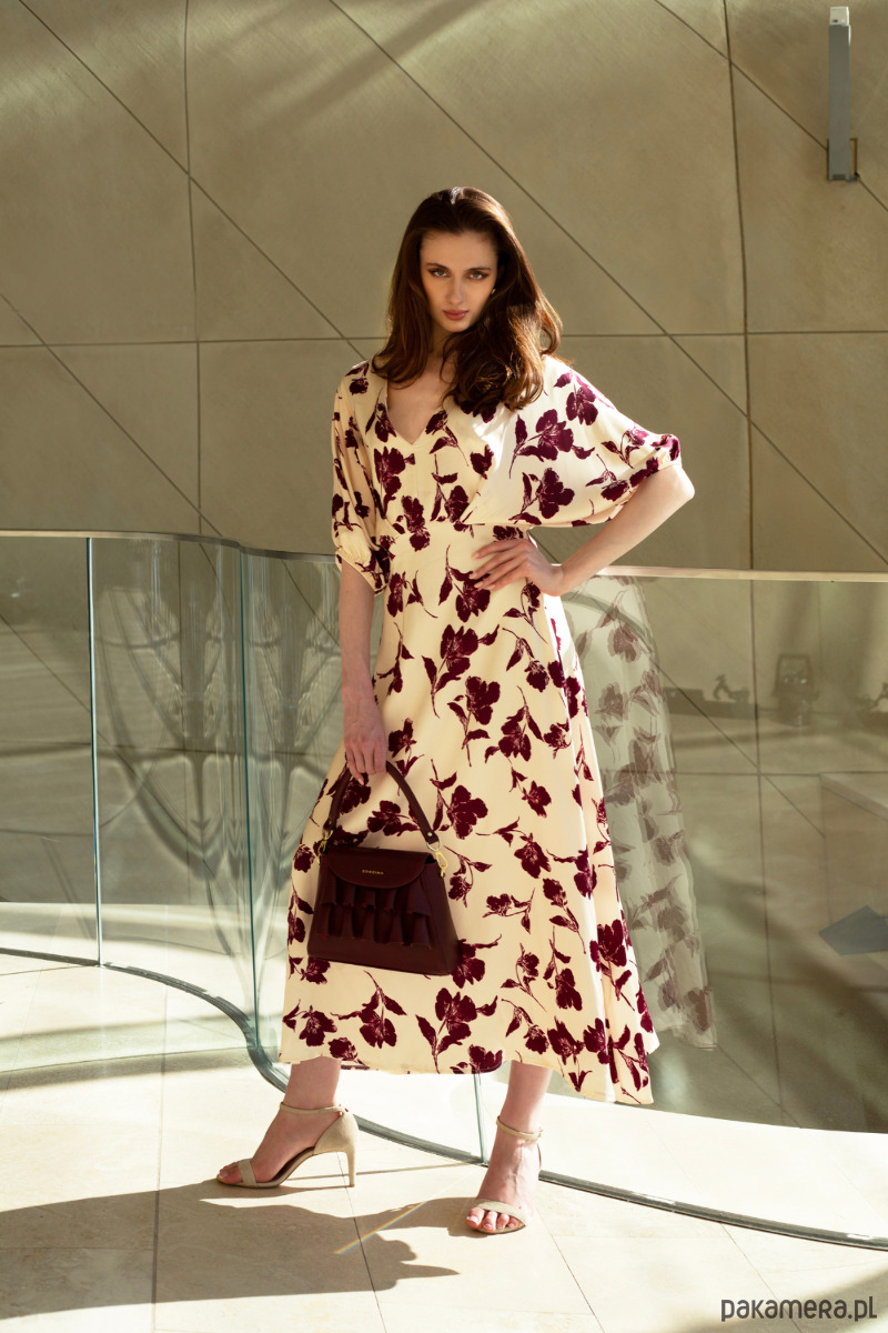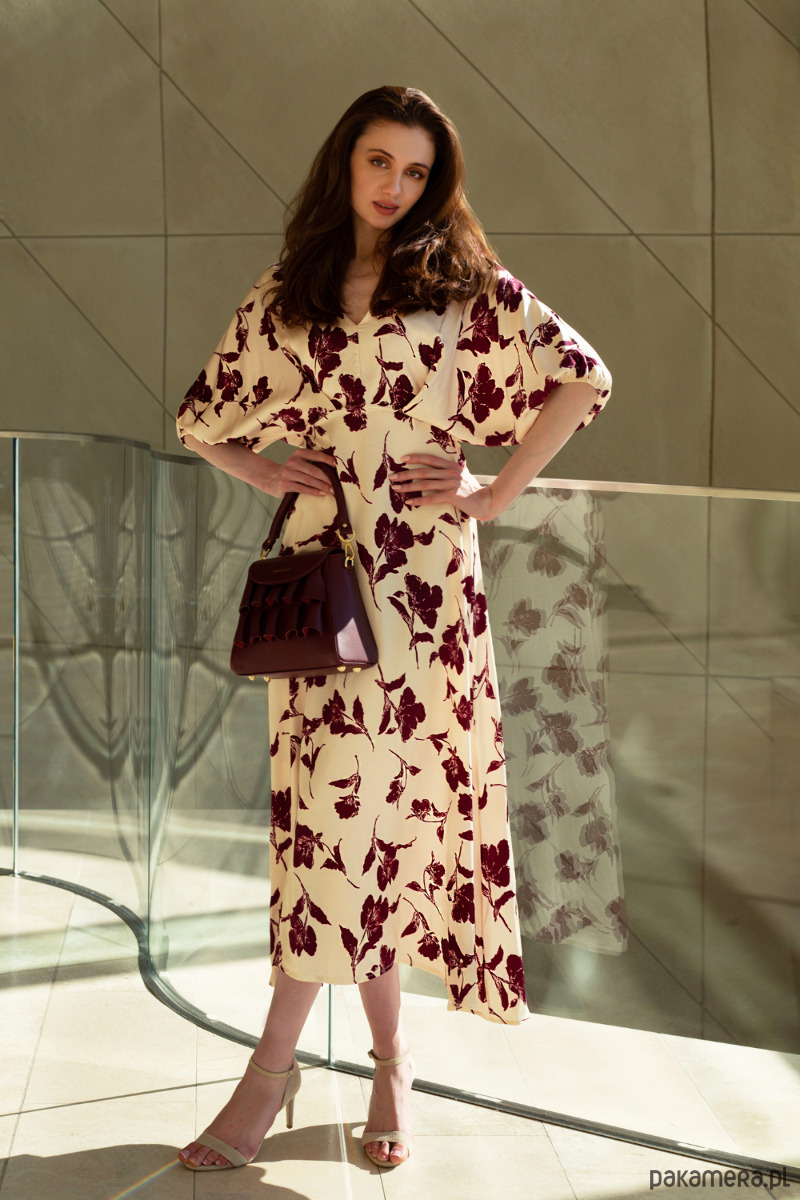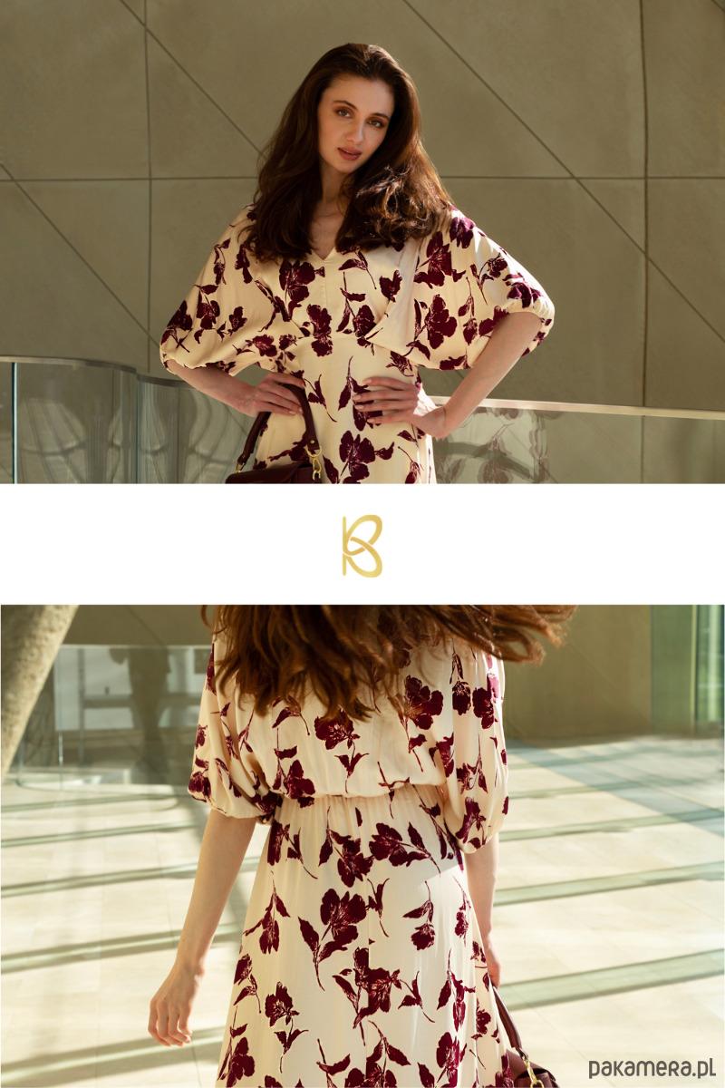 Sukienka midi w odcieniu kremowym z bordowym, roślinnym wzorem. Wykonana z lekkiego materiału, który delikatnie układa się na sylwetce. Luźne rękawy o długości 3/4 oraz subtelne marszczenie w talii nadają całości kobiecego charakteru. Rozkloszowany dół zapewnia swobodę ruchów, dekolt w kształcie litery V.