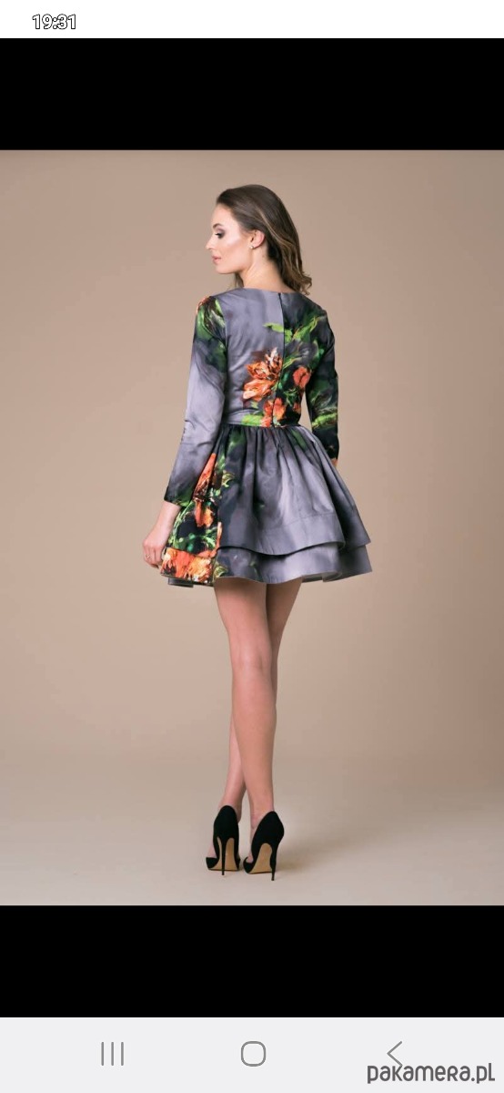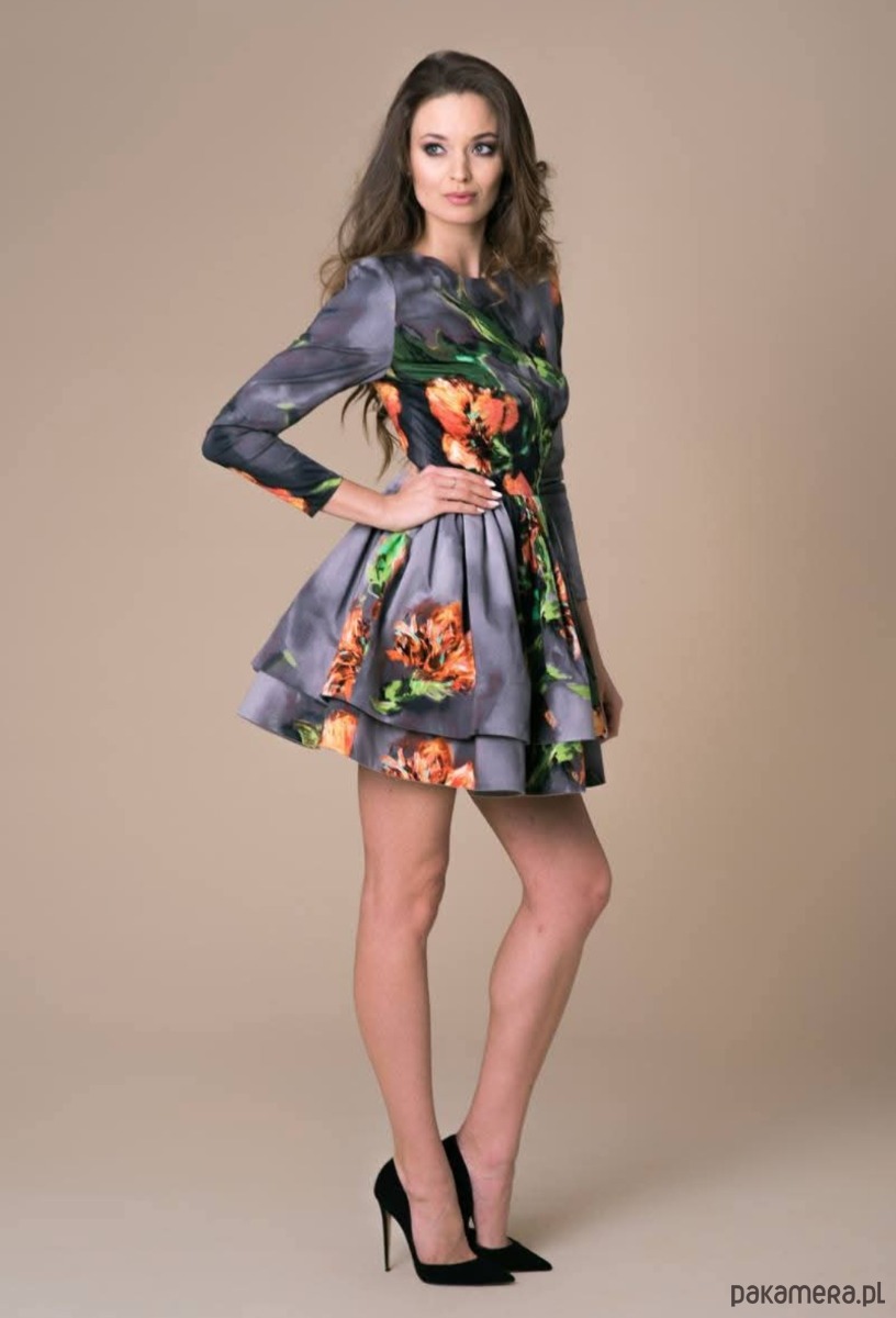 Sukienka uszyta jest z bawełny satynowej w kwiecisty wzór. Falbany podszyte sa taśmą z krynoliny dlatego tak pięknie odbija i faluje