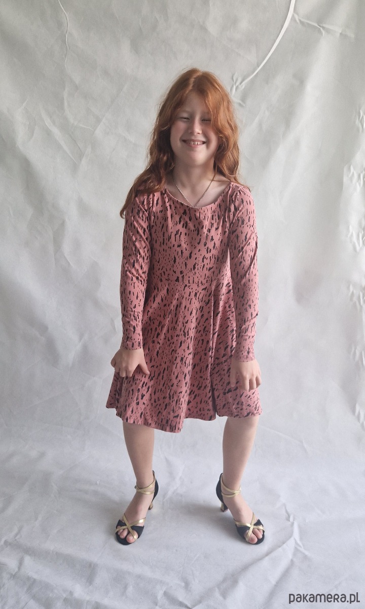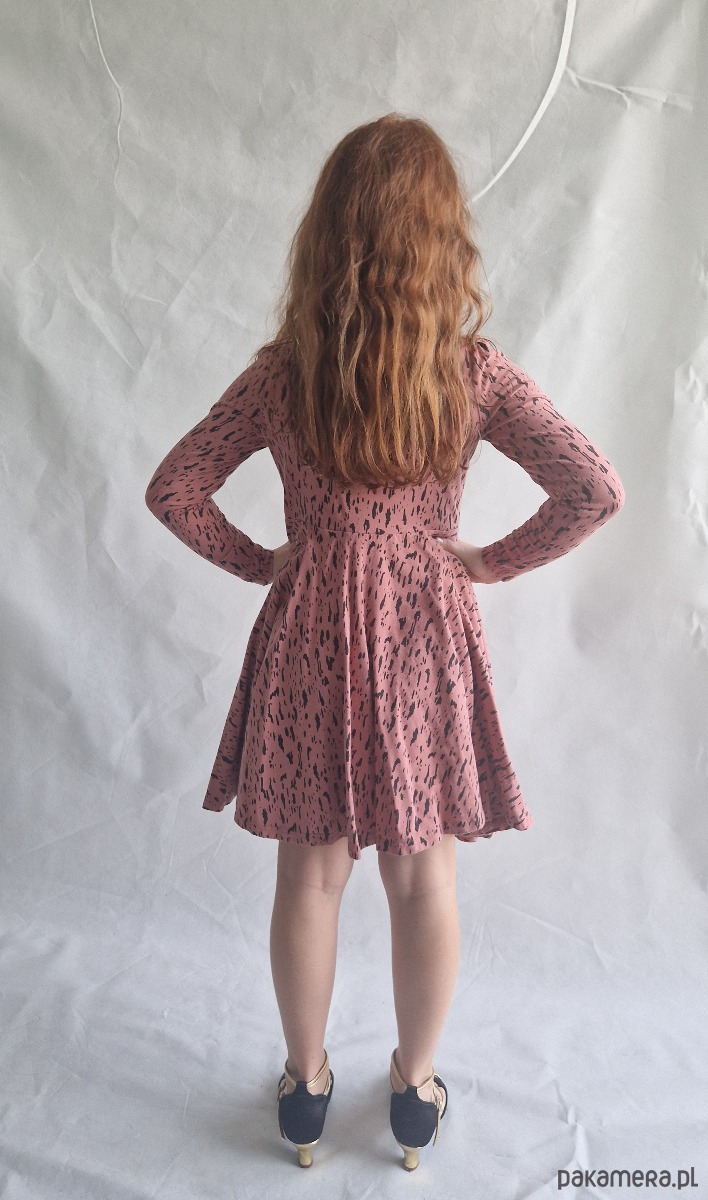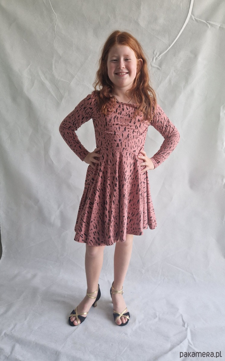 Sukienka z długim rękawem z delikatna pufką, dekolt wykończony lamówka. Dół sukienki jest uszyty z koła, wiec sukienka bardzo fajnie się kręci.