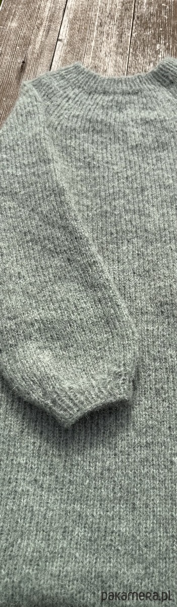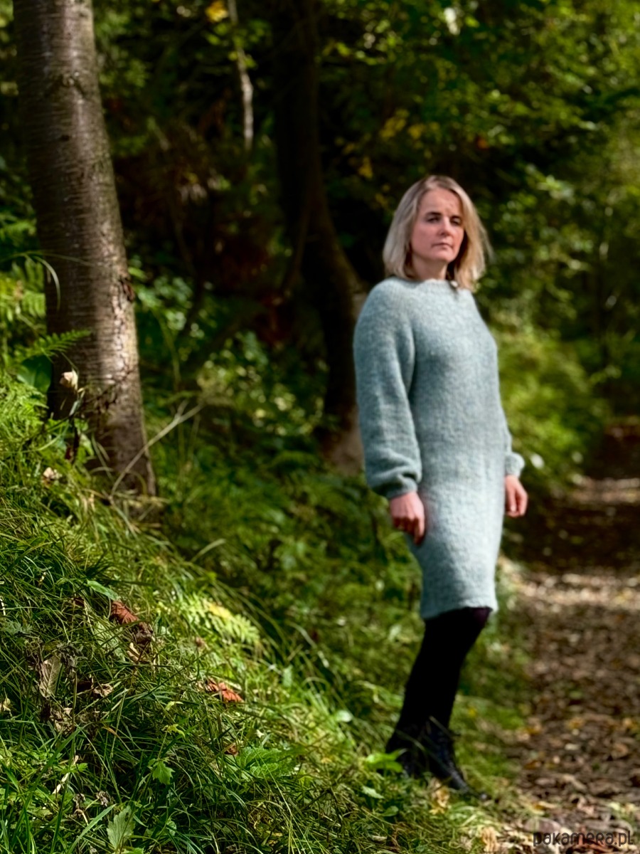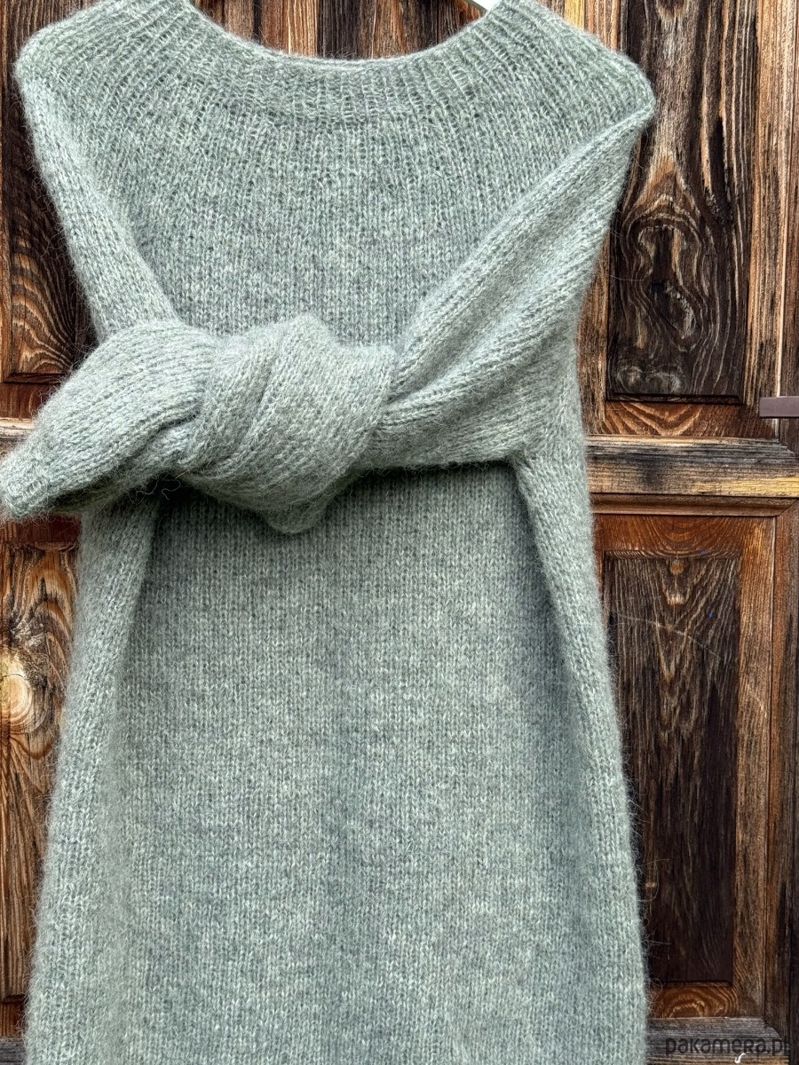 Sukienka wykonana ręcznie z alpaki (77%) i jedwabiu (23%) w kolorze szalwi. Dostępna jedna sztuka.