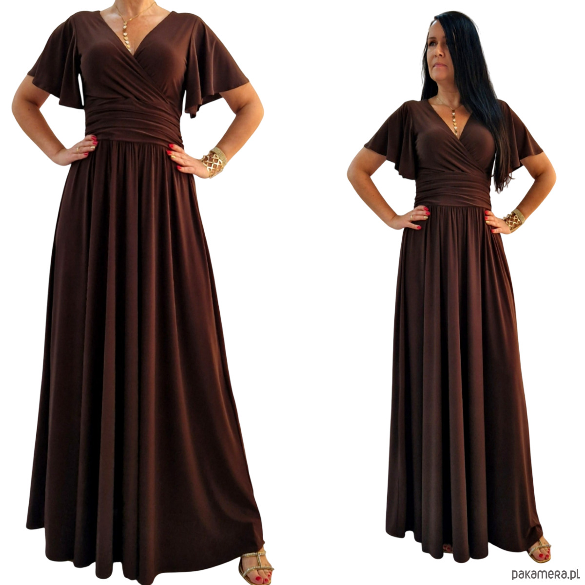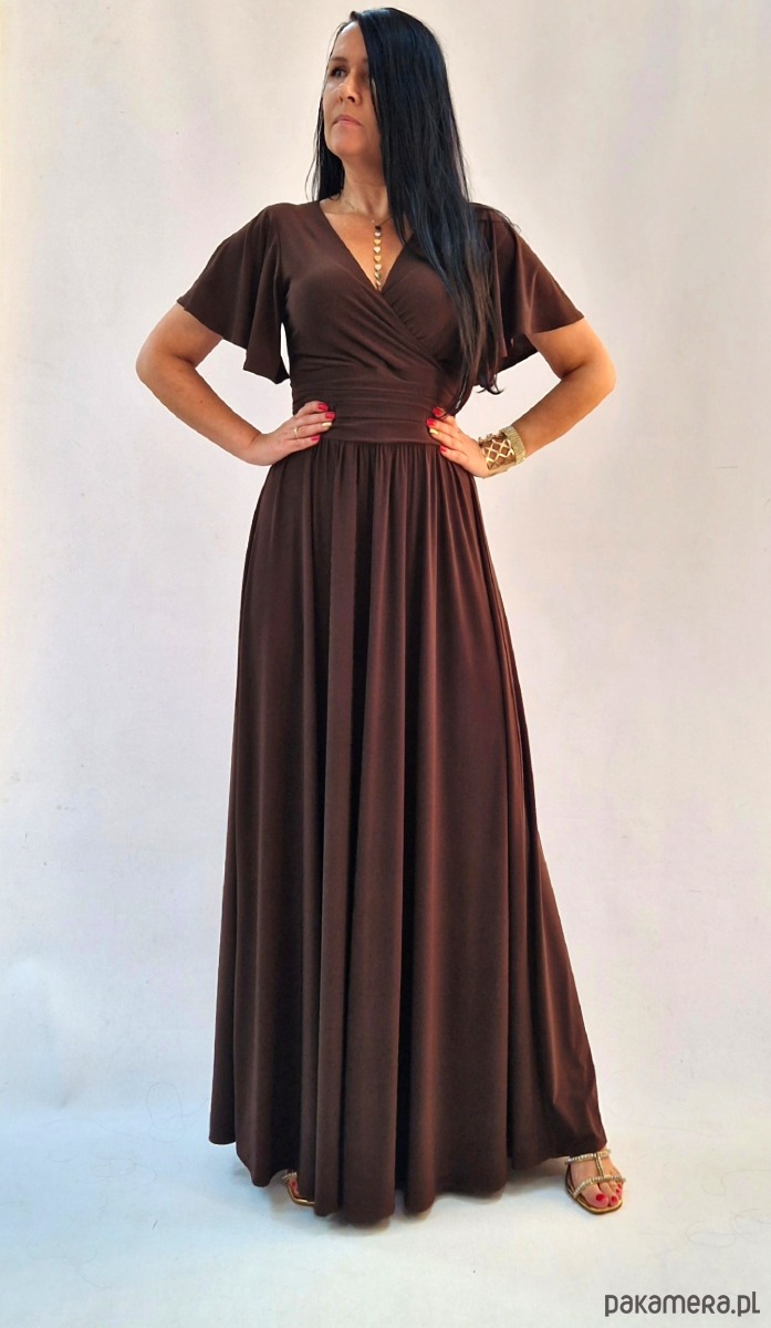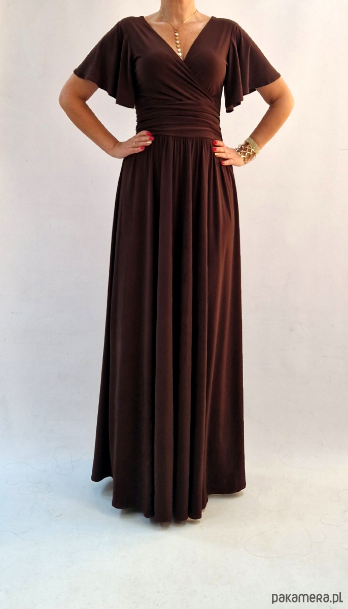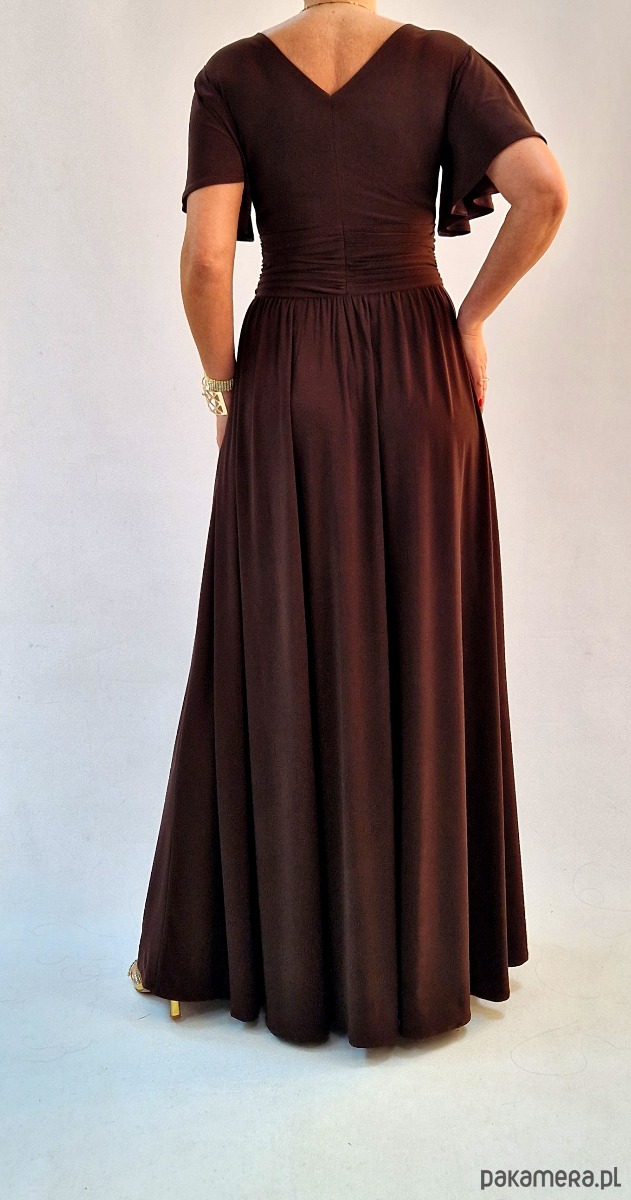 Sukienka wieczorowa maxi czekoladowy brąz drapowana 36-56