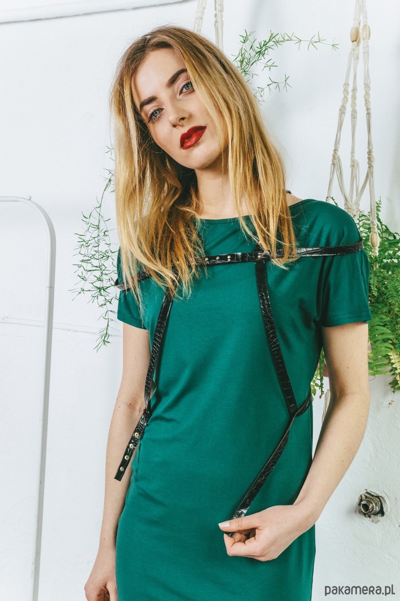 Wygodna sukienka z przyjemnej elastycznej dzianiny wiskozowej produkowanej w Polsce. Z tyłu znajduje się ciekawy dekolt oraz na środku dołu pęknięcie. Produkt w całości uszyty w Polsce. Skórzana uprząż na zdjęciu nie jest dodawana w cenie sukienki. Dostępne już ostatnie sztuki.