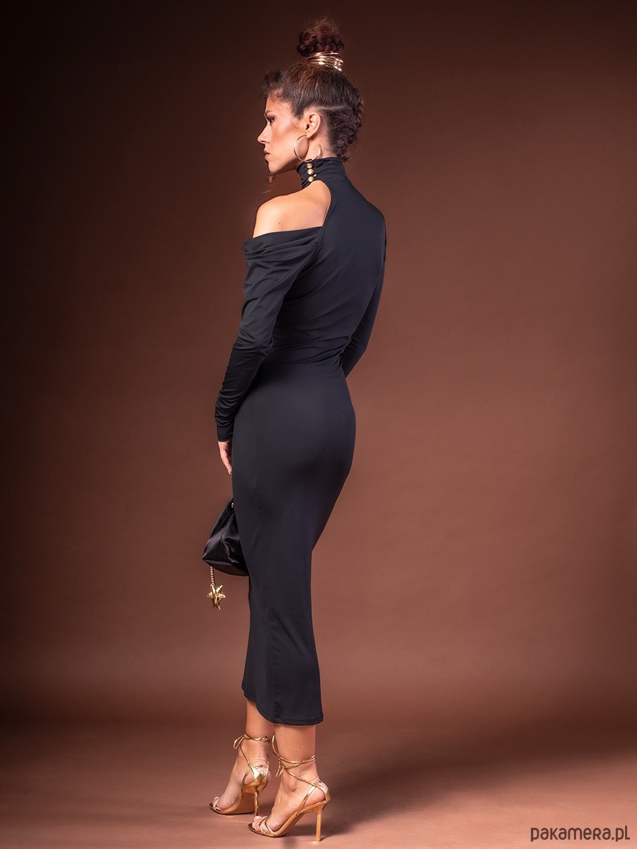 Sukienka o długości 7/8. Idealnie podkreśla sylwetkę. Górę kreacji skonstruowałam asymetrycznie, udrapowałam jeden z rękawów i odsłoniłam ramię. Całość wykończona jest dobrze przylegającym golfem z ręcznie przyszytymi ozdobnymi, złotymi guzikami.