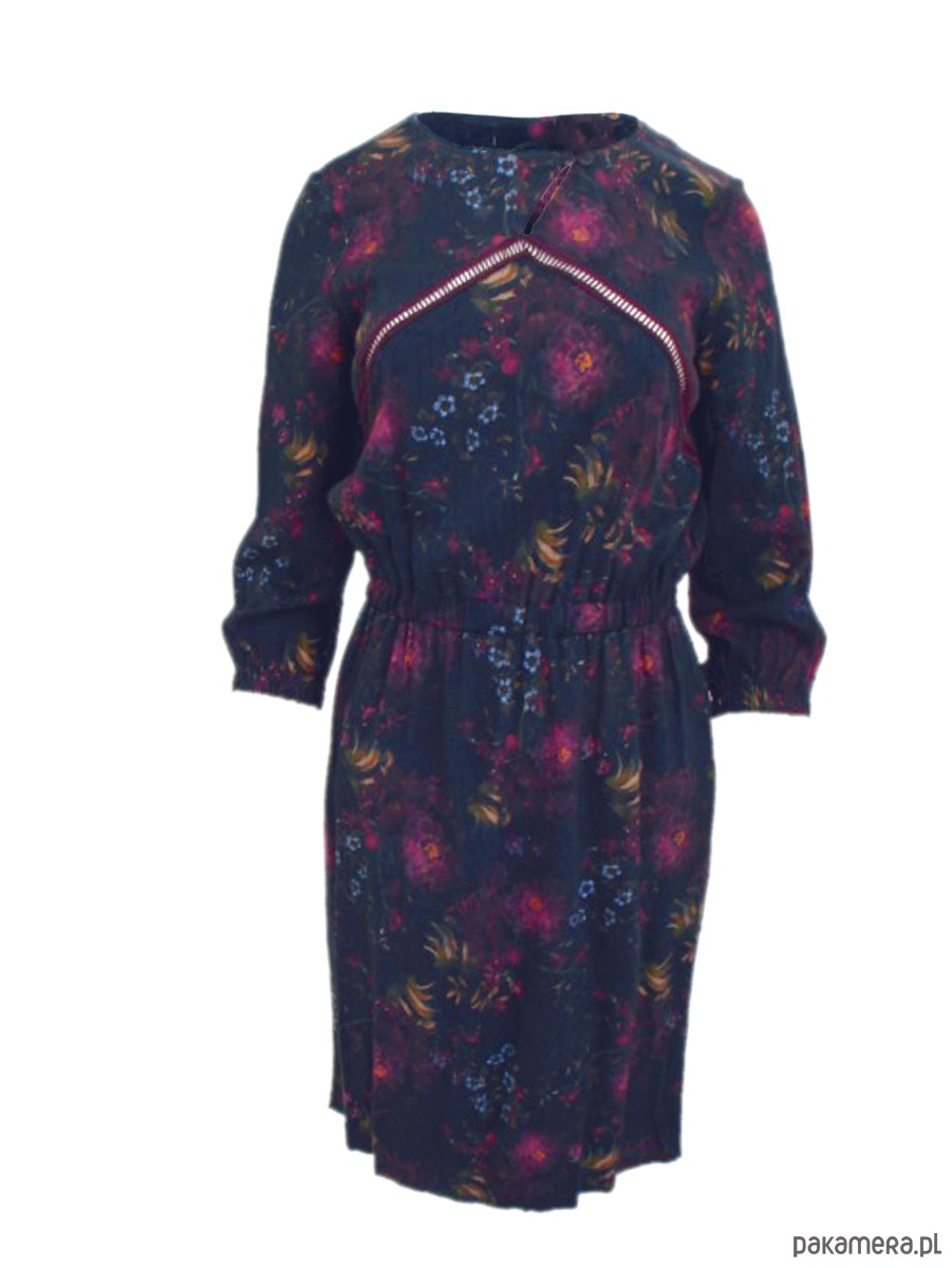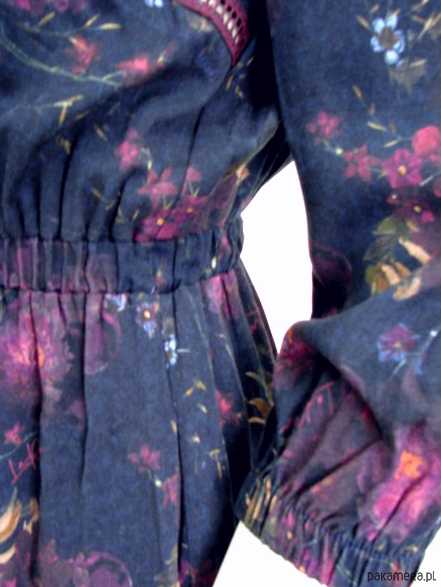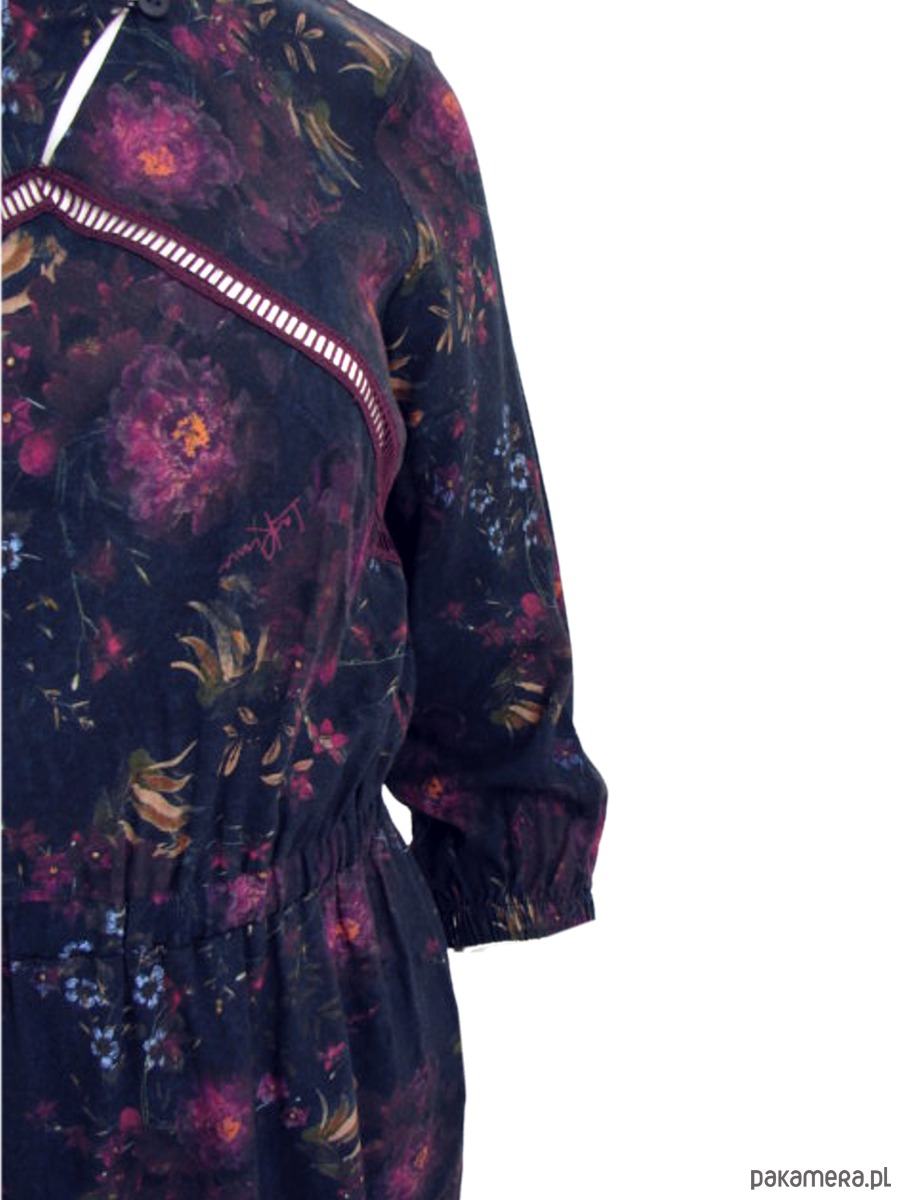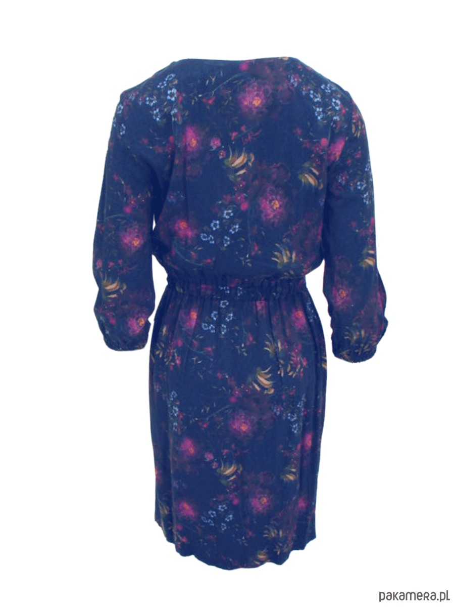 Sukienka z komfortowej tkaniny wiskozowej. Kolorowy druk jest unikatowy i autorski. Sukienka doskonale sprawdzi się w mieście i na wakacjach. Sukienka luźna, swobodna, super wygodna. Na przodzie dekolt z zapięciem po skosie na guziczek. Na przodzie ozdobną gipiurą, typu drabinka. W szwach bocznych obowiązkowo kieszenie. W talii delikatna gumka. Rękawy długości 3/4 ujęte w gumkę .