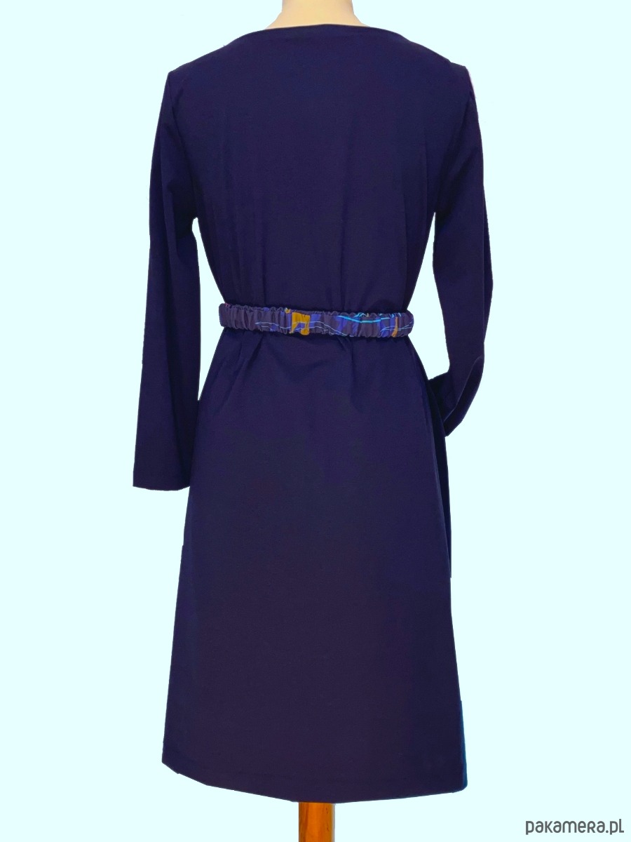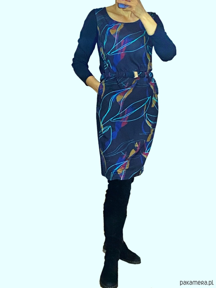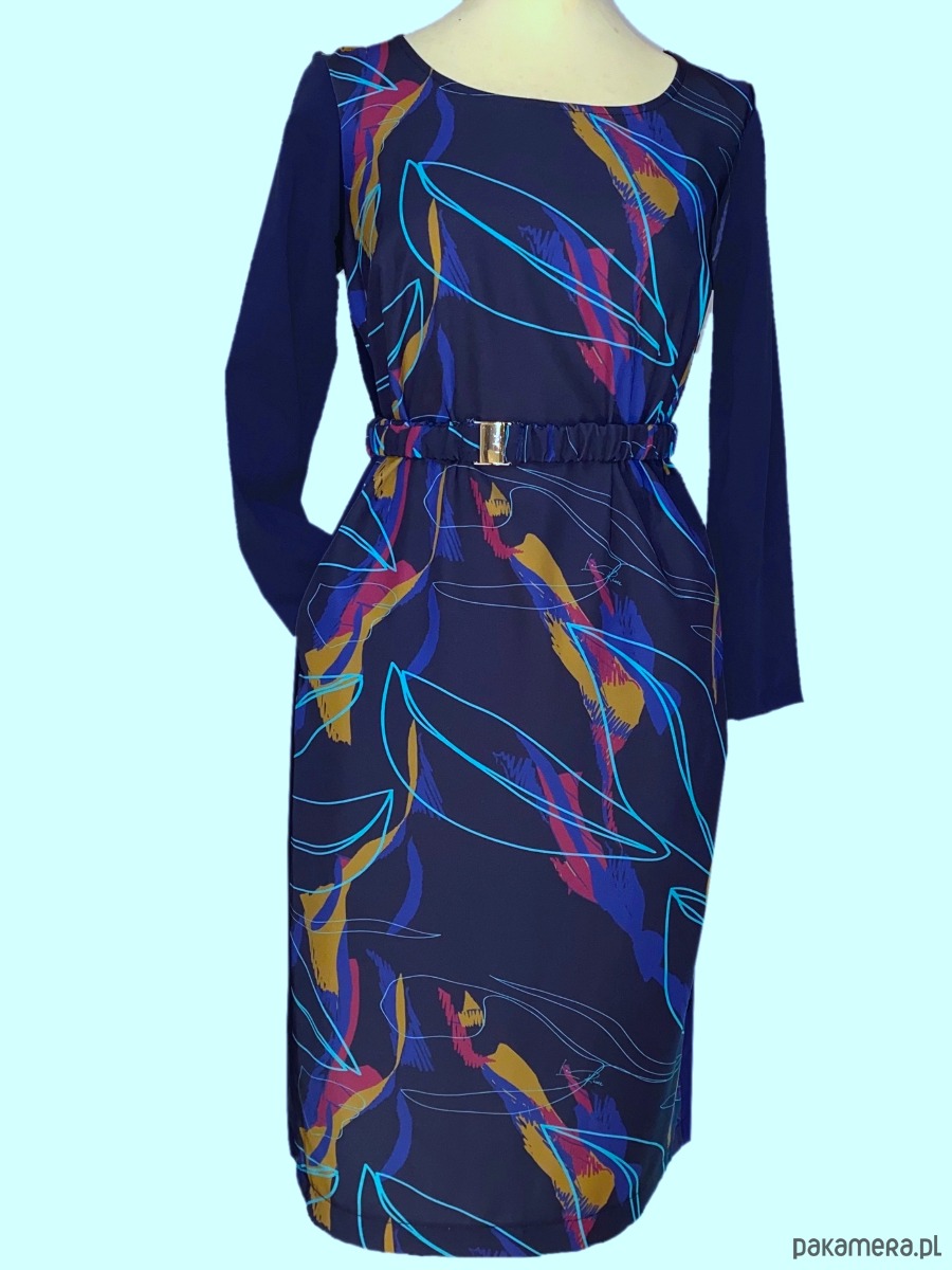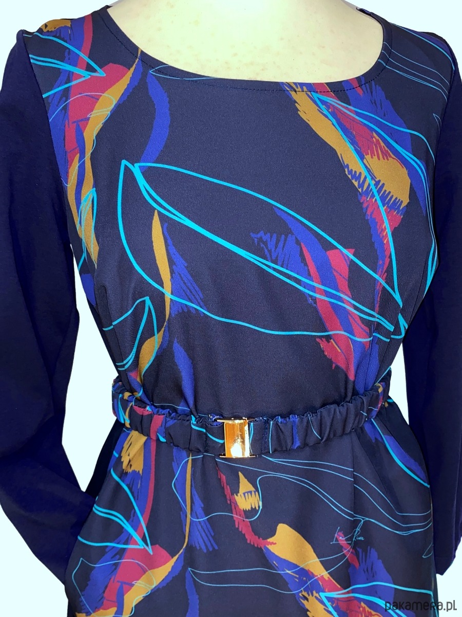 Sukienka z przodem drukowanym połączonego z dzianiną. Tkanina z autorskim abstrakcyjnym drukiem, w kolorze granatu. Dzianinowa część to rękawy i tył. Tkanina jest użyta na przodzie i w elastycznym pasku. Dzięki takiej kombinacji sukienka doskonale układa się na sylwetce. Rękawy długie. Druk w stylu abstrakcyjnym dodaje nowoczesnego uroku sukience.