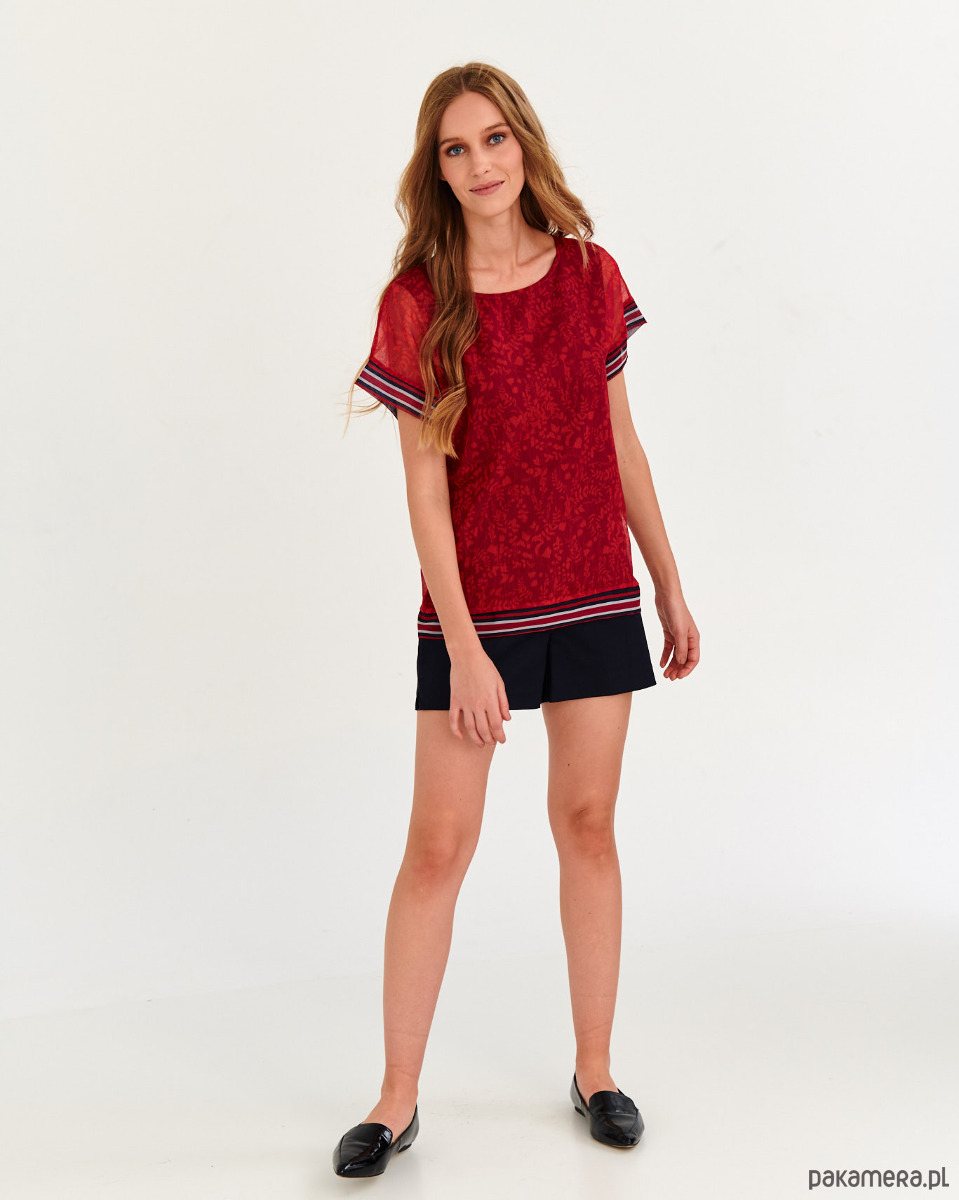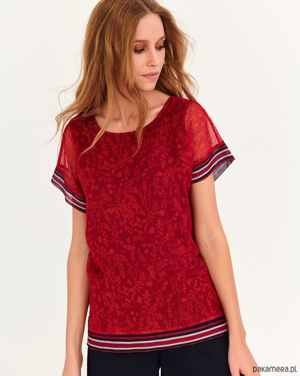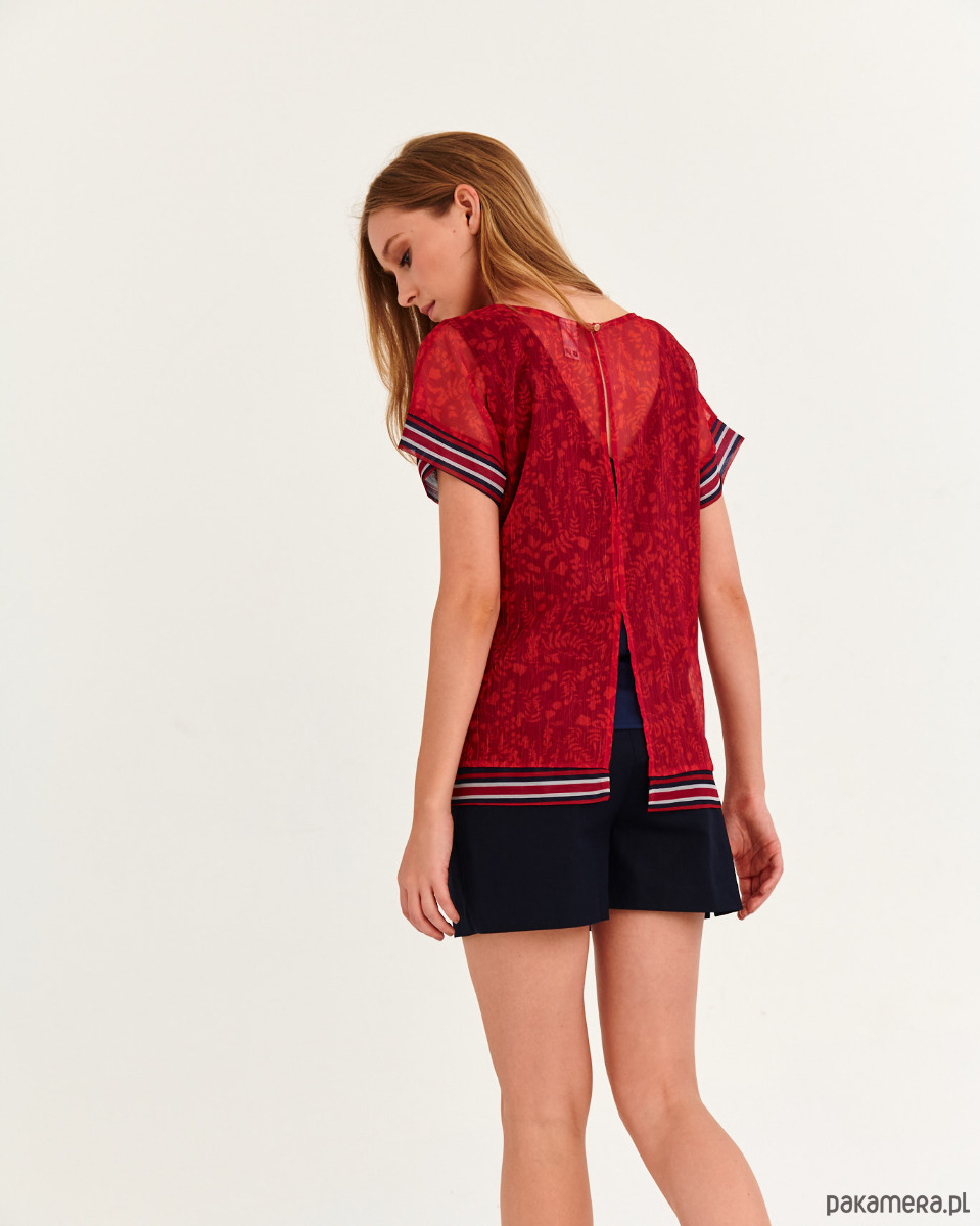 Szyfonowa bluzka . Prosty, niedopasowany krój wykończony szyfonem w paseczki . Dekolt przód okrągły i tył w literę V. Wewnątrz wiskozową koszulka. Zapina na tyle na guziczek. Ze względu na przezroczystość w środku delikatna, wiskozowa podszewka. Autorski druk w drobne kwiaty kwiaty.