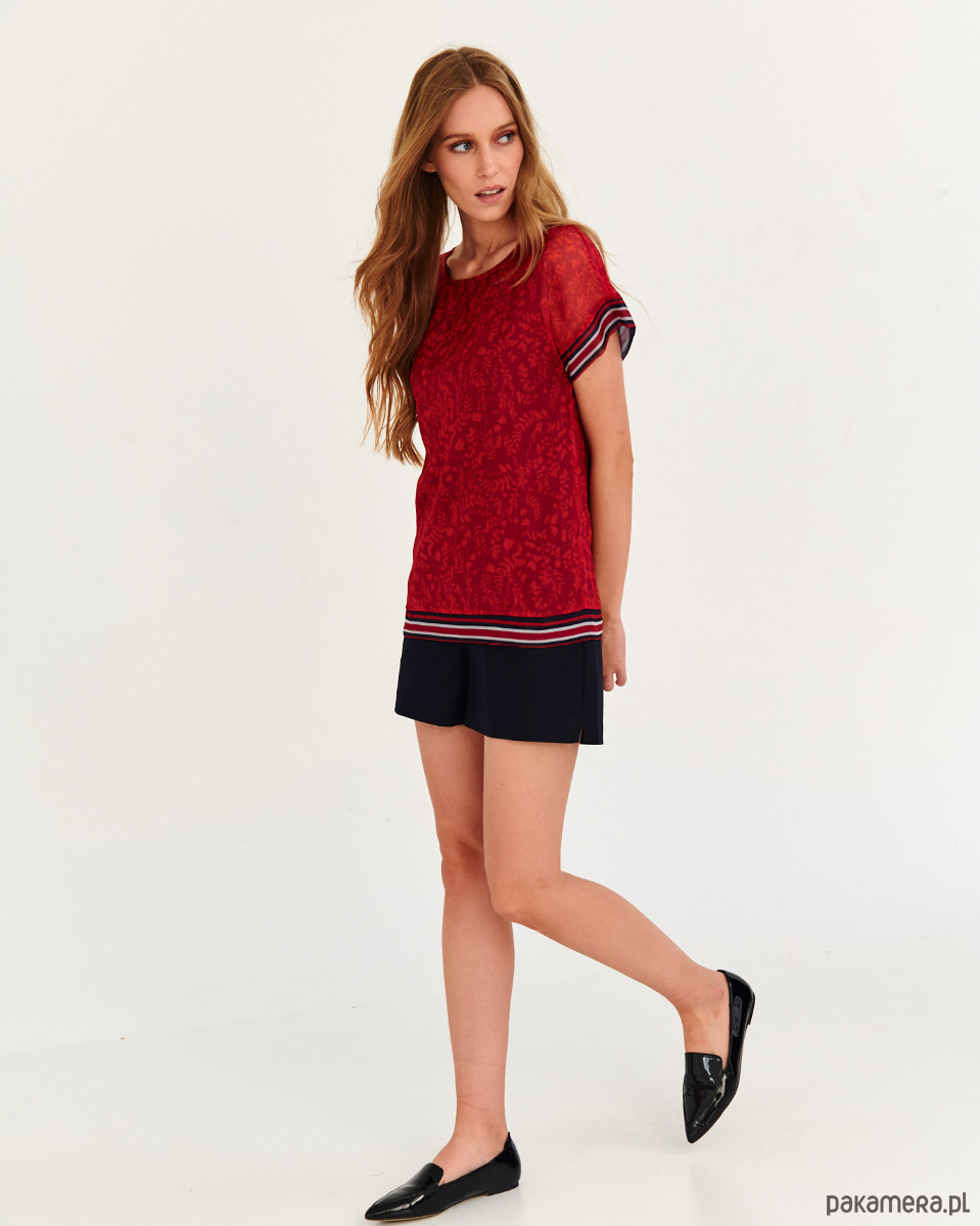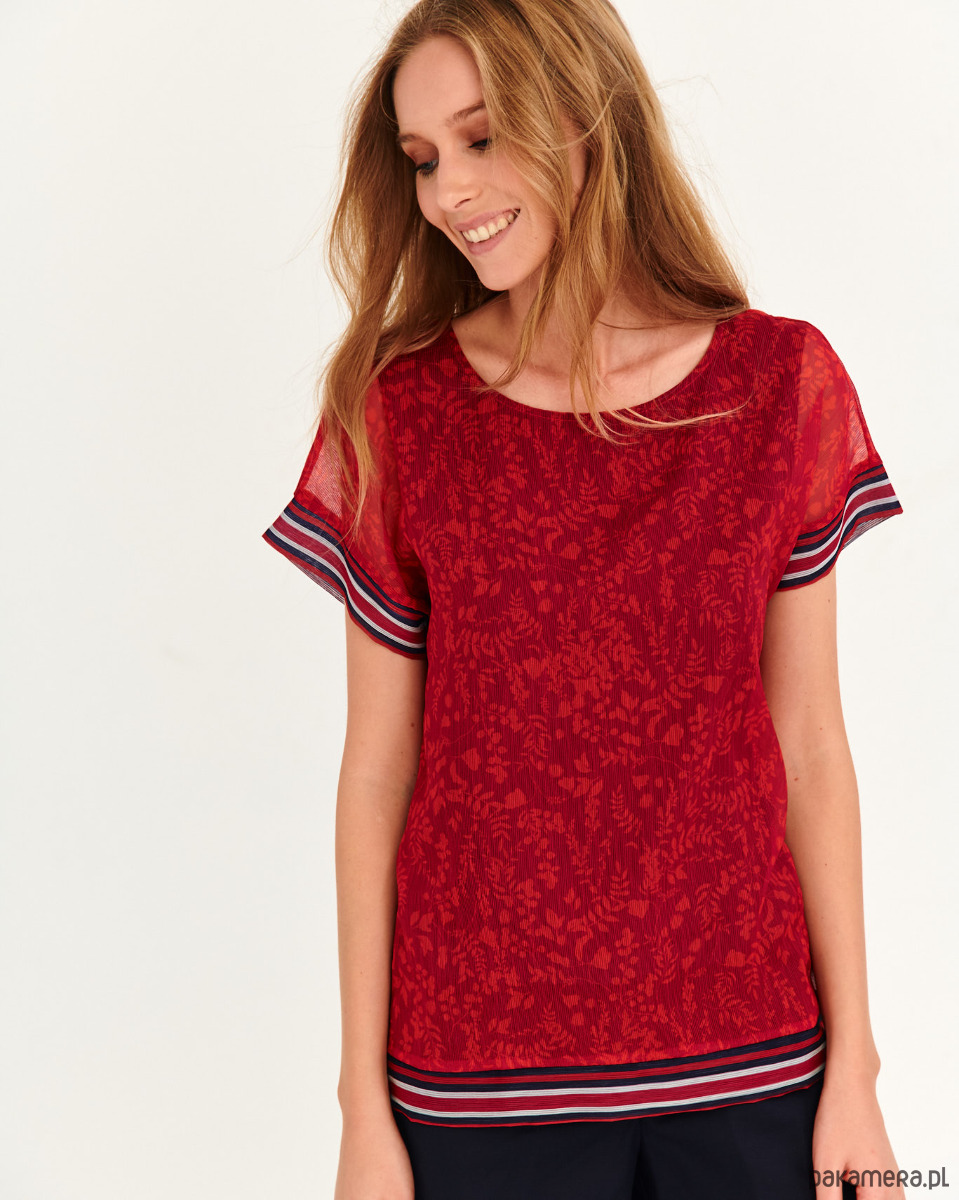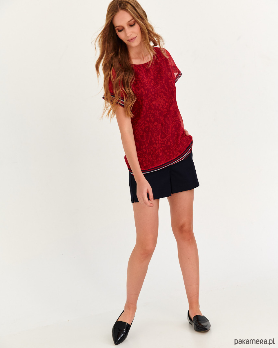 Szyfonowa bluzka . Prosty, niedopasowany krój wykończony szyfonem w paseczki . Dekolt przód okrągły i tył w literę V. Wewnątrz wiskozową koszulka. Zapina na tyle na guziczek. Ze względu na przezroczystość w środku delikatna, wiskozowa podszewka. Autorski druk w drobne kwiaty kwiaty.